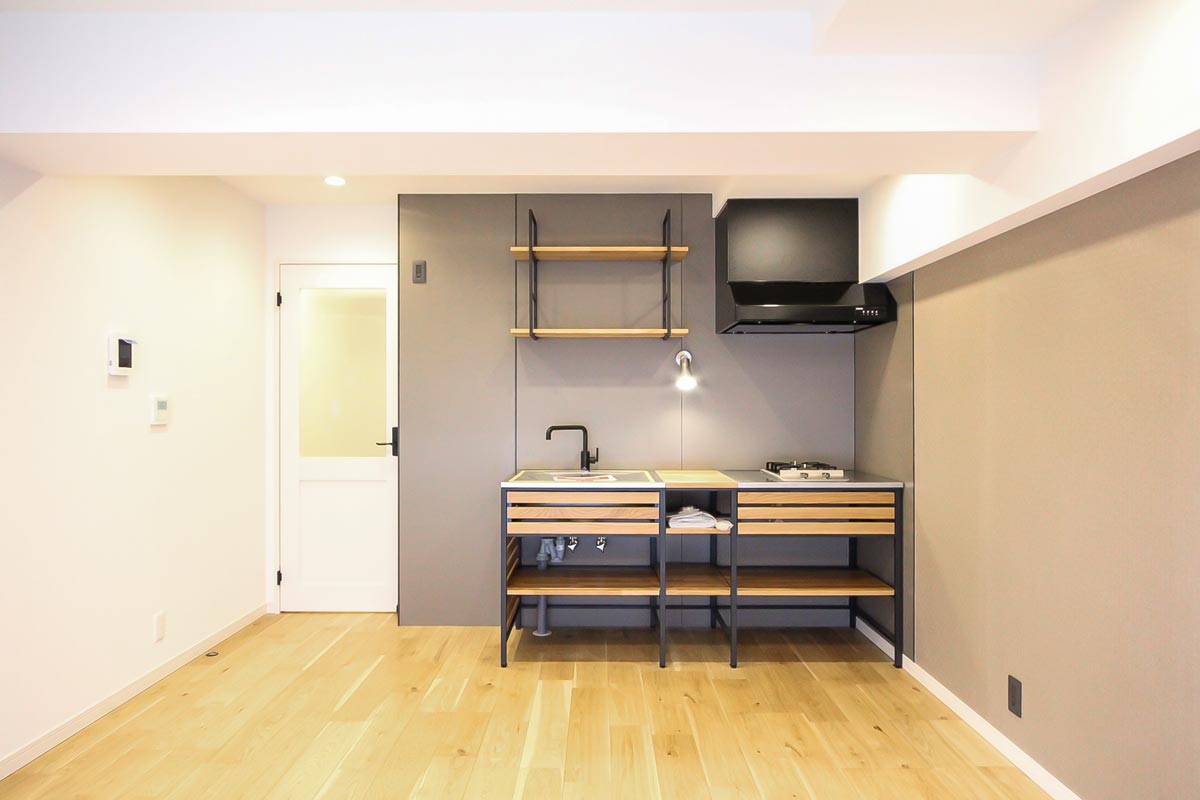お部屋は11階建ての8階部分。46.74㎡、縦長の1LDKタイプです。廊下には自由にレイアウトが可能な収納棚、キッチンはフレームキッチンを使用し、オープンでオシャレな空間となっています。
