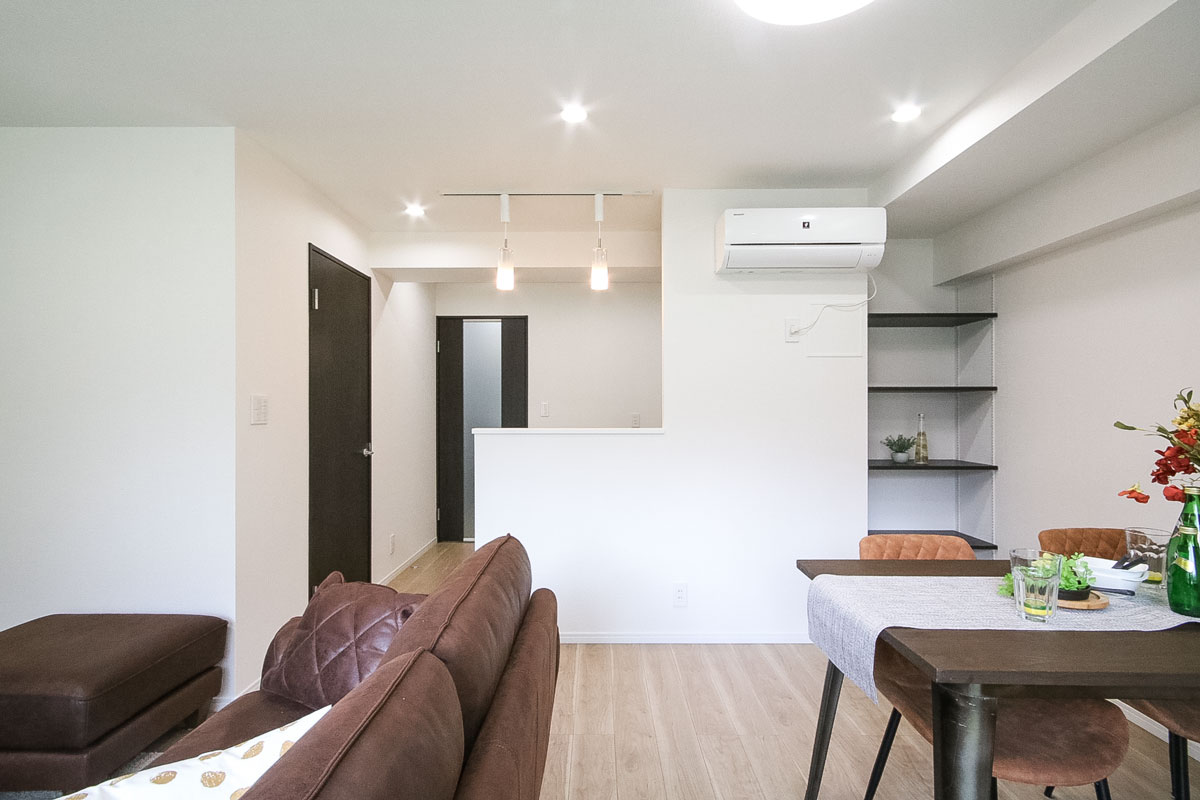 室内はリノベーション済み。広さは49.50㎡の1LDKタイプです。5.8帖の洋室にLDKが15.99帖とゆったりとした間取りでした。リビングがワイドタイプなのも、家具の配置がしやすく住みやすいと思います。