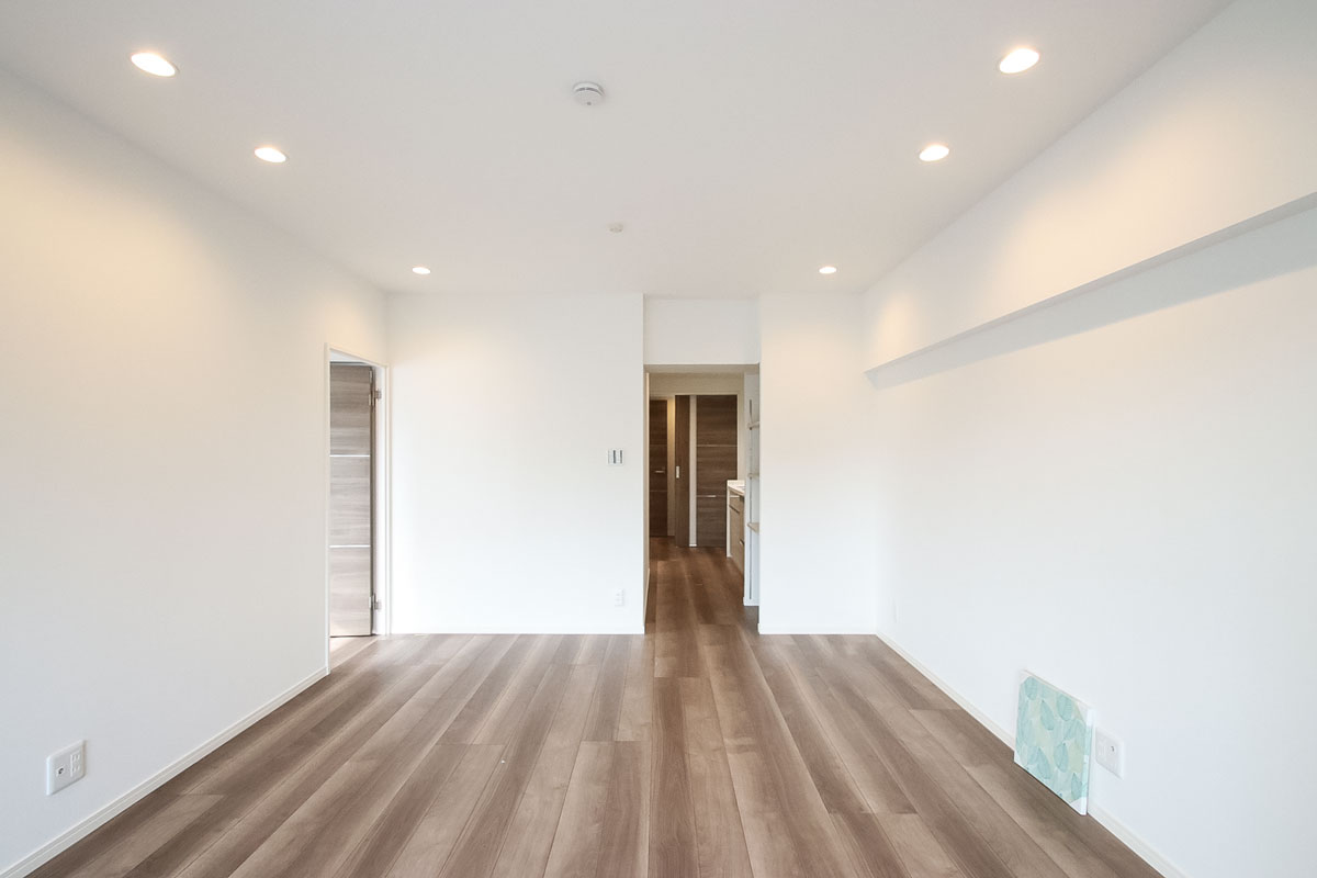 室内はリノベーション済。昨年の12月末ごろに完成したばかり。53.40㎡の広さですが、廊下部分がほとんどなく、洋室も4帖、4.0帖とコンパクトなため、LDKが14.7帖とゆったりとした造り。