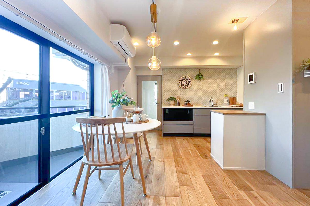 室内はリノベーション済。家具付き販売ではありませんが、ホームステージングで家具が設置されていますので、住みイメージがしやすく、全体的に木目を活かした、落ち着いた色合いの内装でした。