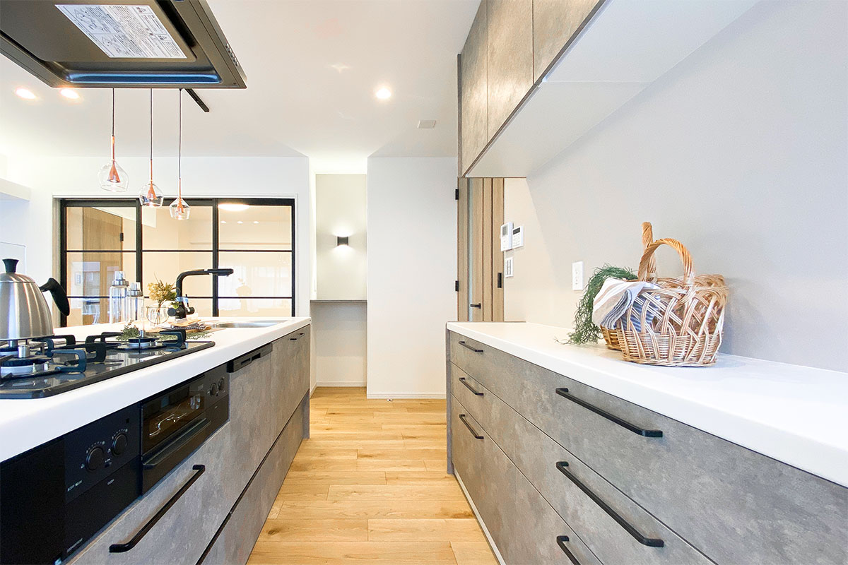 動線が確保できるアイランドキッチンは食洗機付きの3口ガスコンロで機能性も抜群。