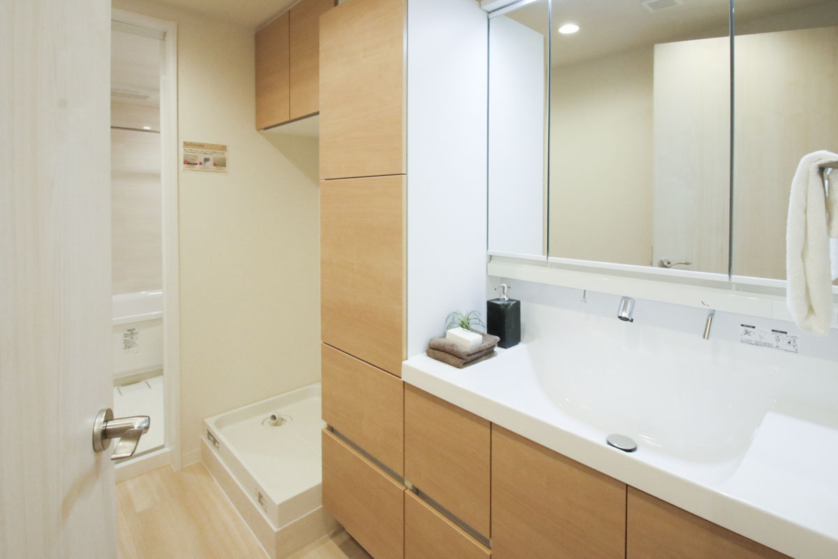 リビングの扉を開けると約19.2帖のLDK。キッチンの近くにはガラス棚取り付けられています。ゆったりとしたキッチンは独立型。システムキッチンの対面にはカップボードが設置されているのでスッキリとした見た目のまま、お料理を楽しめそうです。