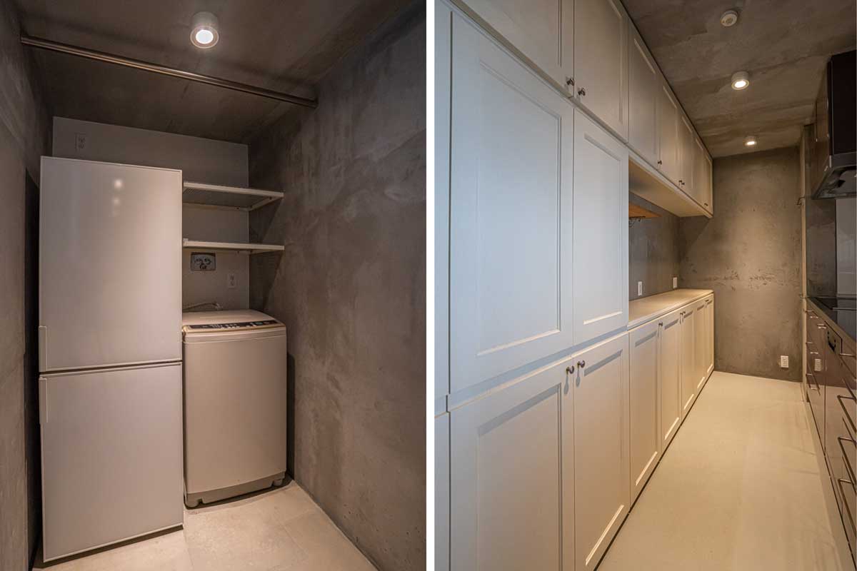外観はコンクリート打ちっぱなしのスタイリッシュな雰囲気。お部屋は1階と地下1階、メゾネットタイプの1SLDKで、リビングの白い壁の質感や、シックな色味でまとめられたワークルームとキッチン、フレンチアンティーク調の内装です。螺旋階段まわりの壁紙にもこだわりが感じられ、配置する家具にもこわだりたくなる、お洒落なお部屋です。