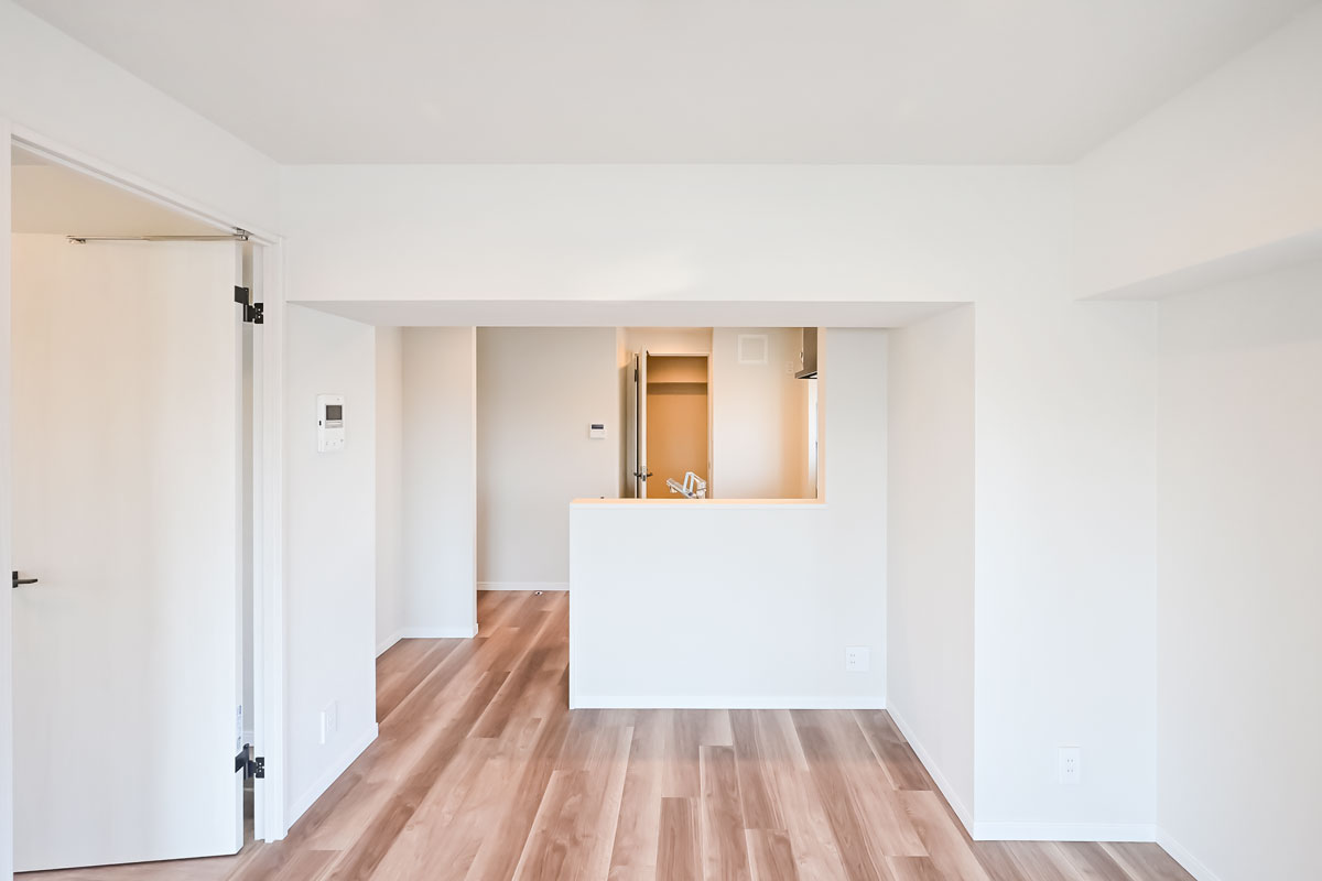 内装はフルリフォーム済みで、アフターサービス保証付きです。食洗機付きのシステムキッチンや、乾燥機能付きのユニットバスなど、便利な設備に加えて、大容量のクローゼットや物入も設置されています。キッチンの奥がサニタリーエリアになっていて、広さもしっかり取れています。生活動線も良さそうでした。