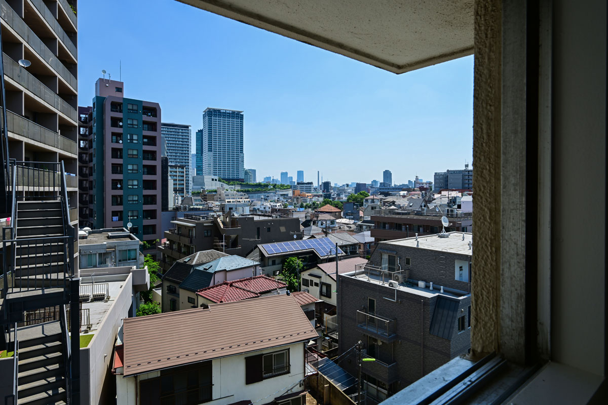 本物件は、246、首都高速道路沿いの立地です。6階の角部屋で、廊下がほとんどないむだの少ないつくりの2LDKタイプで、三面採光で日当たり、通風が良いお部屋です。すべての居室に窓があり、窓側には高いビルが少なく、眺望も開けています。キッチンの窓からも渋谷のビル群を眺めることができ、都心が近いことを実感しました。
