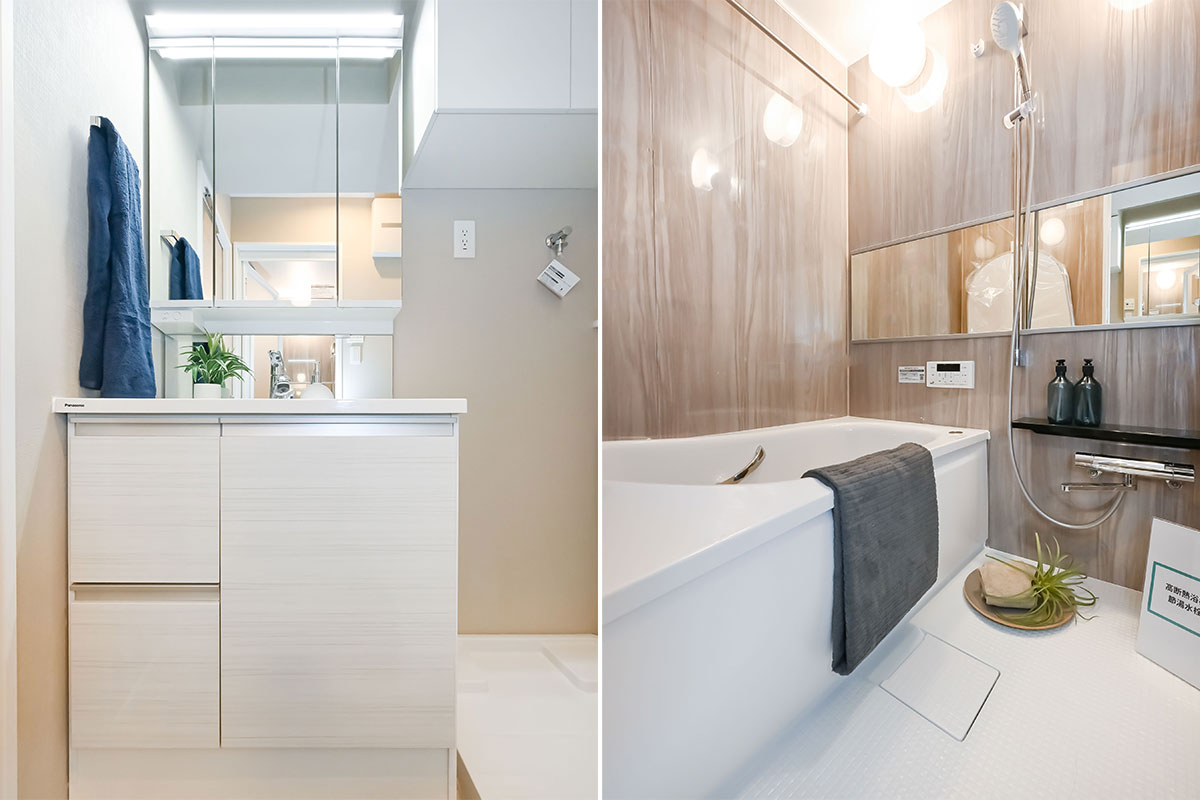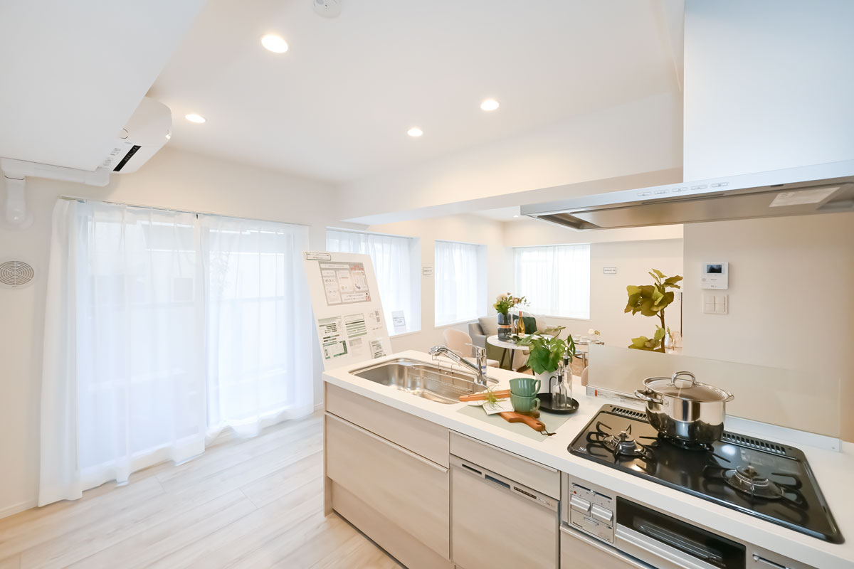 食洗器や、追炊き・乾燥機能付きのユニットバスなど、便利な設備も揃っています。洋室の大型クローゼットや、キッチンのパントリー、廊下の物入れなど、収納スペースもしっかり確保されていました。