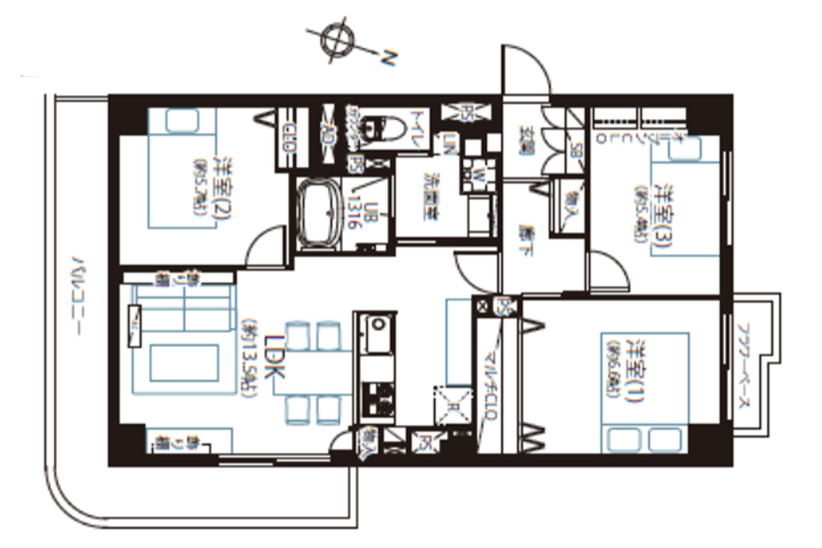 3LDKの間取りで、全居室に5帖以上の広さがあり、それぞれゆったりと寛ぐことができる居住空間を確保しています。