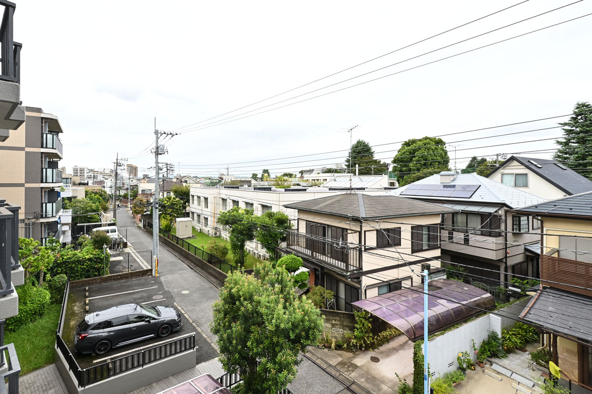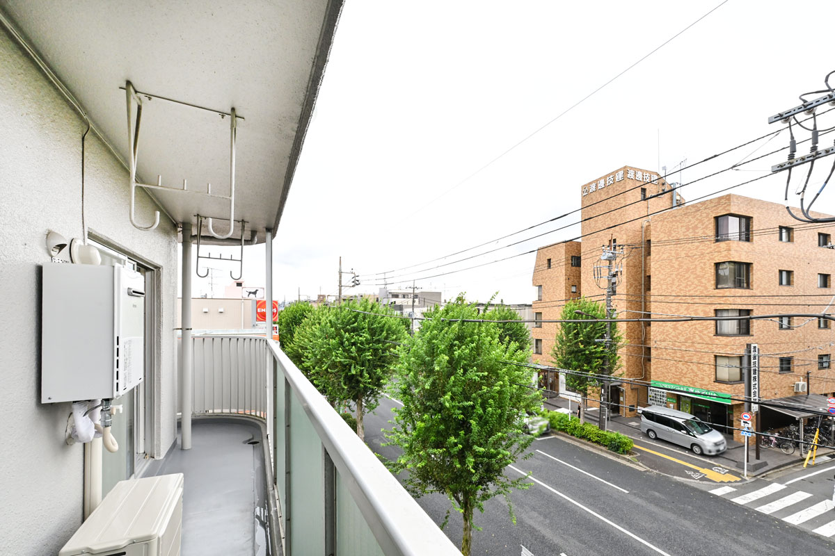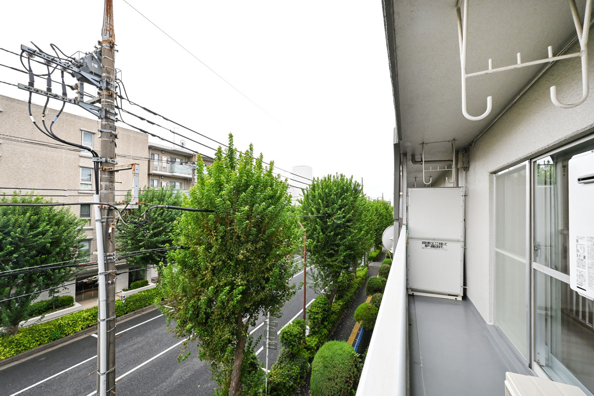 バルコニーは方南通りに面していますが、インナーサッシが設置されていますので、車の走行音はかなり軽減されています。街路樹を眺めることができ、癒し、目隠し効果も十分です。