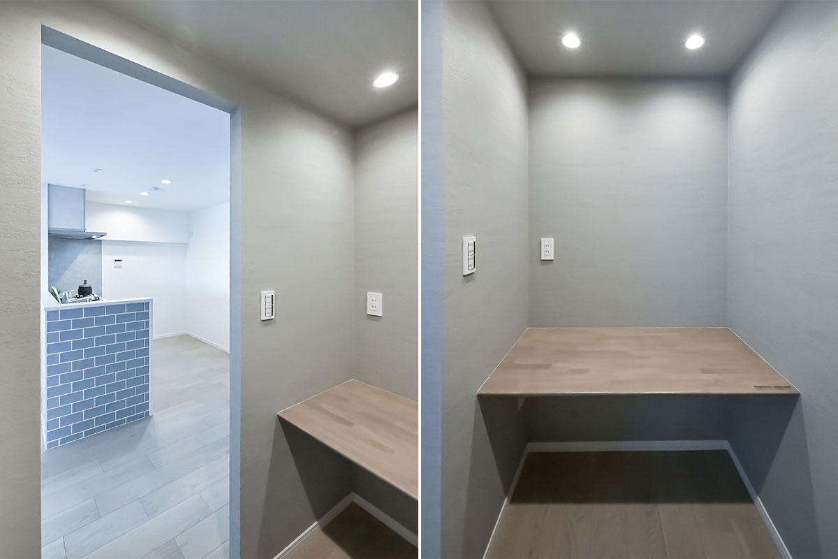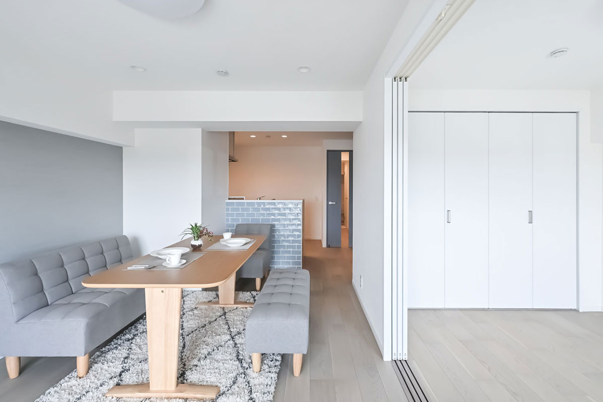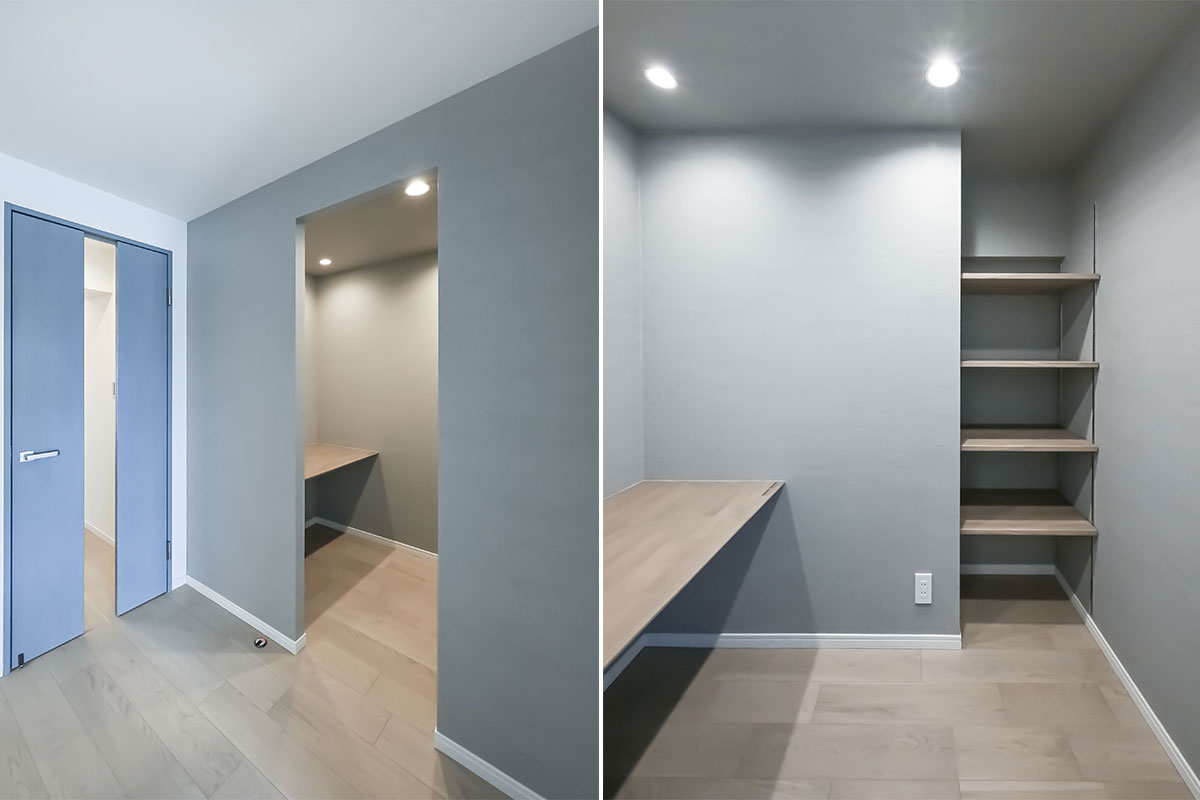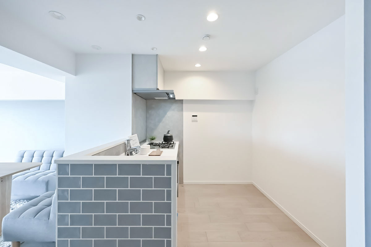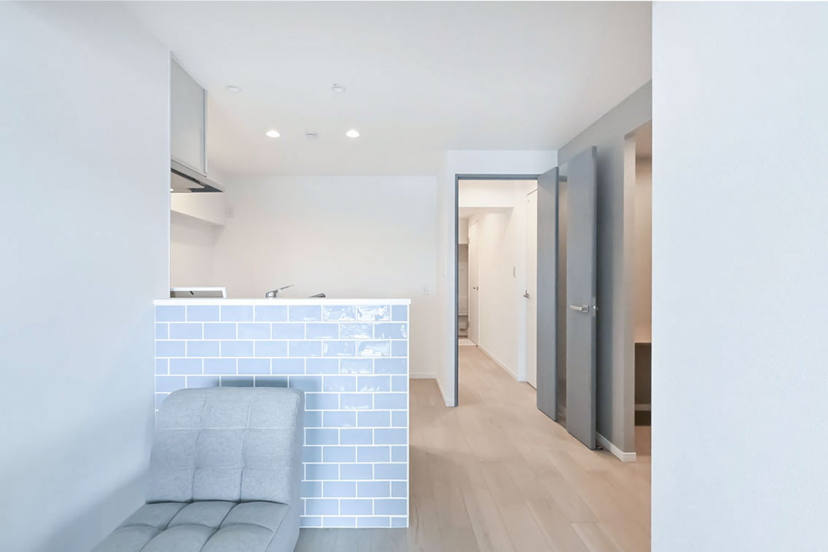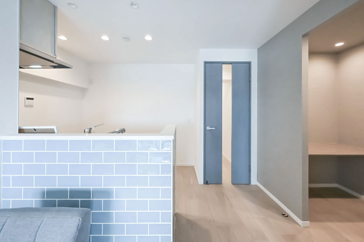 2LDKの室内は、外観とリンクしたブルーやグレーをアクセントカラーに使い、スタイリッシュで落ち着いた雰囲気。独立したワークスペースも嬉しいポイントです。