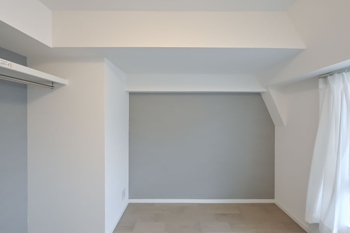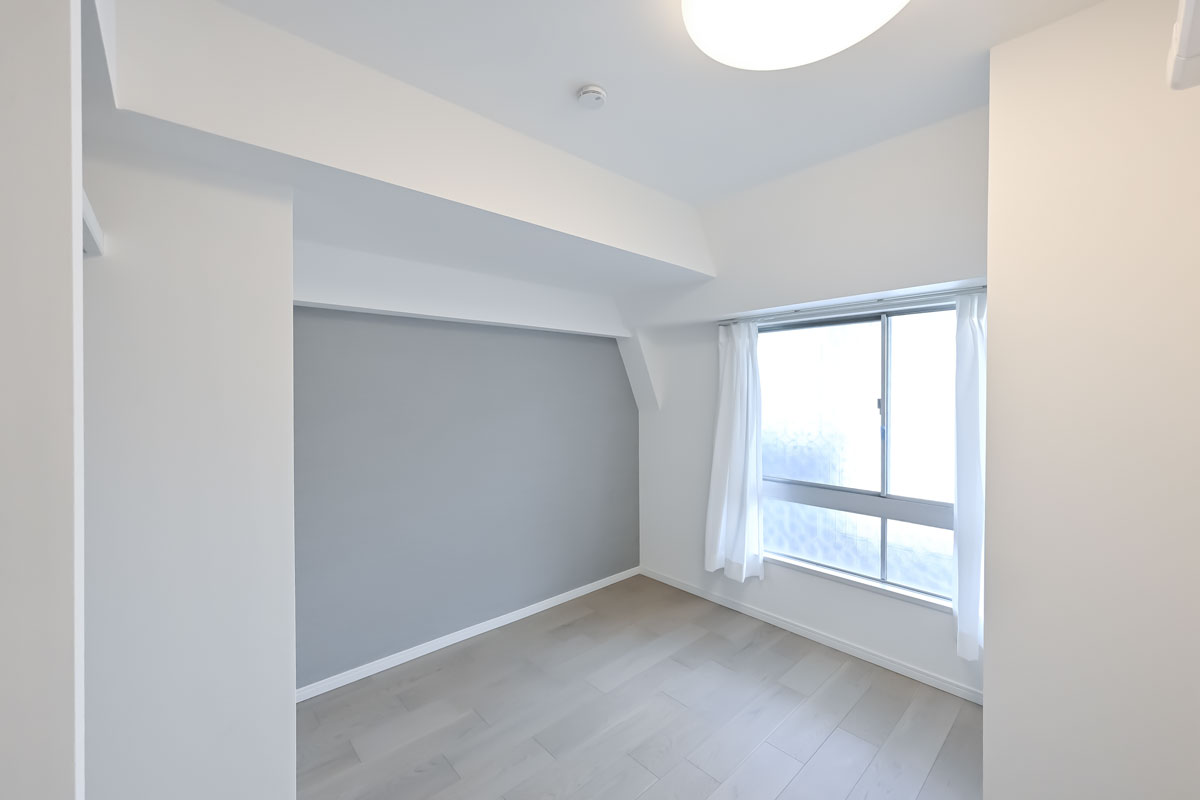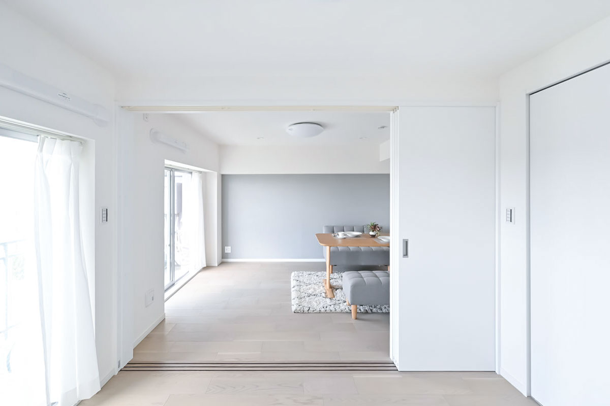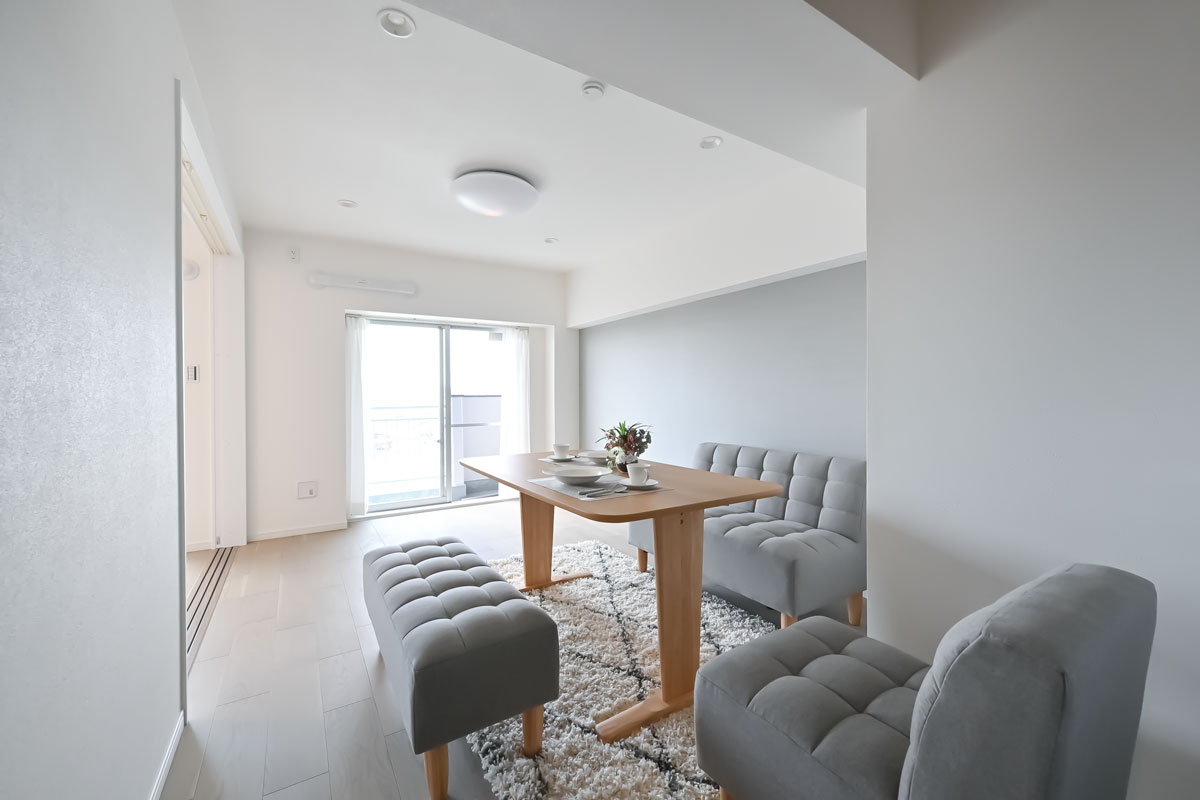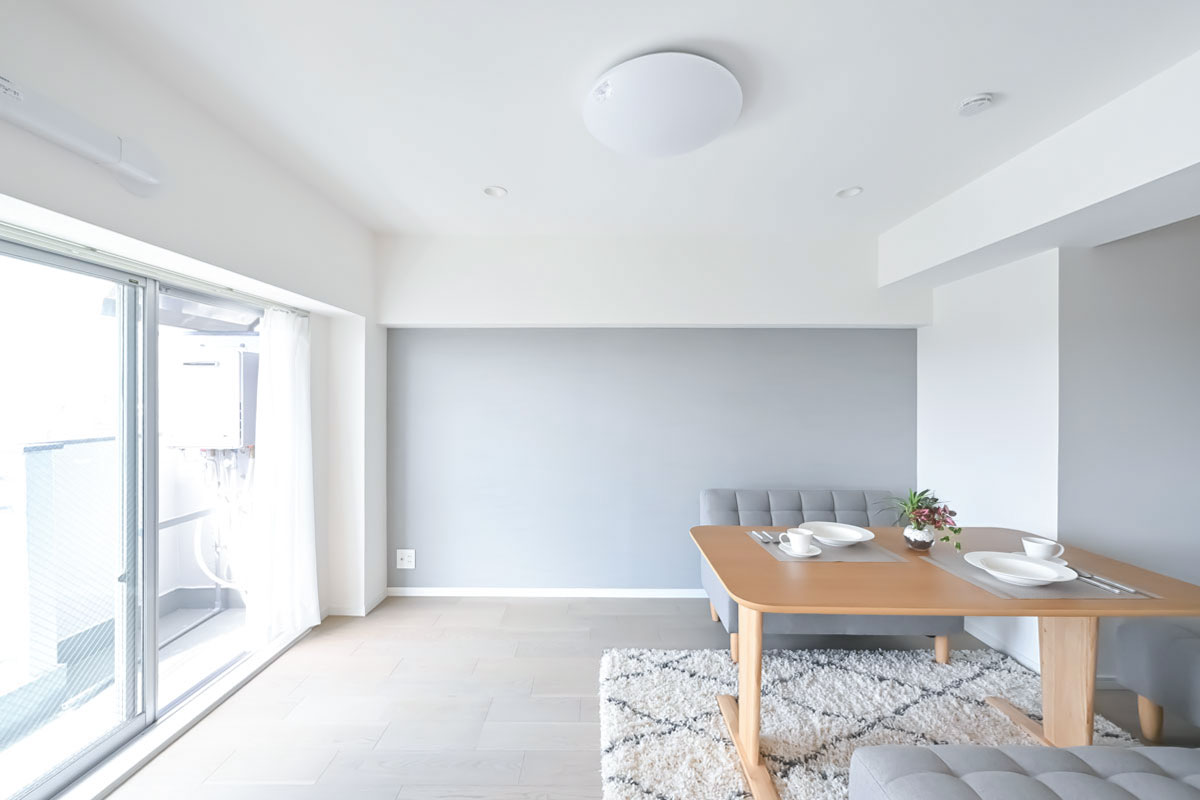 2LDKの室内は、外観とリンクしたブルーやグレーをアクセントカラーに使い、スタイリッシュで落ち着いた雰囲気。独立したワークスペースも嬉しいポイントです。