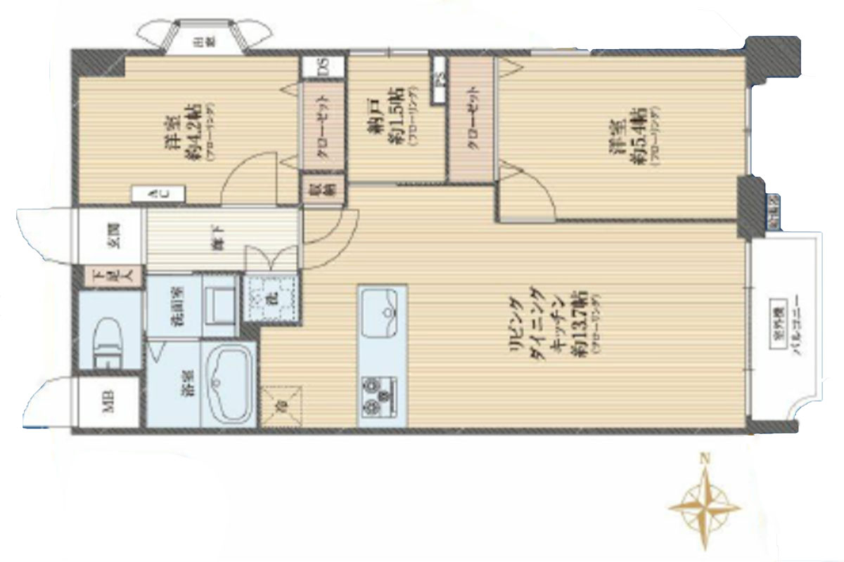約14帖のLDK、2つの洋室のほかに、約1.5帖の納戸という間取りです。ランドリースペースは廊下に設置。生活しやすい動線になっていて、生活空間にゆとりがあります。