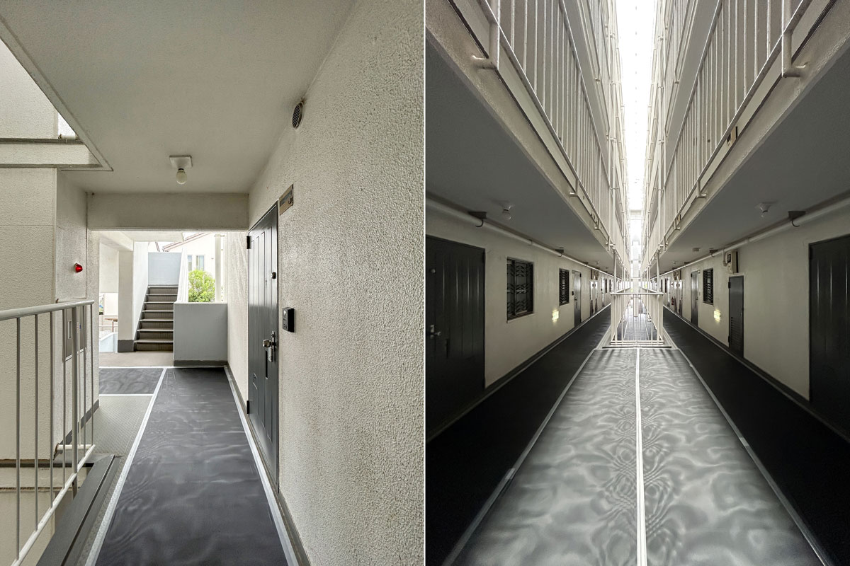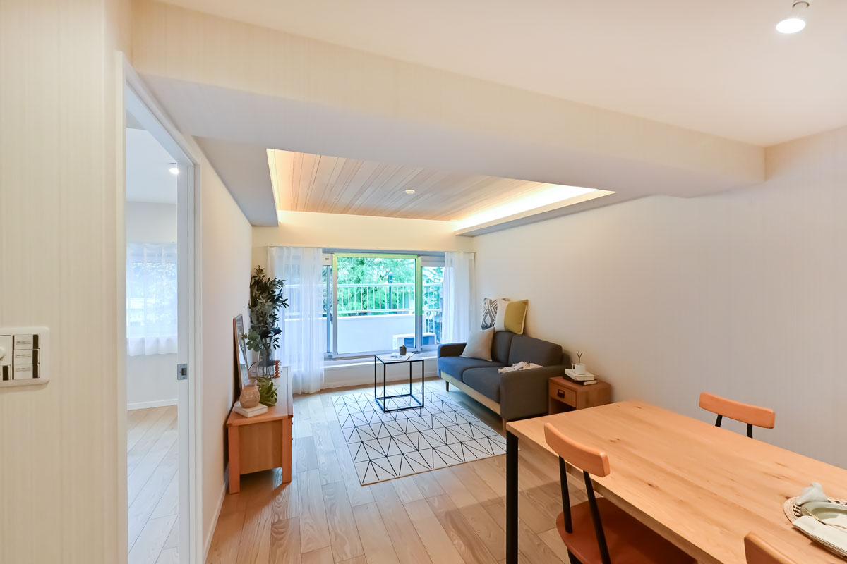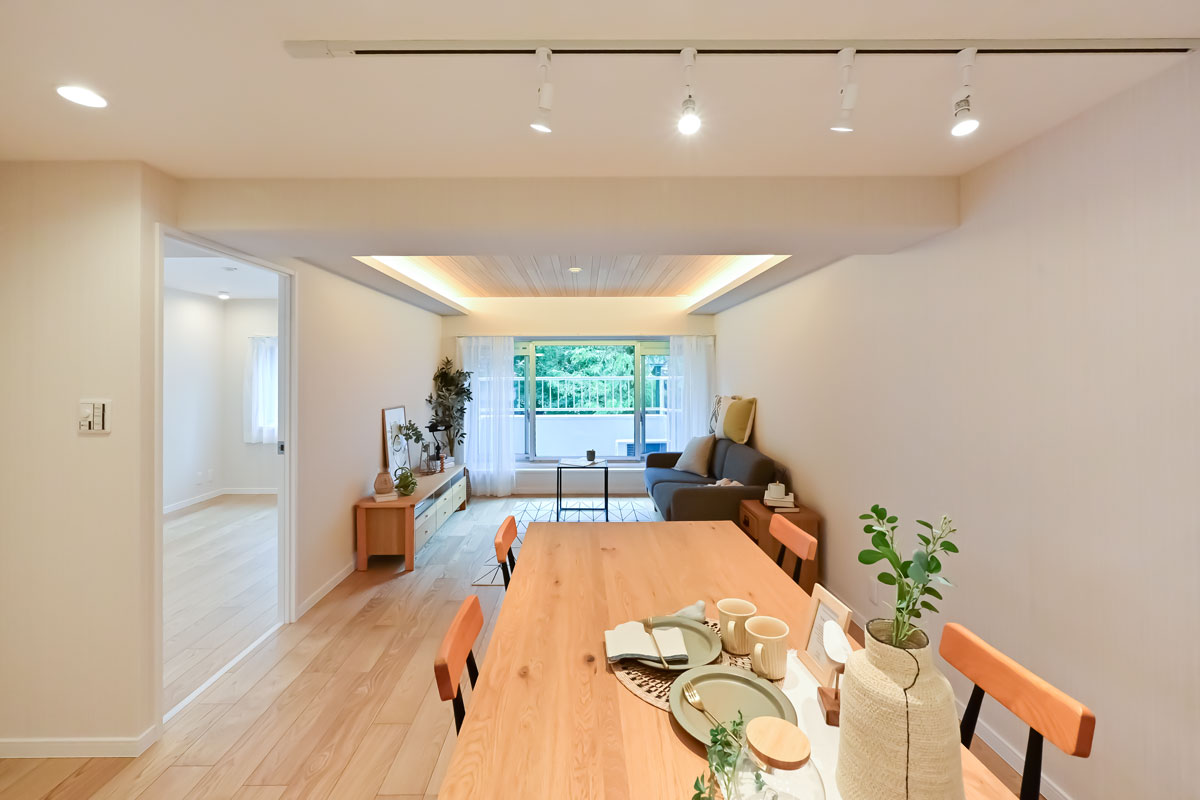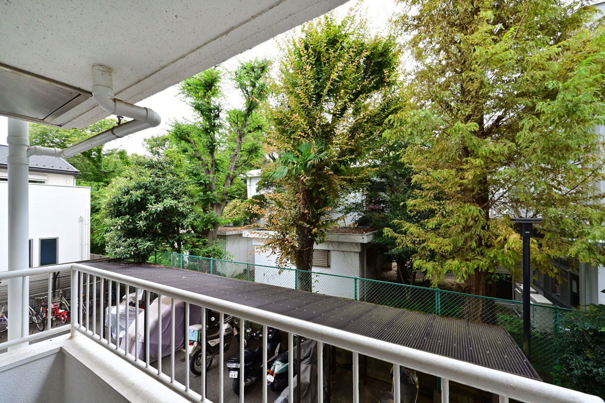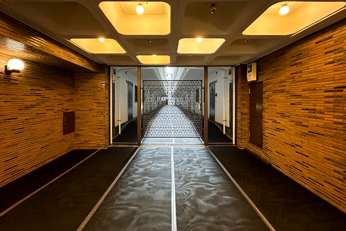 マンションは1976年築、現在は修繕工事が行われています。こちらの物件には何度か伺っていますが、白い外壁に植栽の緑が映える洗練された建物で、意匠を凝らした吹き抜けや内廊下も素敵です。完工がとても楽しみです。