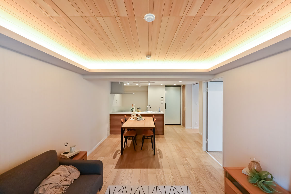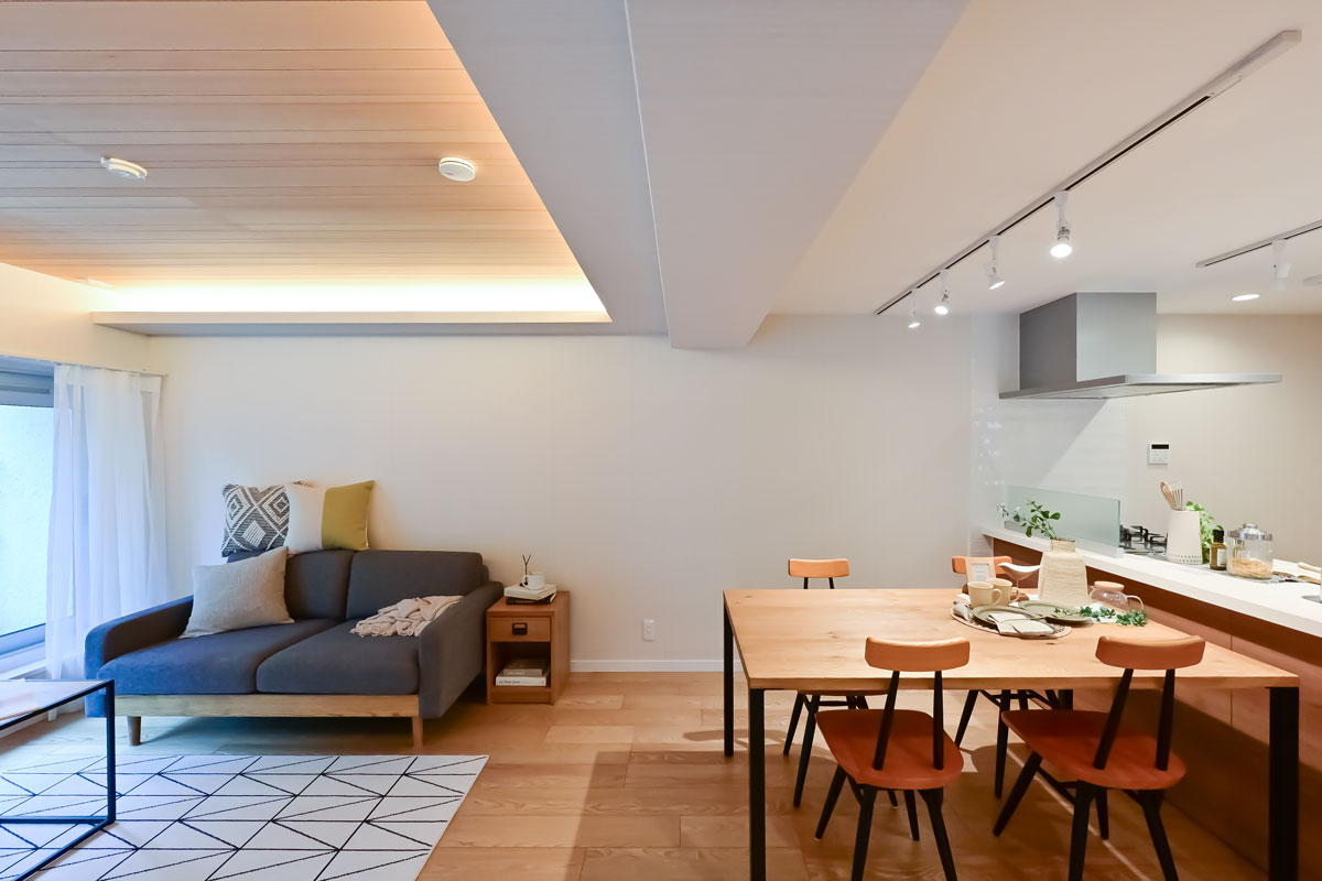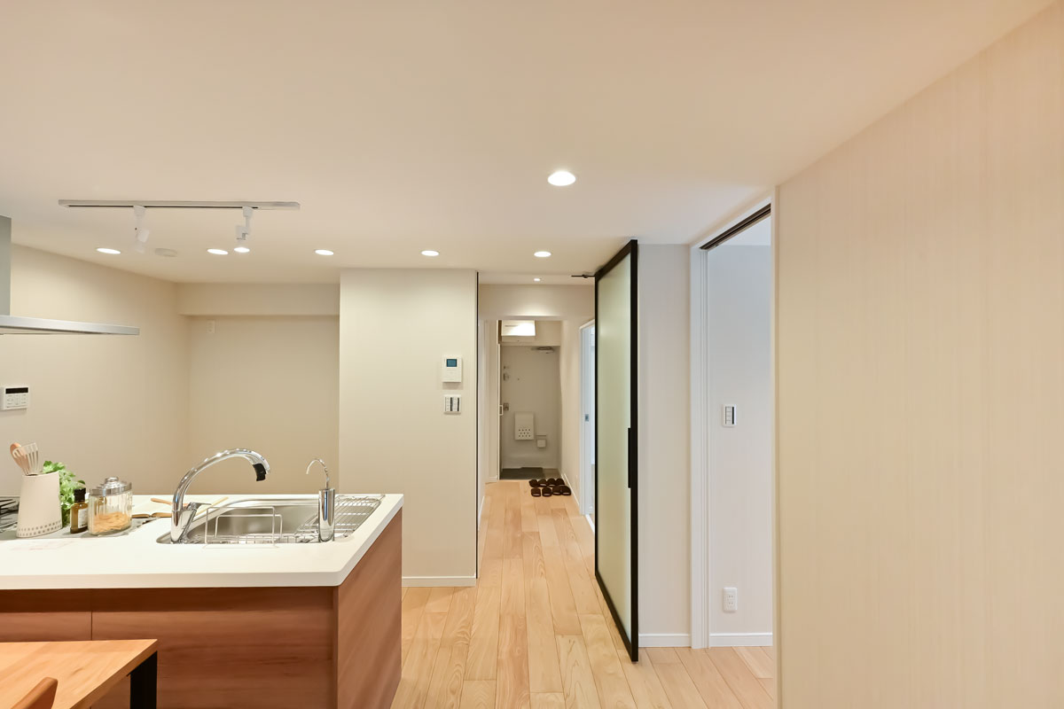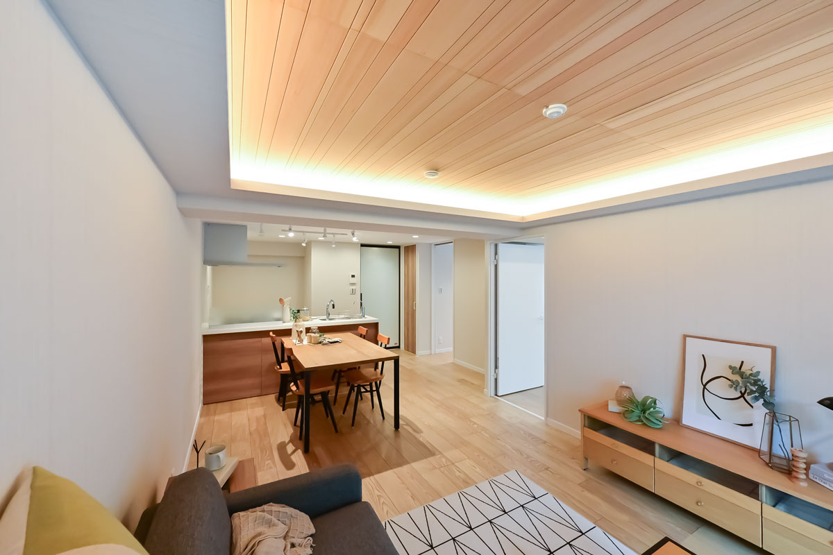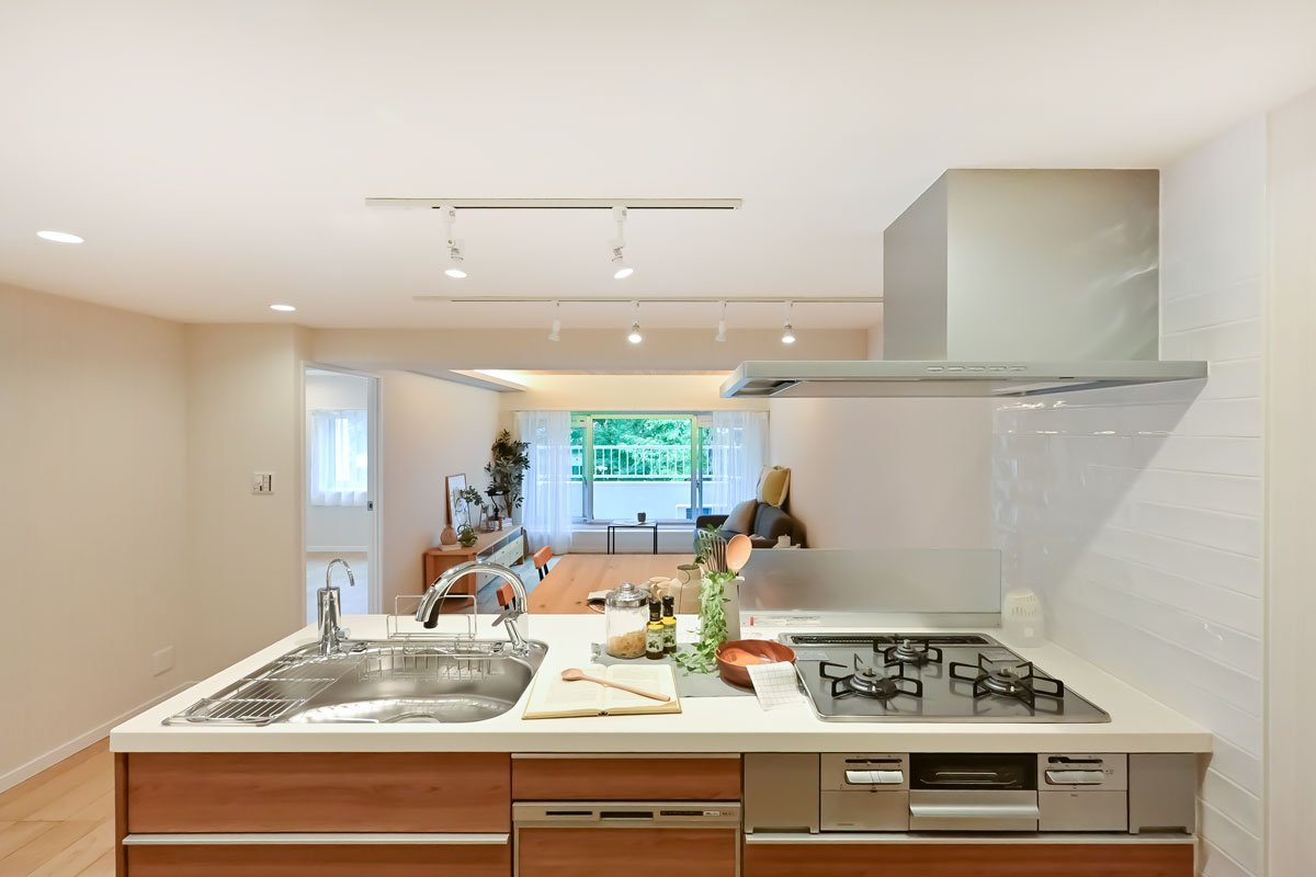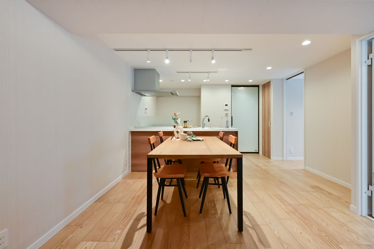 マンションは1976年築、現在は修繕工事が行われています。こちらの物件には何度か伺っていますが、白い外壁に植栽の緑が映える洗練された建物で、意匠を凝らした吹き抜けや内廊下も素敵です。完工がとても楽しみです。