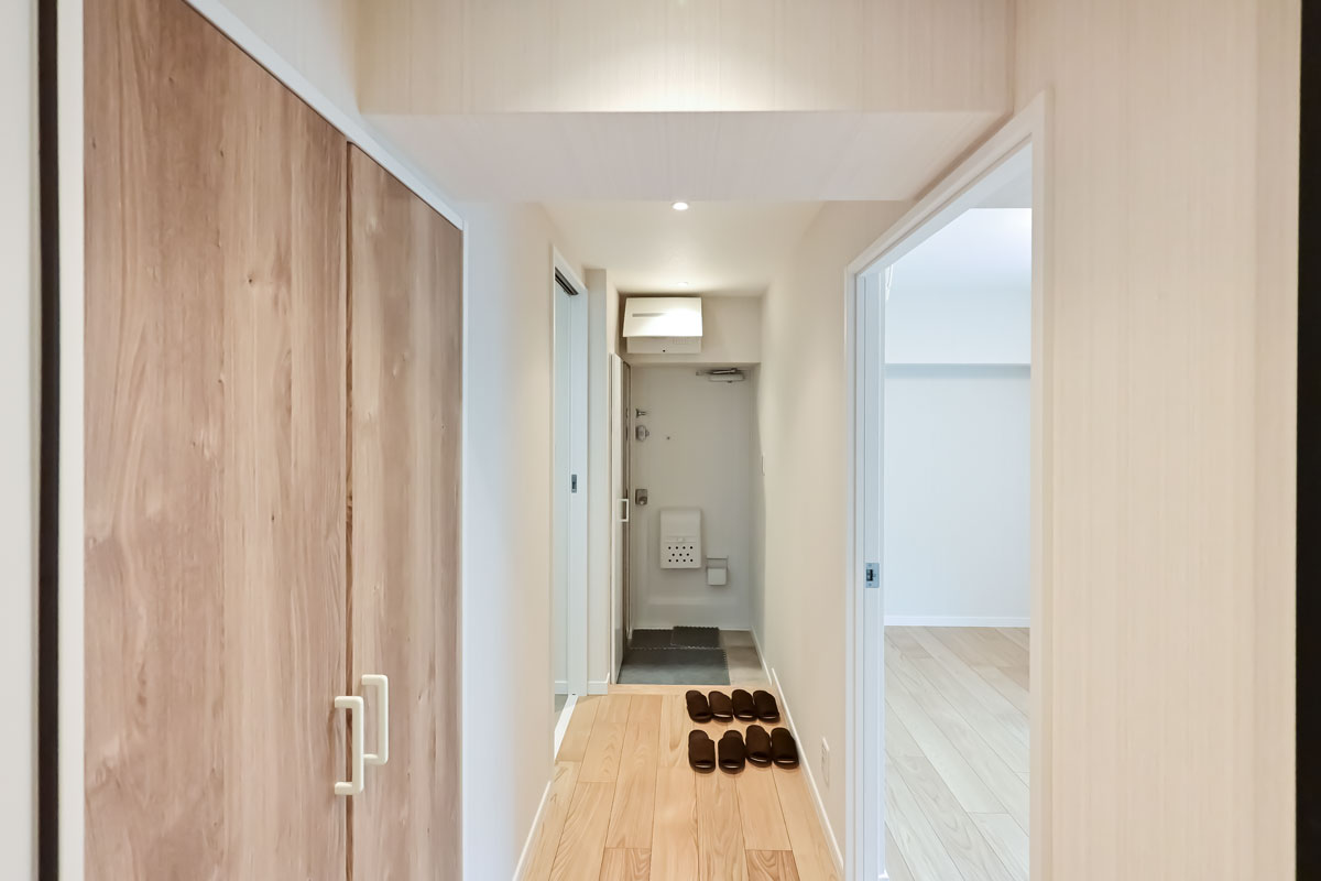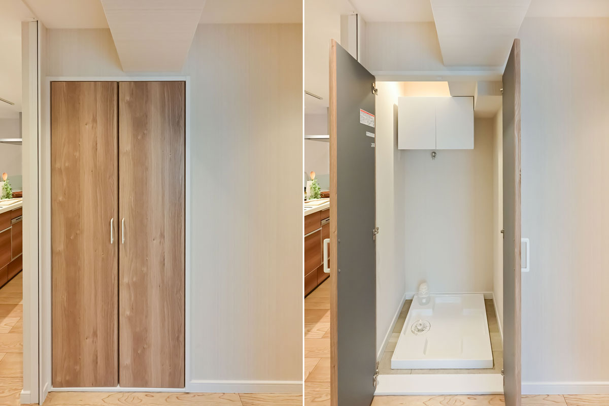 約14帖のLDK、2つの洋室のほかに、約1.5帖の納戸という間取りです。ランドリースペースは廊下に設置。生活しやすい動線になっていて、生活空間にゆとりがあります。