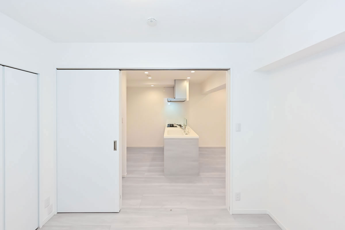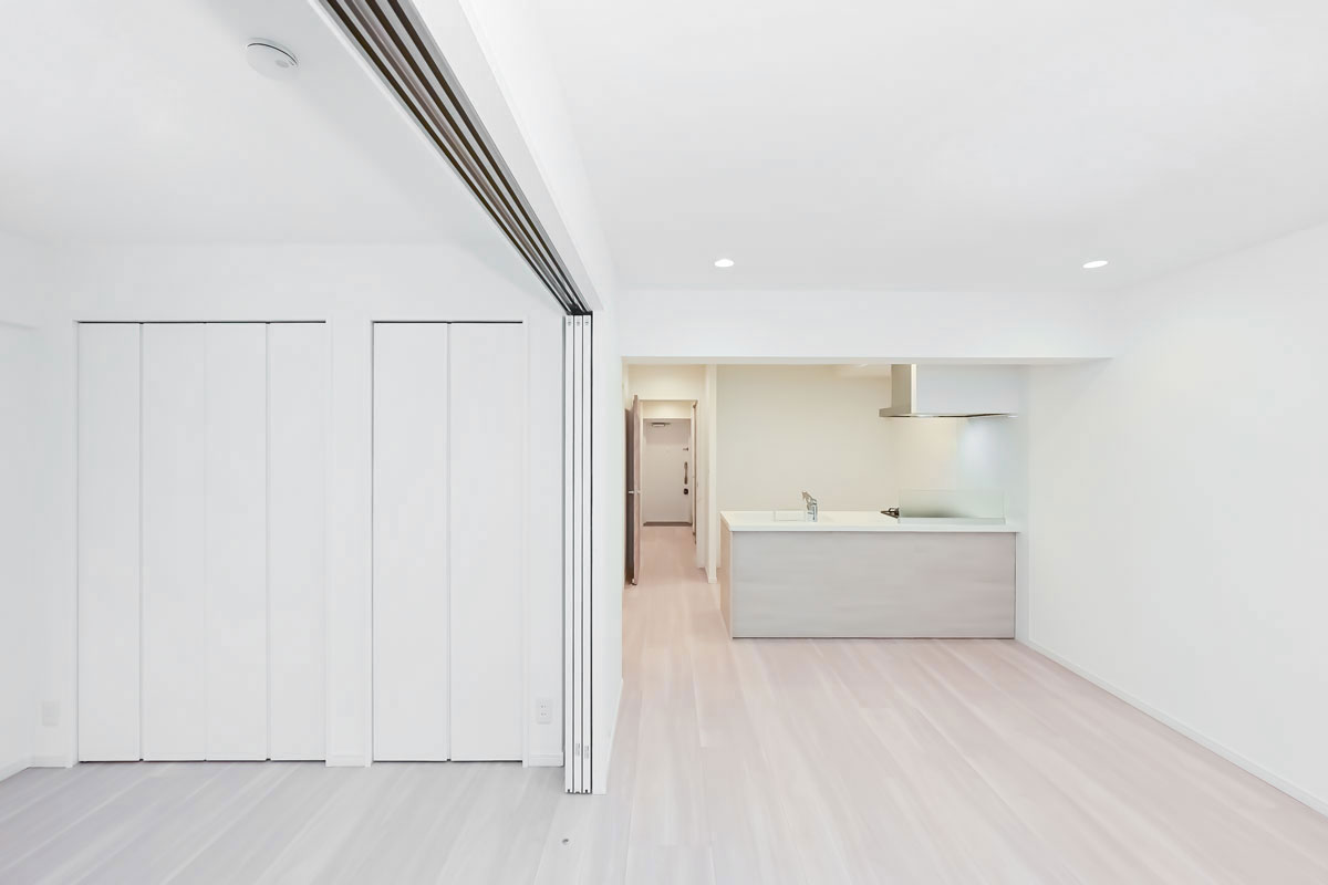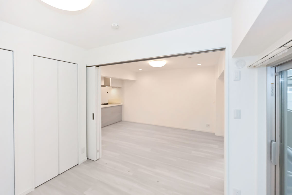 ご紹介するお部屋は2階、間取りは3LDK。スライドドアを開けて、広々とした2LDKとして利用することもできます。
