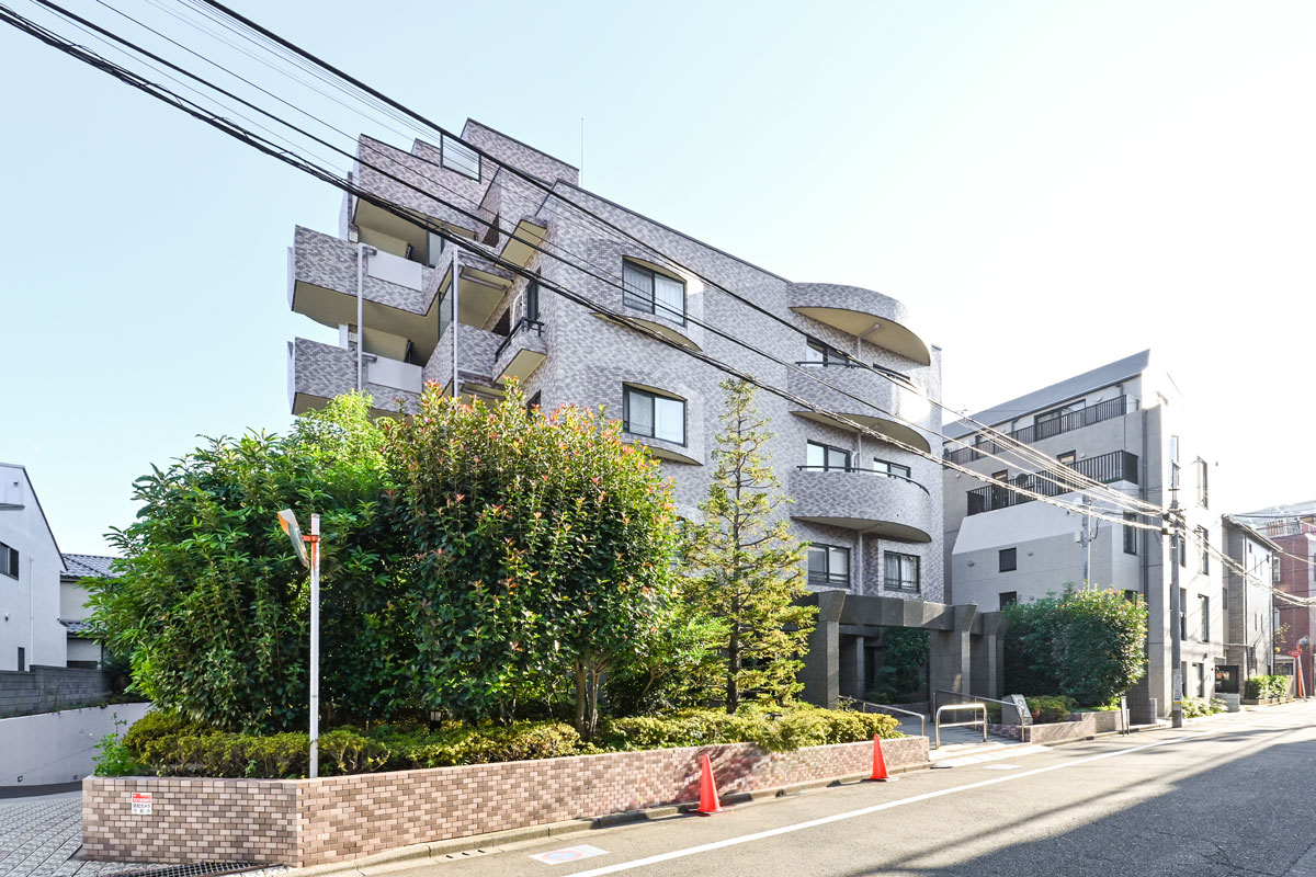 タイル張りの外壁や、エントランスとバルコニーの丸みを帯びたフォルムは可愛い雰囲気もあります。植栽のグリーンが映え、周囲の世田谷らしい趣のある街並みにもよく調和しています。