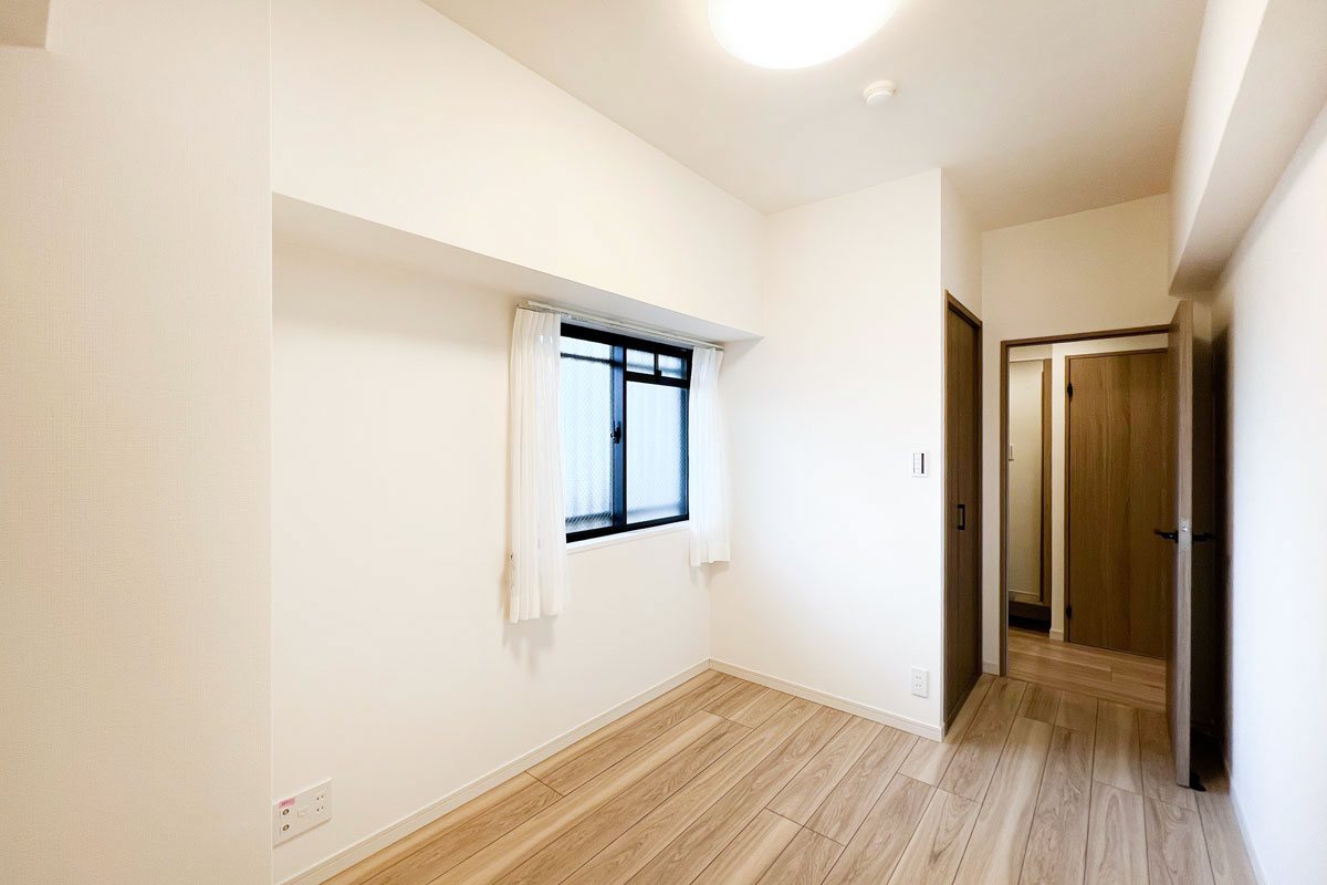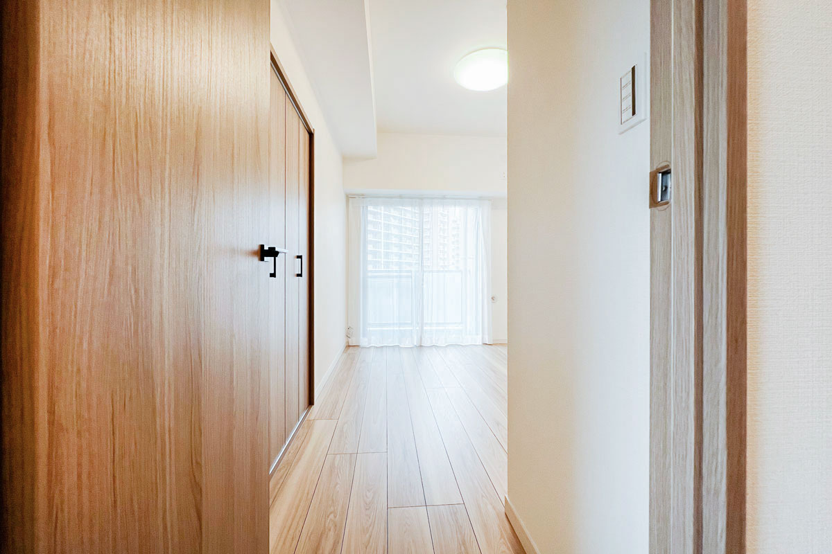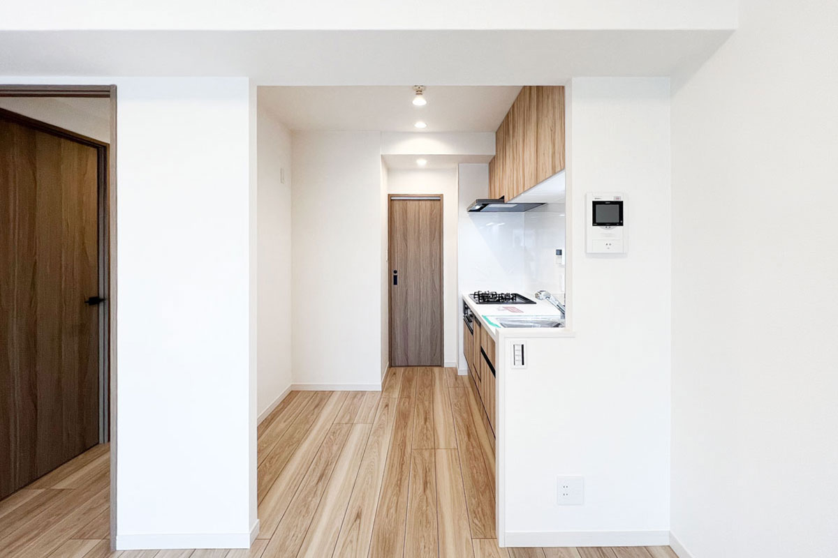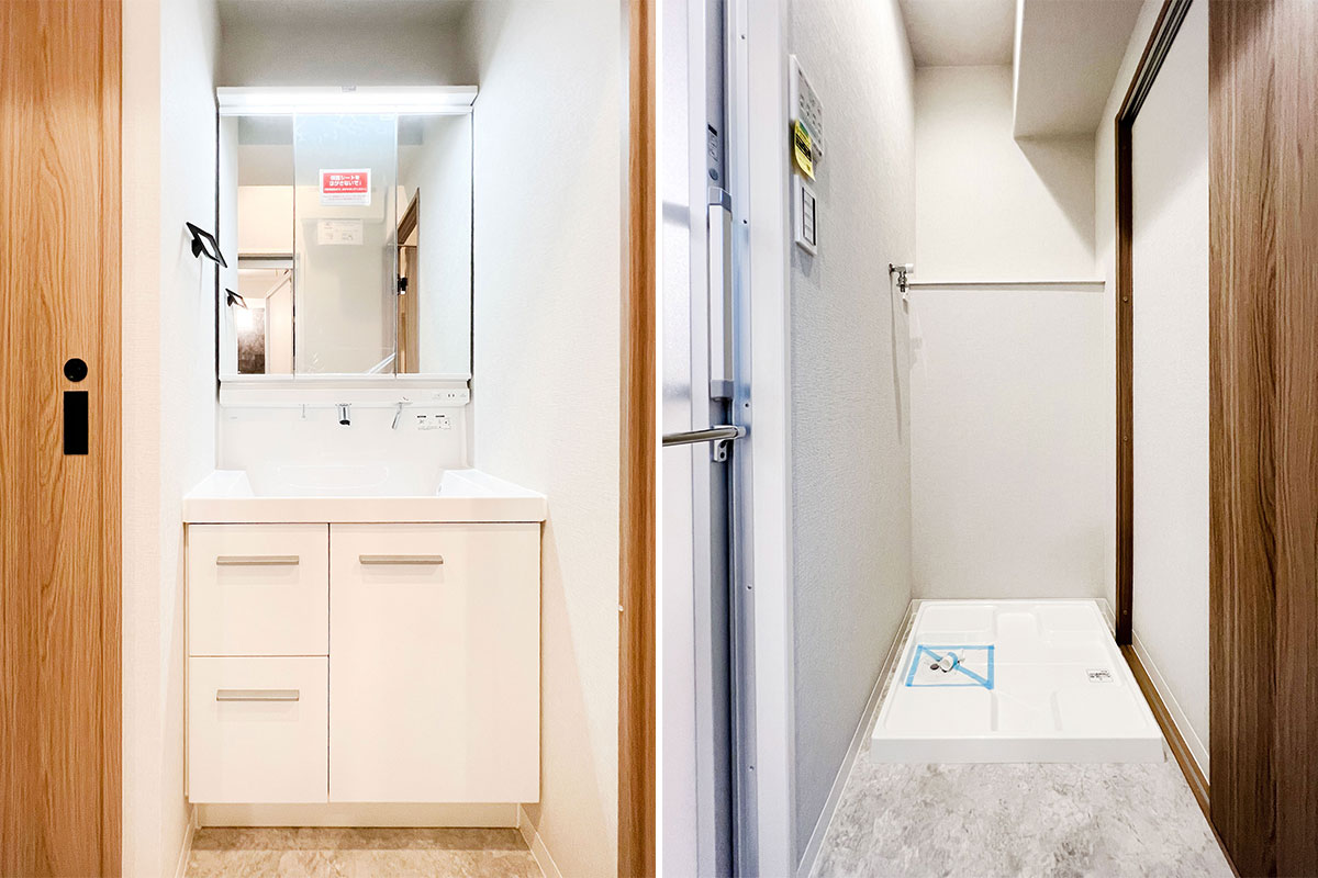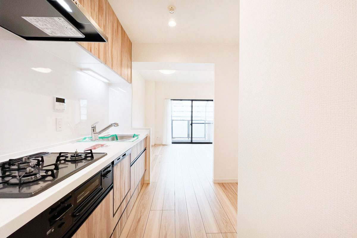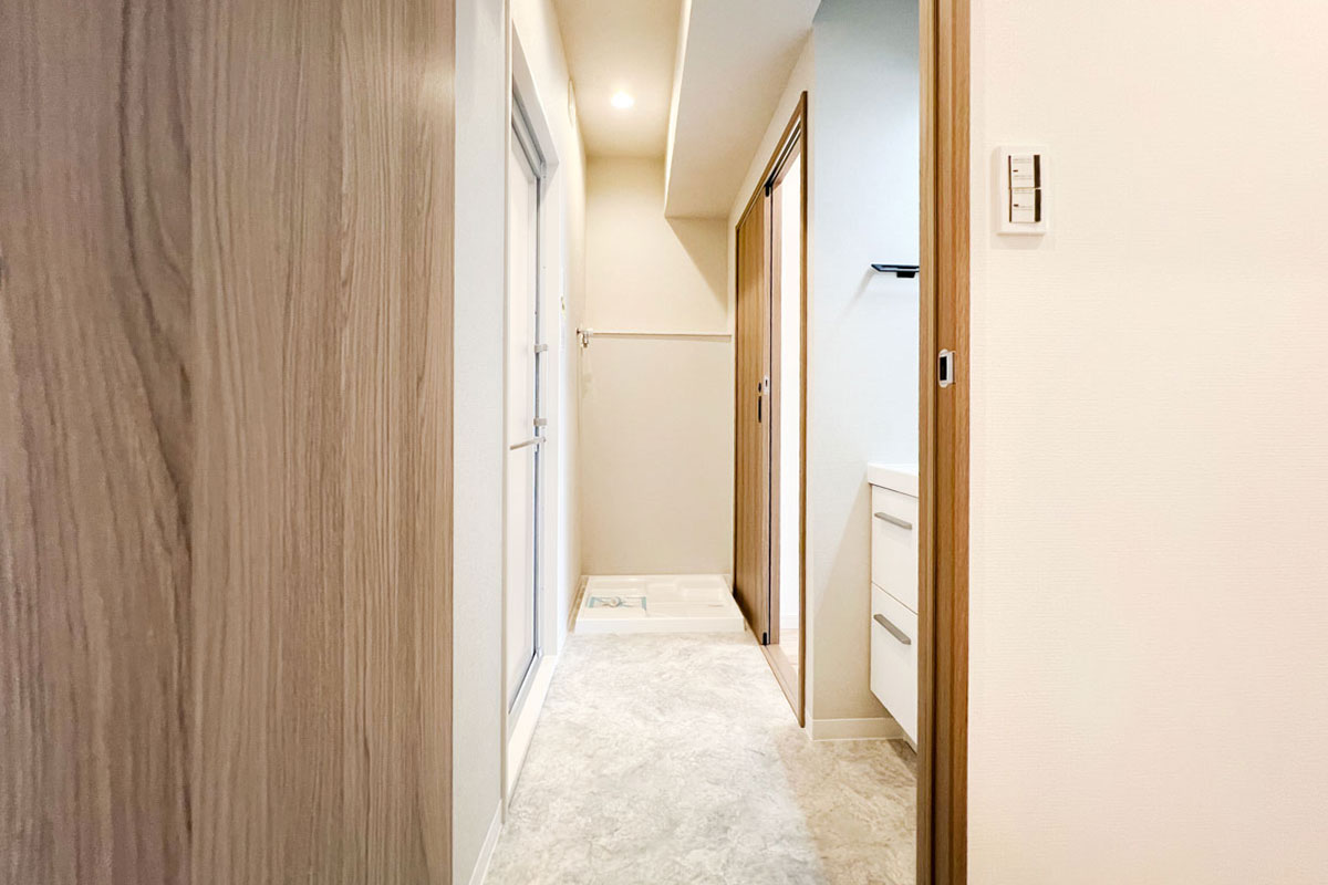 室内は2025年8月にリノベーション済。玄関を入って右に洋室、左に水回り、洗面室とキッチンはつながっていて家事がはかどりそうです。キッチンスペースは広々としているので、冷蔵庫やパントリー棚をゆったり置けそうです。食洗器、浄水器、追い焚き機能、浴室乾燥機、など設備も充実していました。洋室すべてに窓があるため風の通りが気持ち良く感じられました。