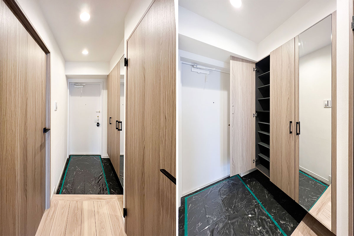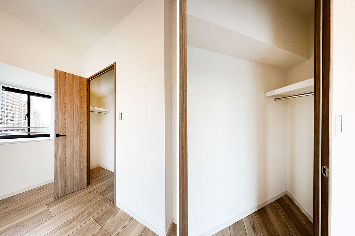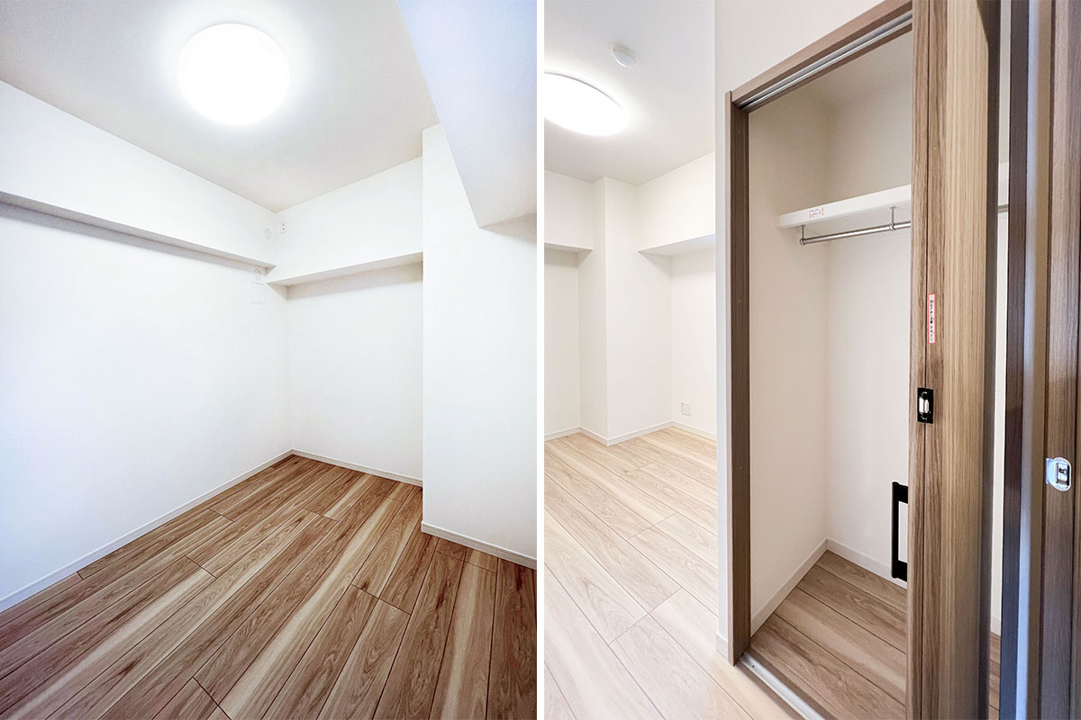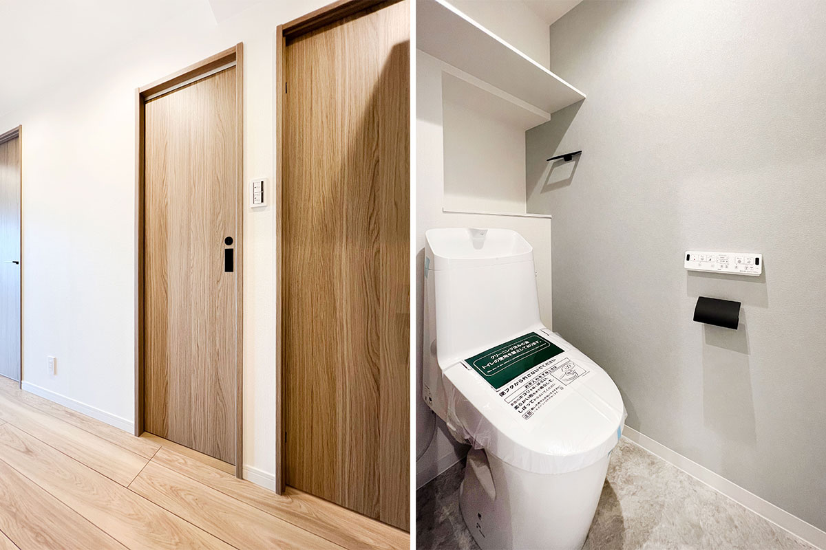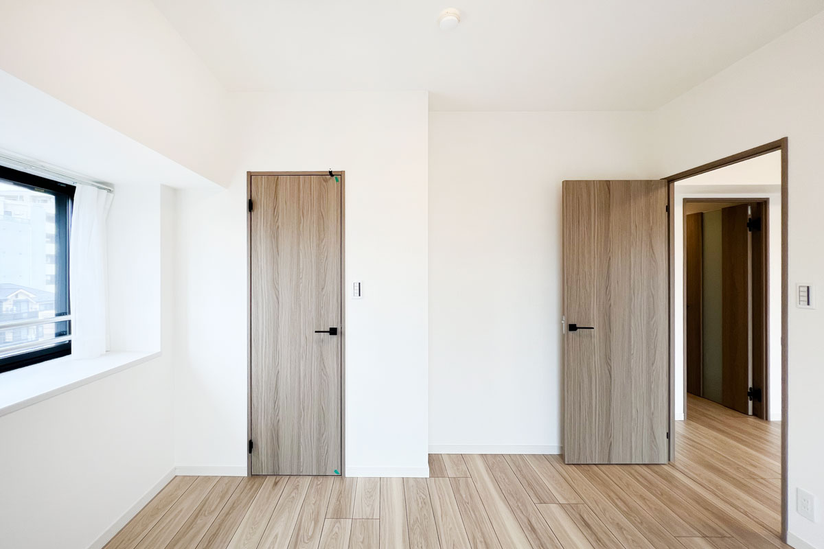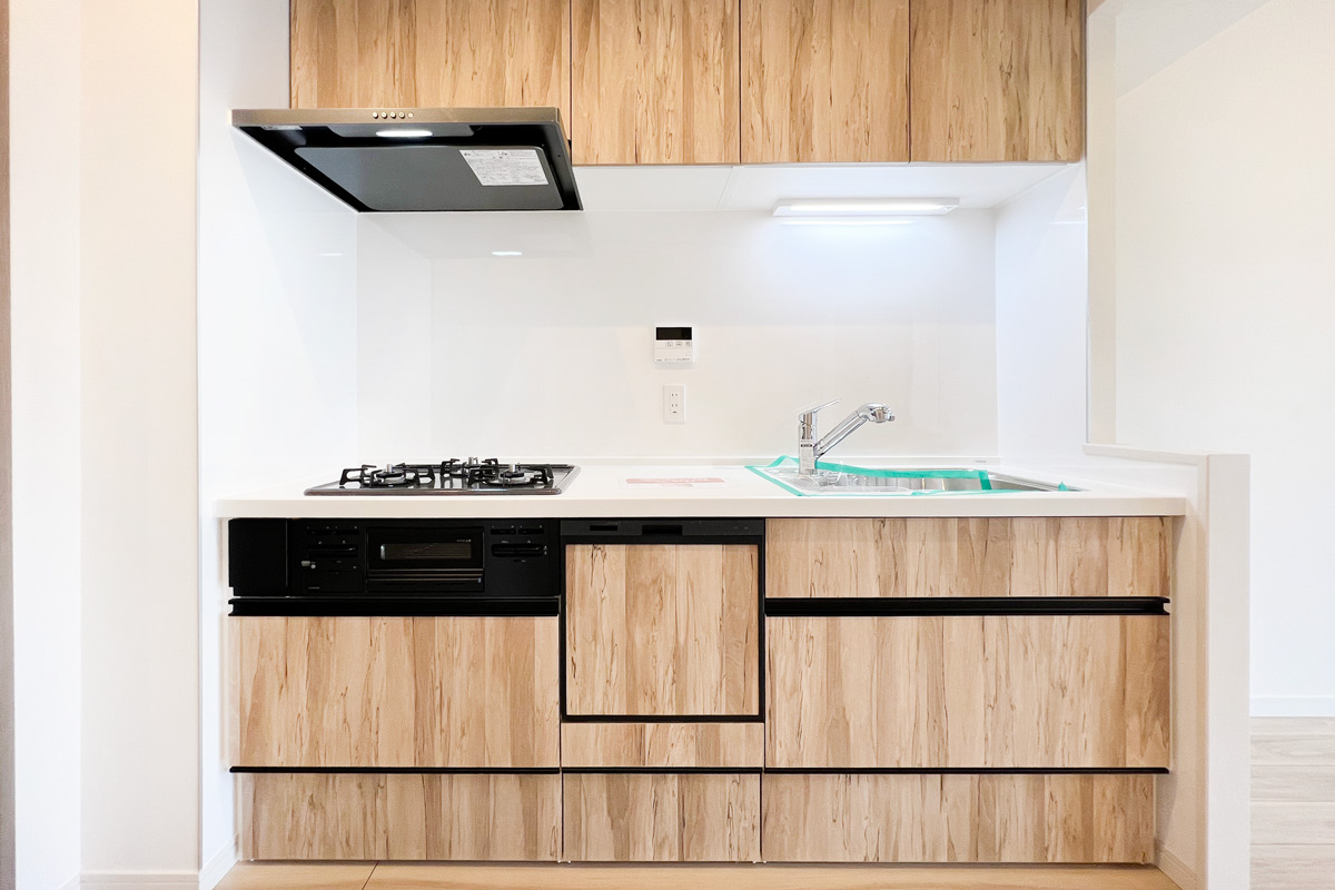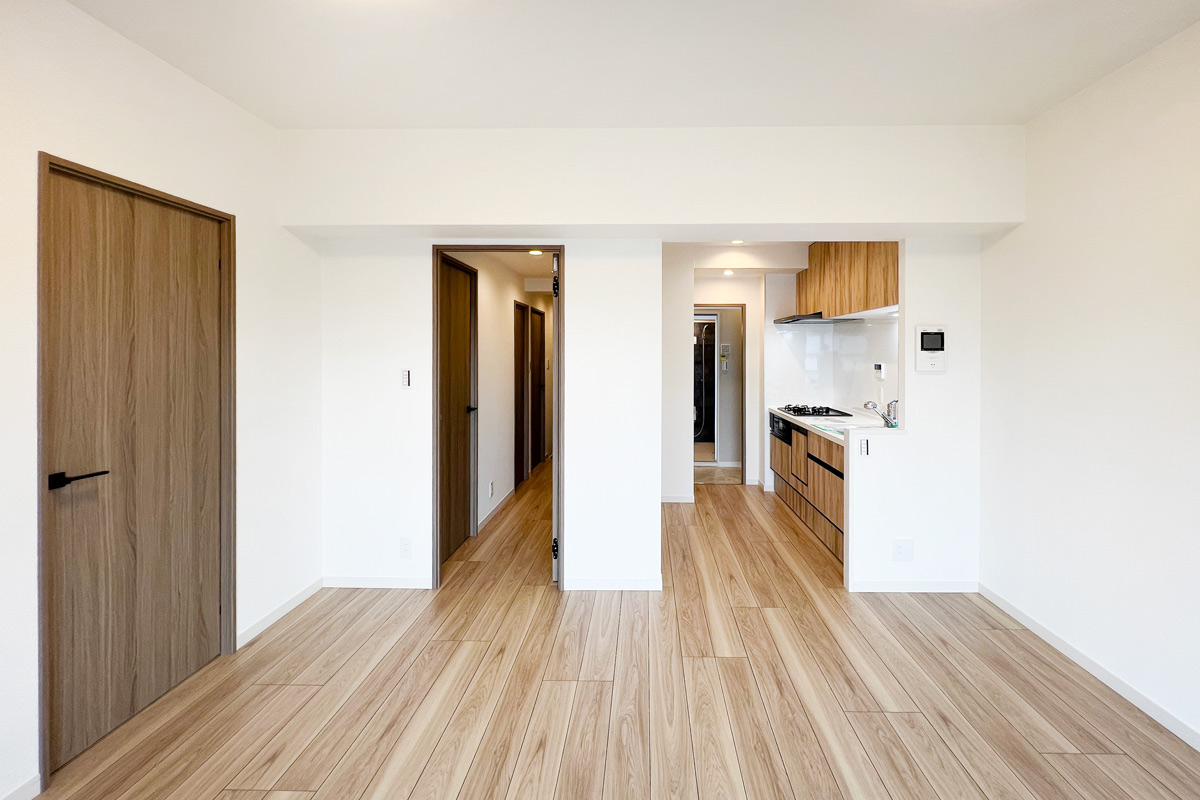 室内は2025年8月にリノベーション済。玄関を入って右に洋室、左に水回り、洗面室とキッチンはつながっていて家事がはかどりそうです。キッチンスペースは広々としているので、冷蔵庫やパントリー棚をゆったり置けそうです。食洗器、浄水器、追い焚き機能、浴室乾燥機、など設備も充実していました。洋室すべてに窓があるため風の通りが気持ち良く感じられました。