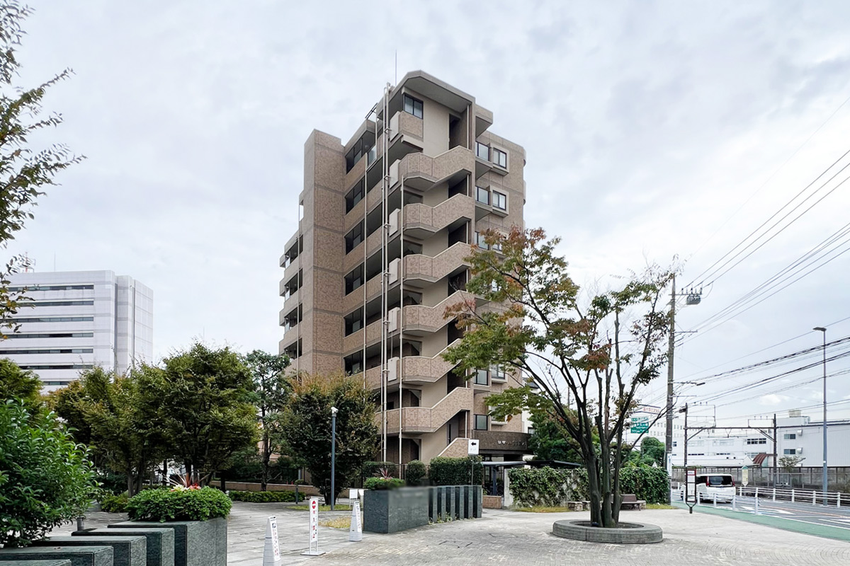 物件周辺には大規模マンションがあるため、建物間には程よいゆとりが感じられました。目の前にはバス停があり、新横浜へもバス1本で行くことができます。新幹線利用時に便利ですね。