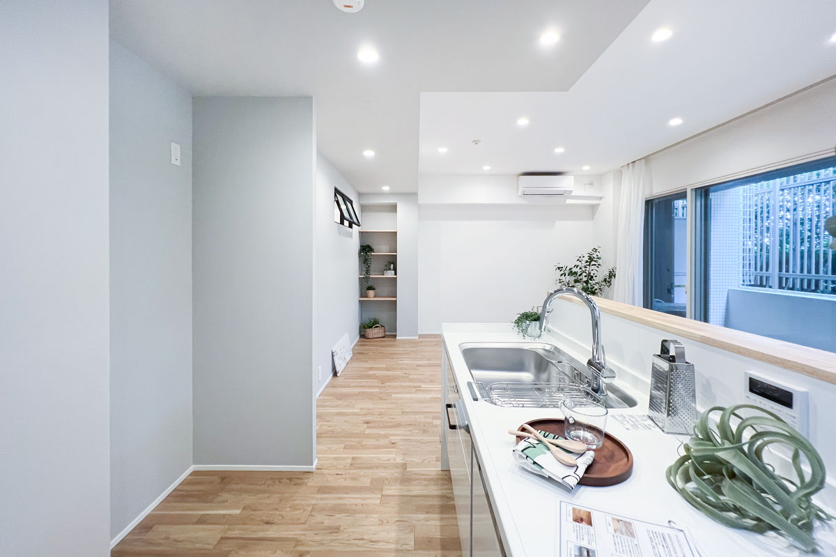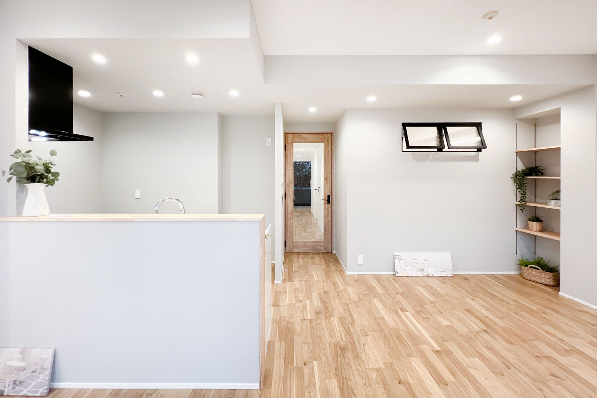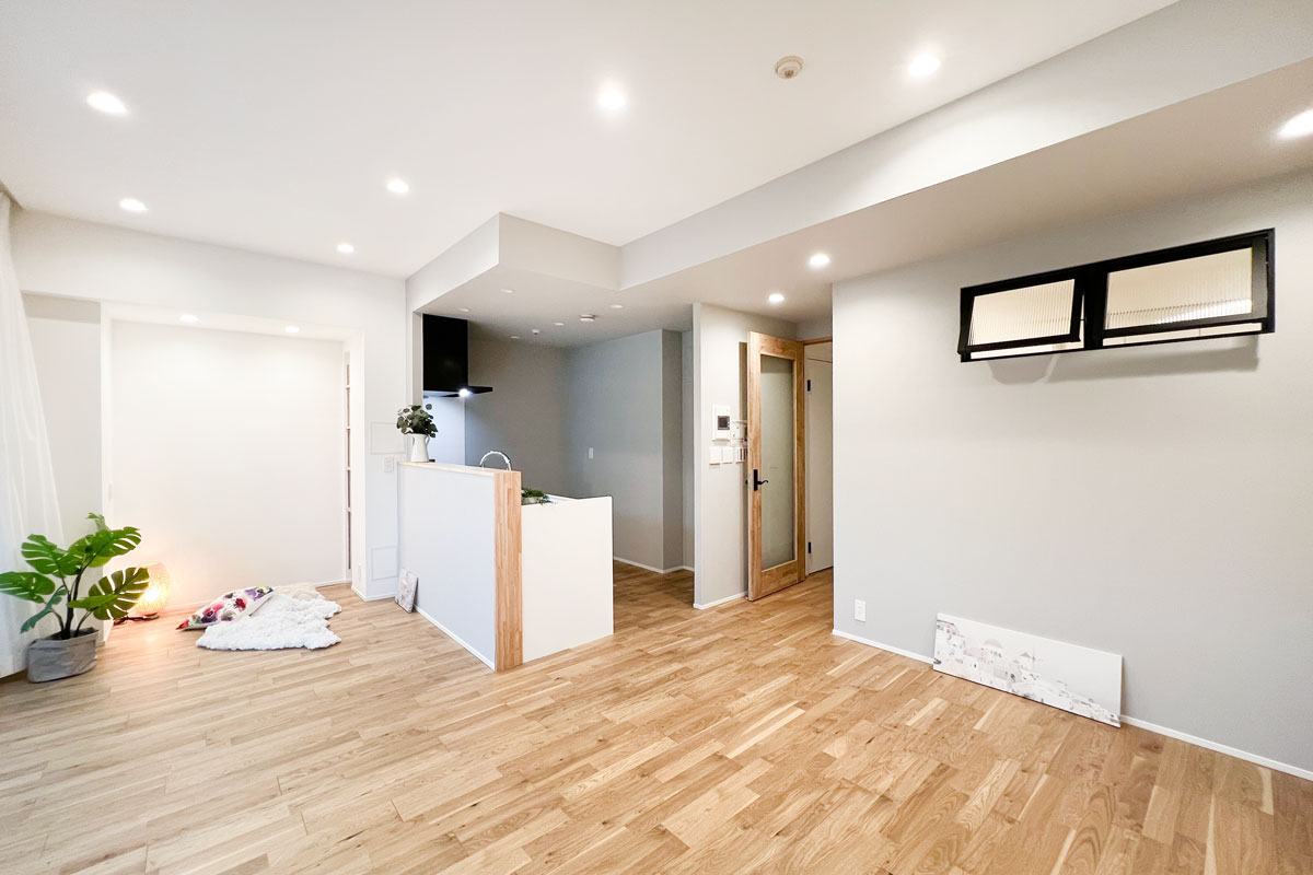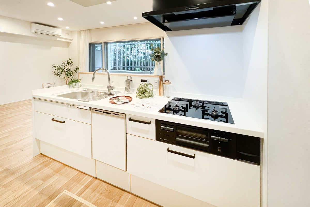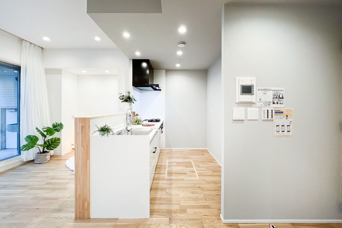 2025年7月にリフォーム済み。設備は食洗器、追い焚き機能、浴室乾燥機など充実しています。アフターサービス保証もついています。白い壁に木目と黒がアクセントのすてきな内装。キッチンからはリビングが見渡せ、リビングと接しているサービスルームの壁には室内窓が設置されていました。家族の気配を感じながら家事をすることができますね。