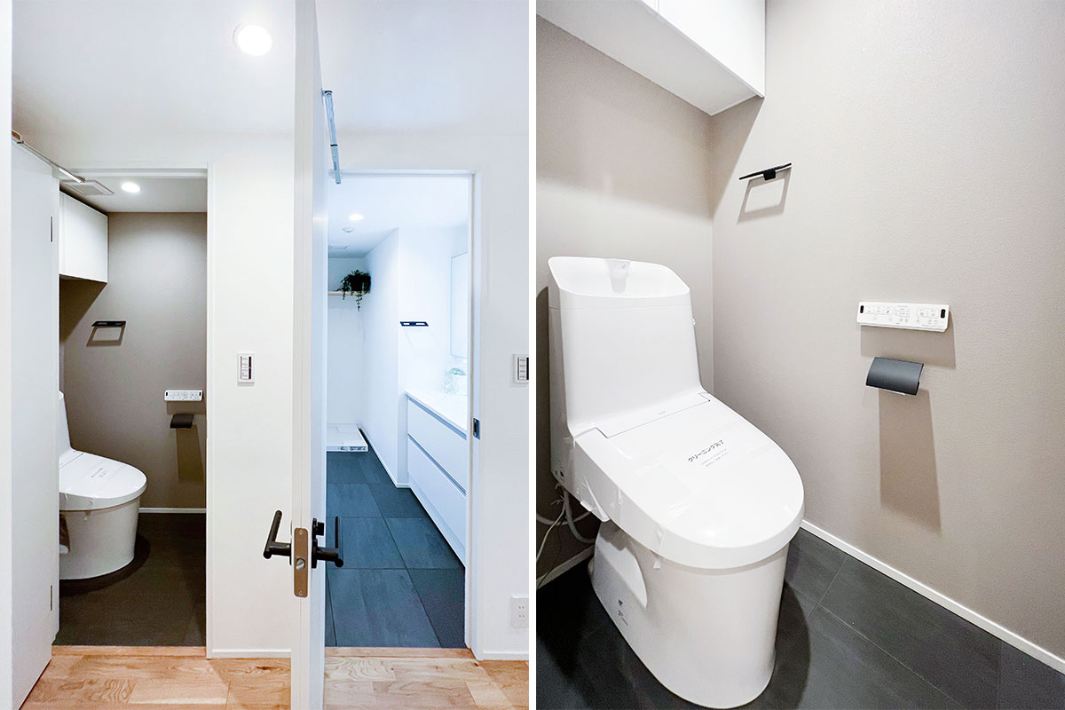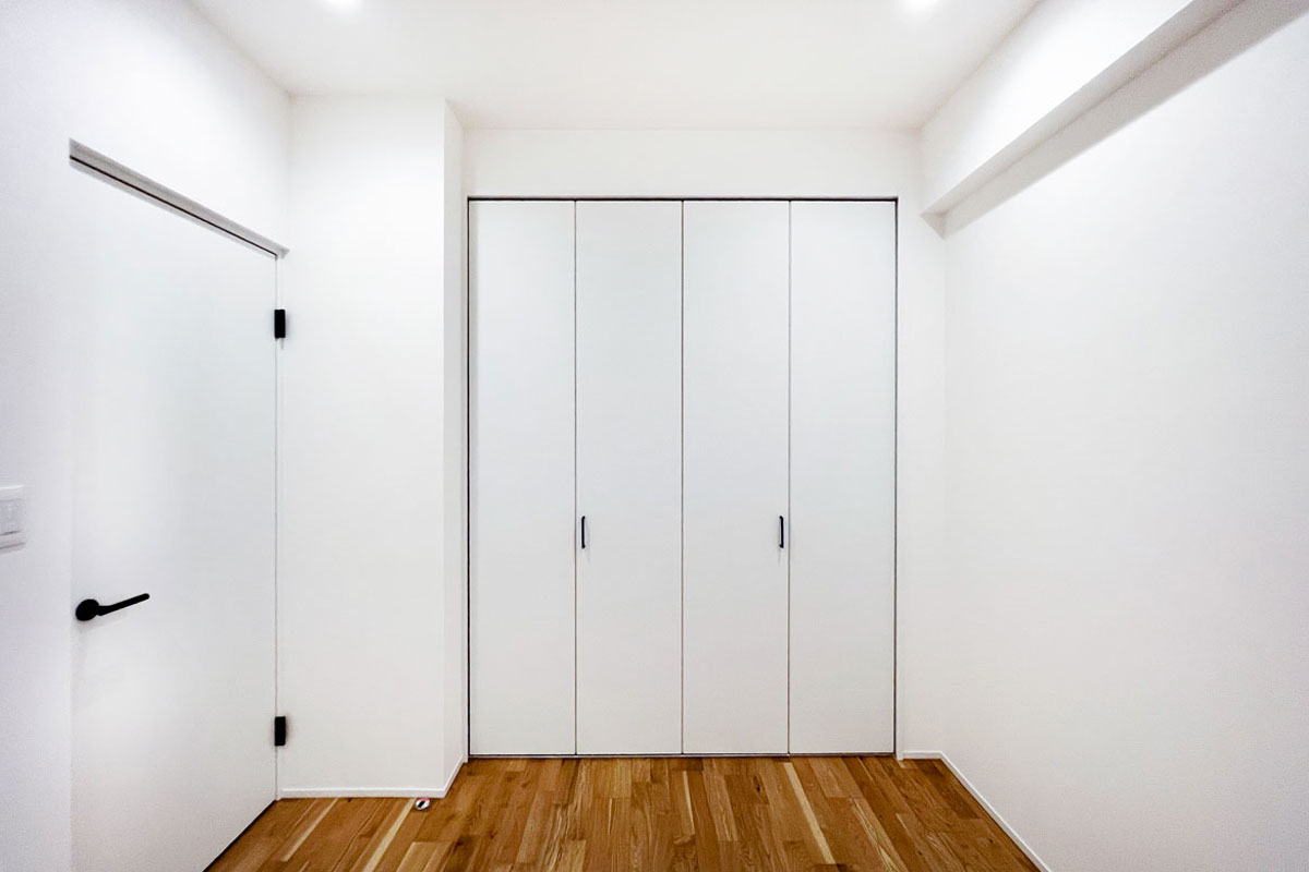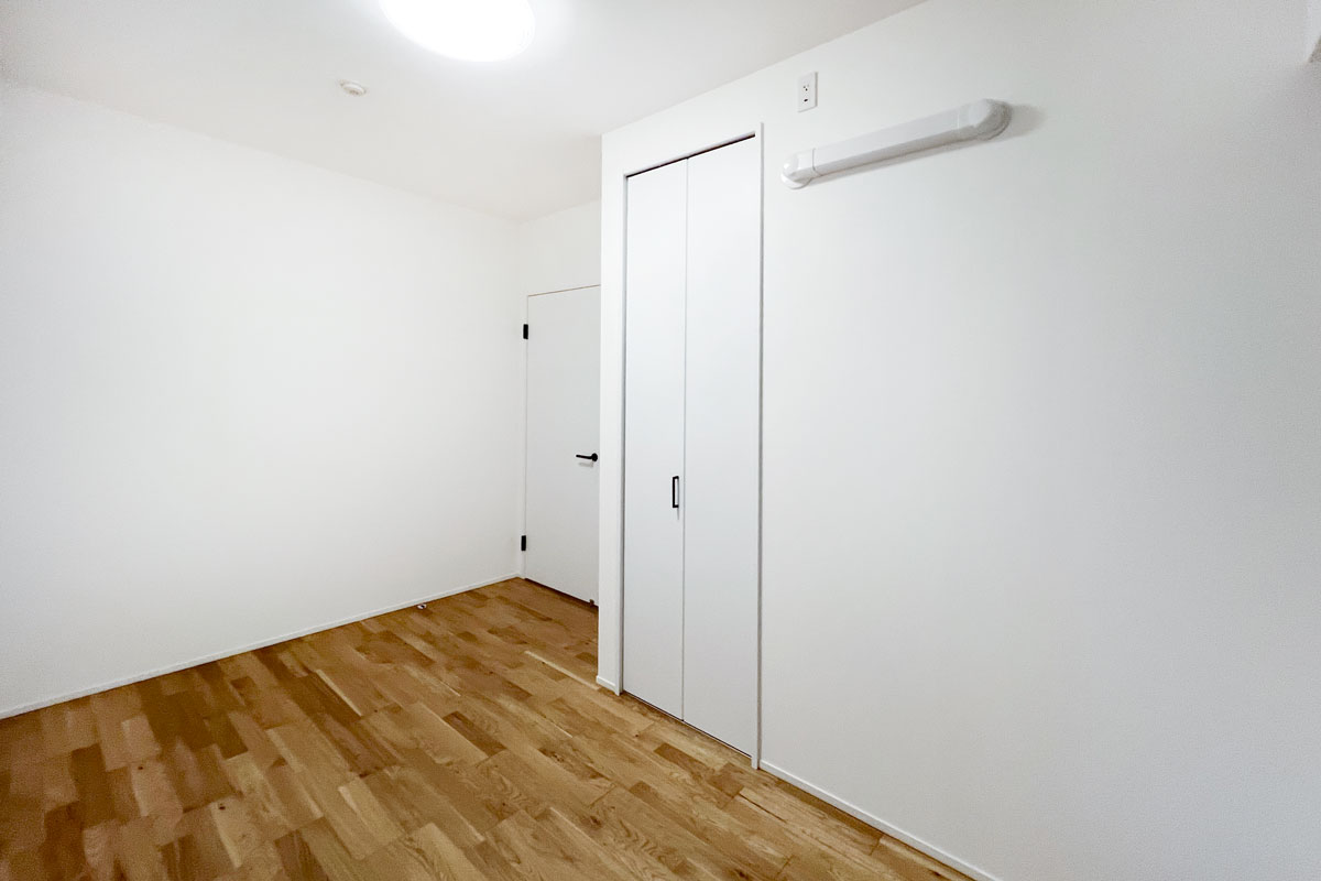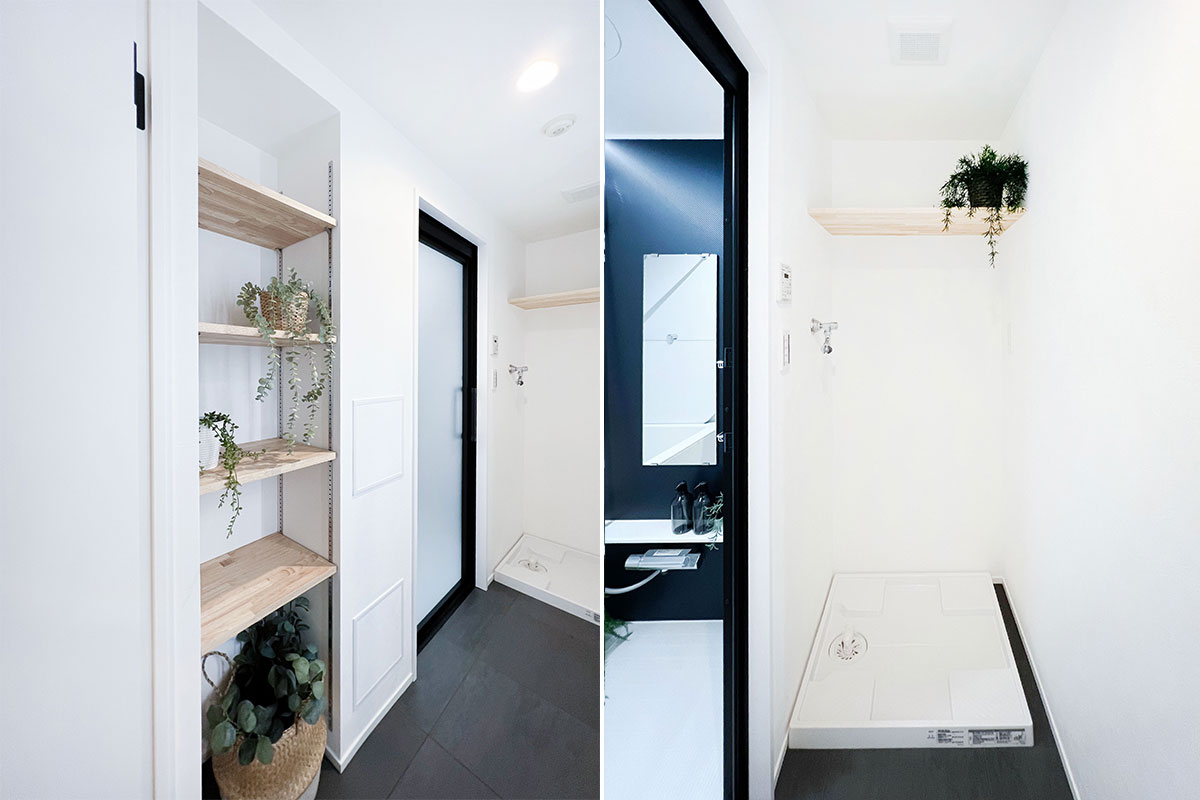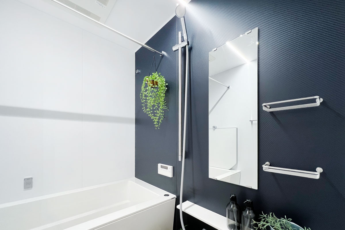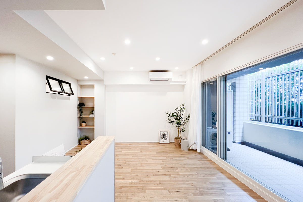 2025年7月にリフォーム済み。設備は食洗器、追い焚き機能、浴室乾燥機など充実しています。アフターサービス保証もついています。白い壁に木目と黒がアクセントのすてきな内装。キッチンからはリビングが見渡せ、リビングと接しているサービスルームの壁には室内窓が設置されていました。家族の気配を感じながら家事をすることができますね。