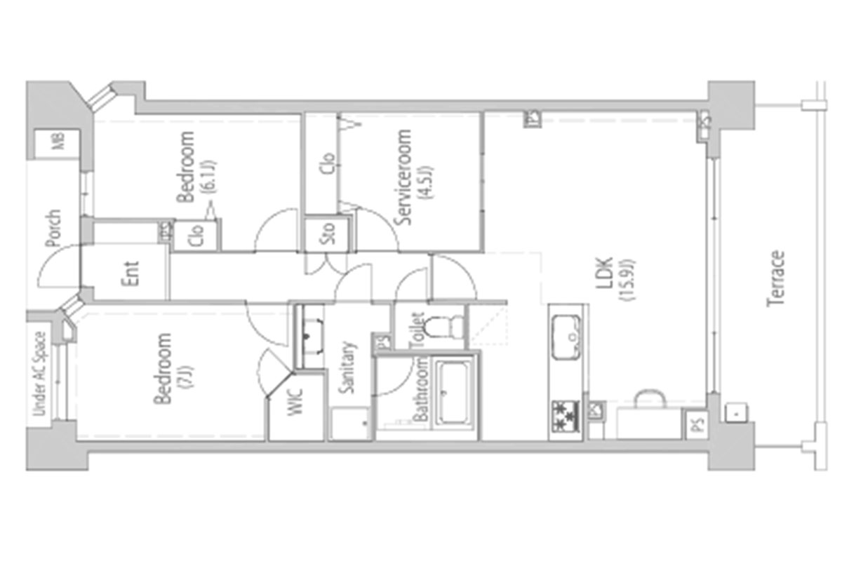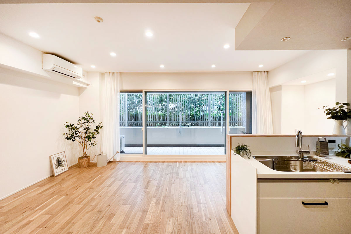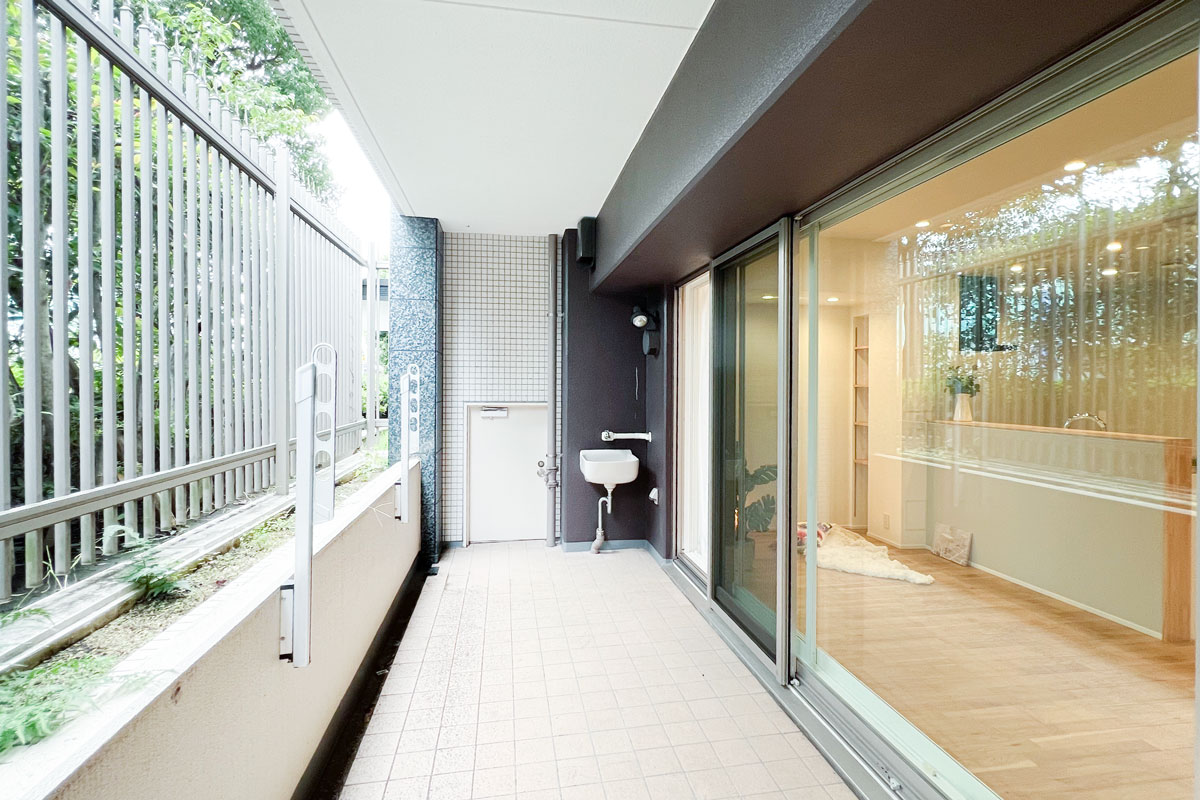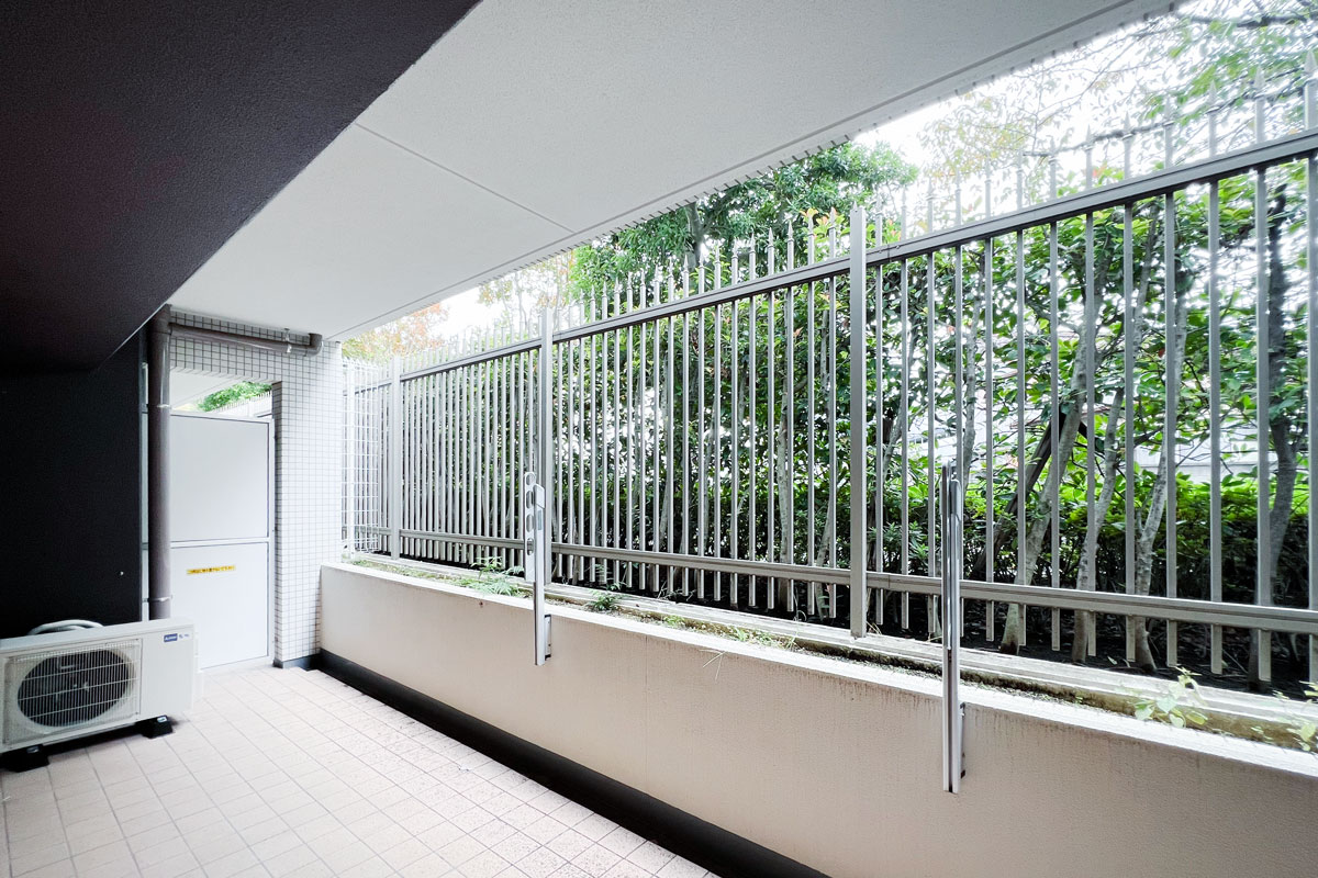 こちらの物件は1階ですが、たっぷりの植栽で外からも中からも目線はほぼ気になりません。リビングは二重窓になっていて静かな空間となっていました。ただ、テラスの向こう側が公園になっていて、その先が道路となっています。府中街道は通勤時間帯は交通量が多めの道路になります。現地で確かめてご検討いただければと思います。