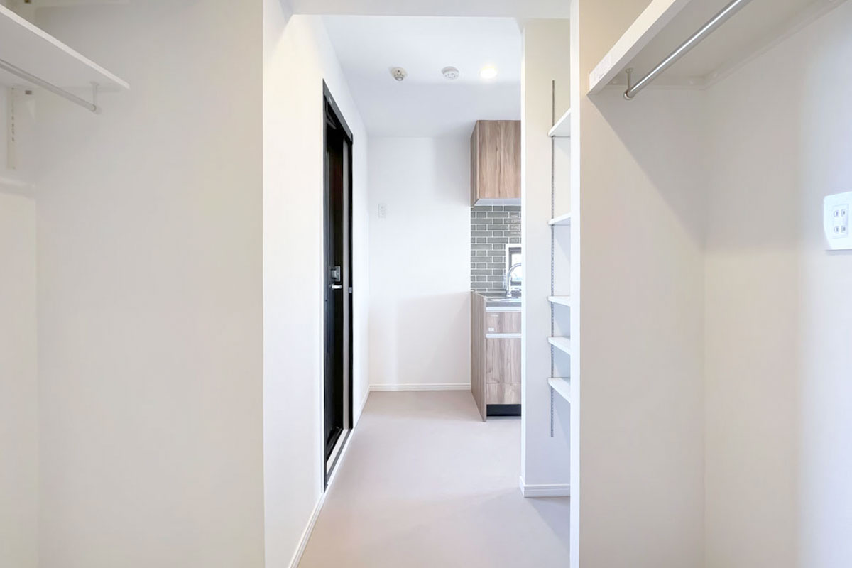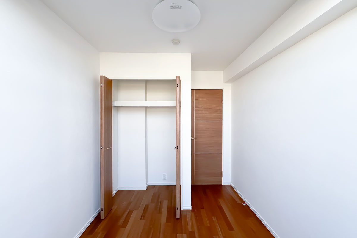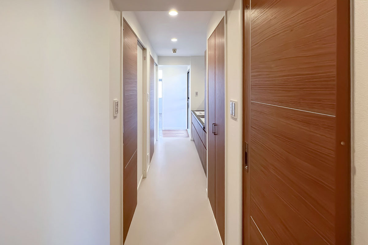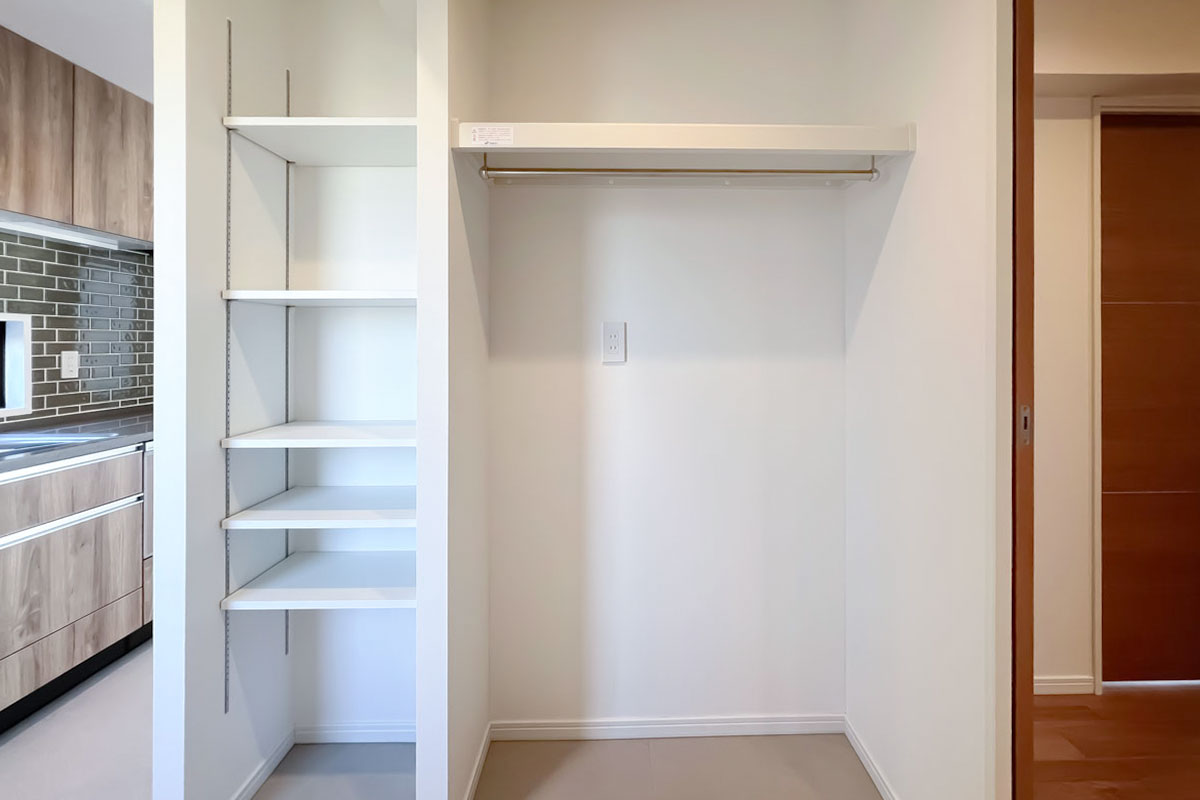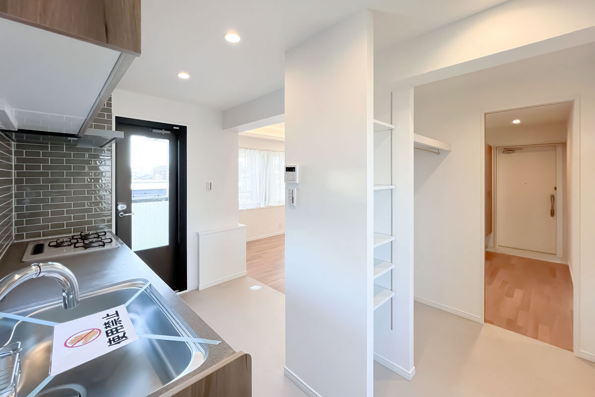 室内はリノベーション済み。最長2年間のアフター保証がついています。キッチン、水回り、給湯器や床暖房も交換済み。新生活が気持ちよく過ごせそうです。収納が多く、廊下には2つ、ランドリースペースにも棚があります。各洋室にはクローゼット、約6.0帖の洋室はコの字型のウォークインになっていて、収納が充実していました。