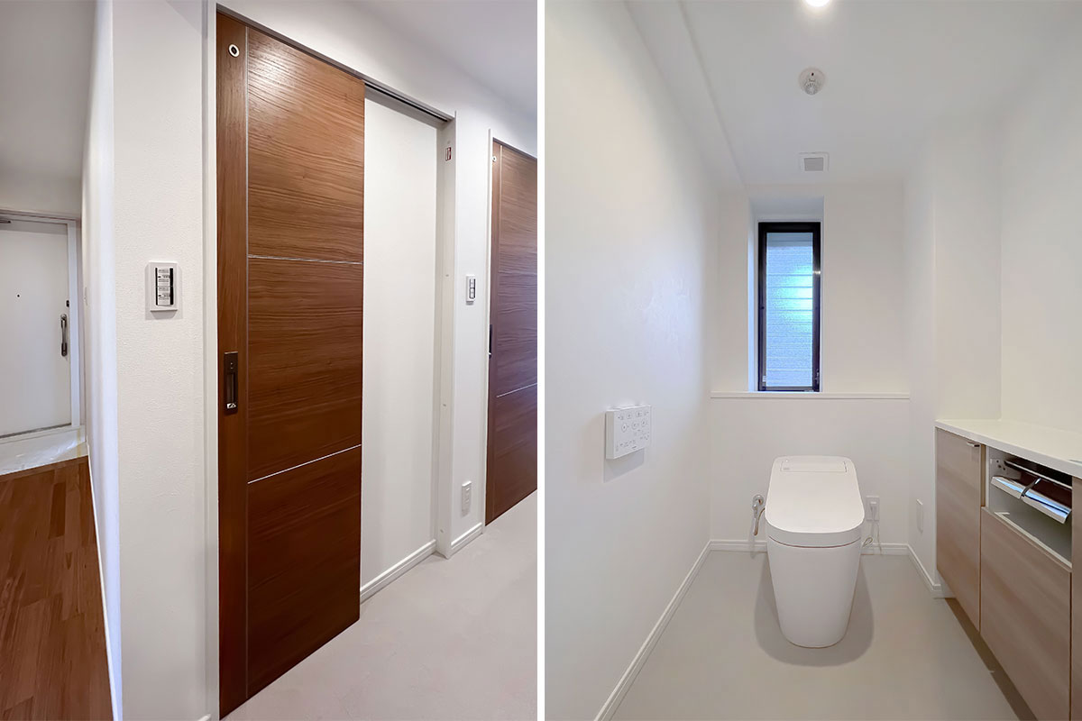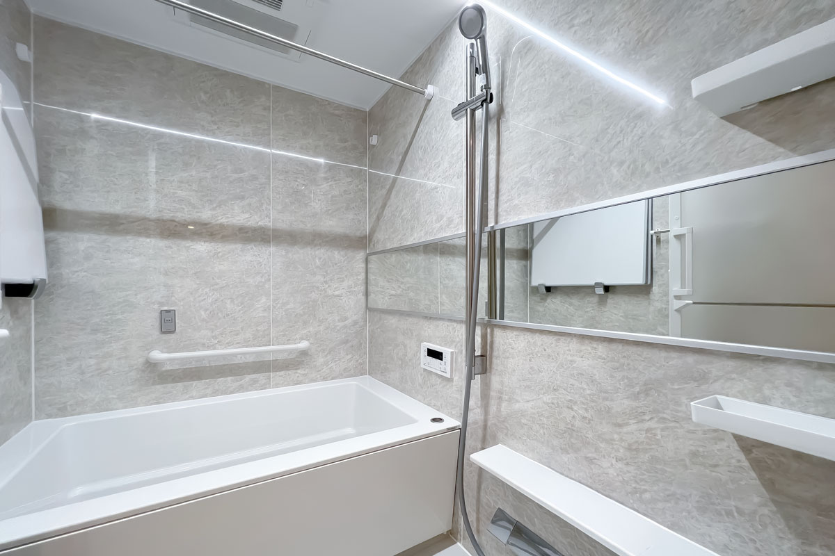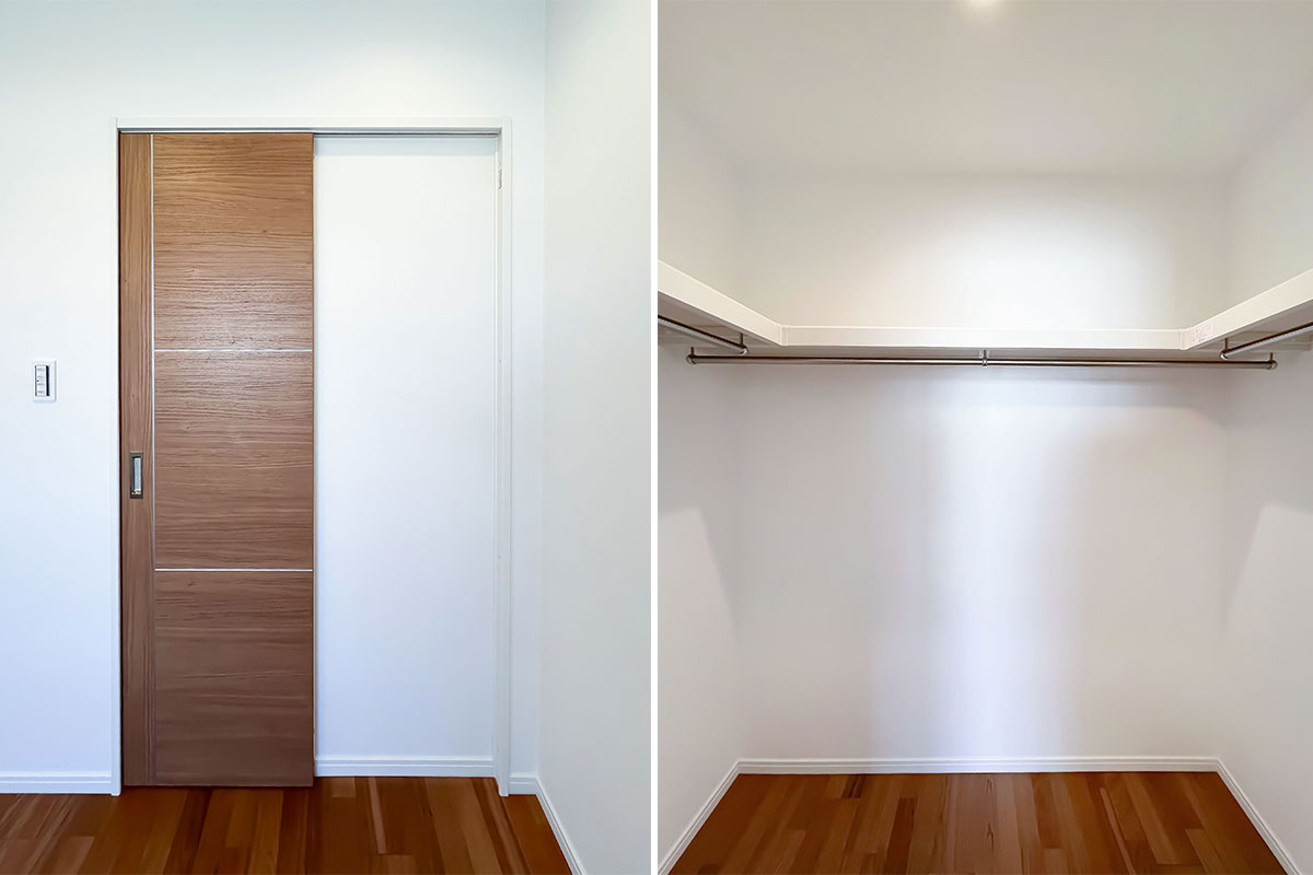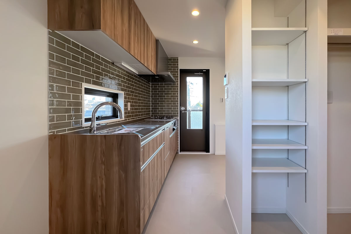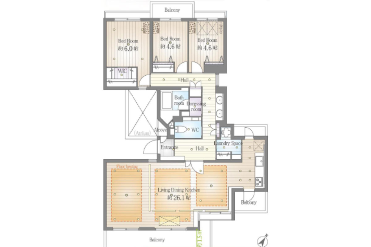 室内はリノベーション済み。最長2年間のアフター保証がついています。キッチン、水回り、給湯器や床暖房も交換済み。新生活が気持ちよく過ごせそうです。収納が多く、廊下には2つ、ランドリースペースにも棚があります。各洋室にはクローゼット、約6.0帖の洋室はコの字型のウォークインになっていて、収納が充実していました。