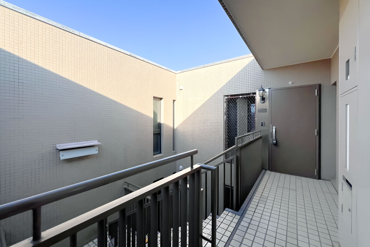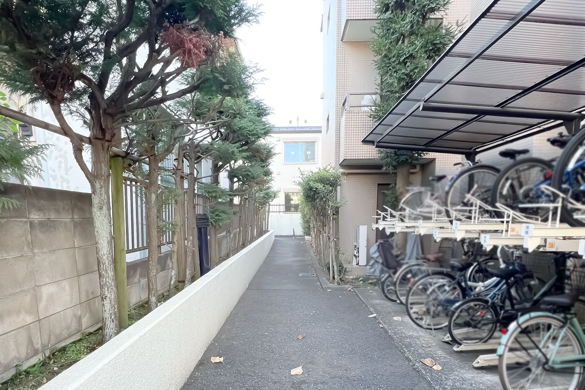 メインの入口は駐車場側のため、駅から少し遠回りになるようなルートになります。しかし、用賀駅方面から駐輪場脇を通って直接入れる細いアプローチがありました。朝は急ぎたいのでこれは助かります。オートロックは無く、号室によってエントランスが3つに別れています。