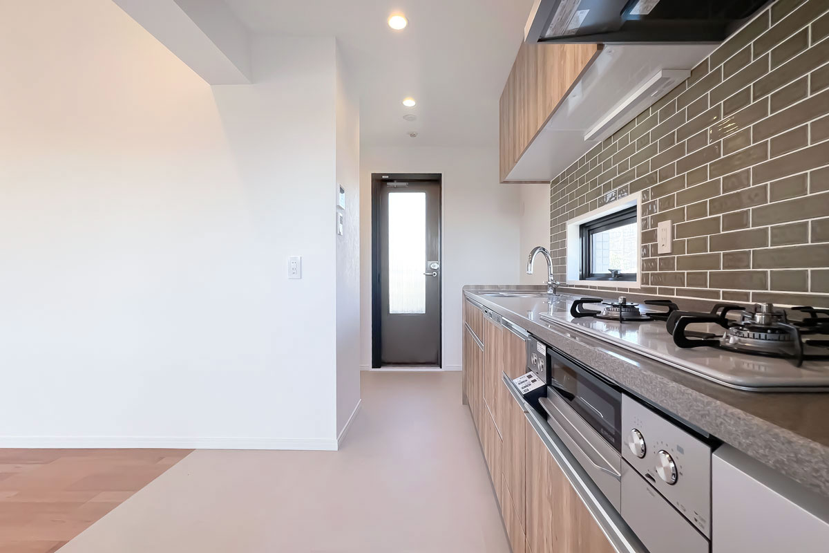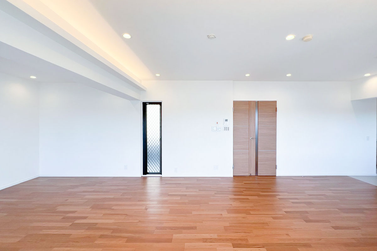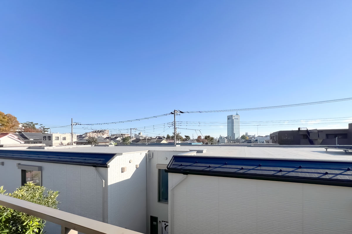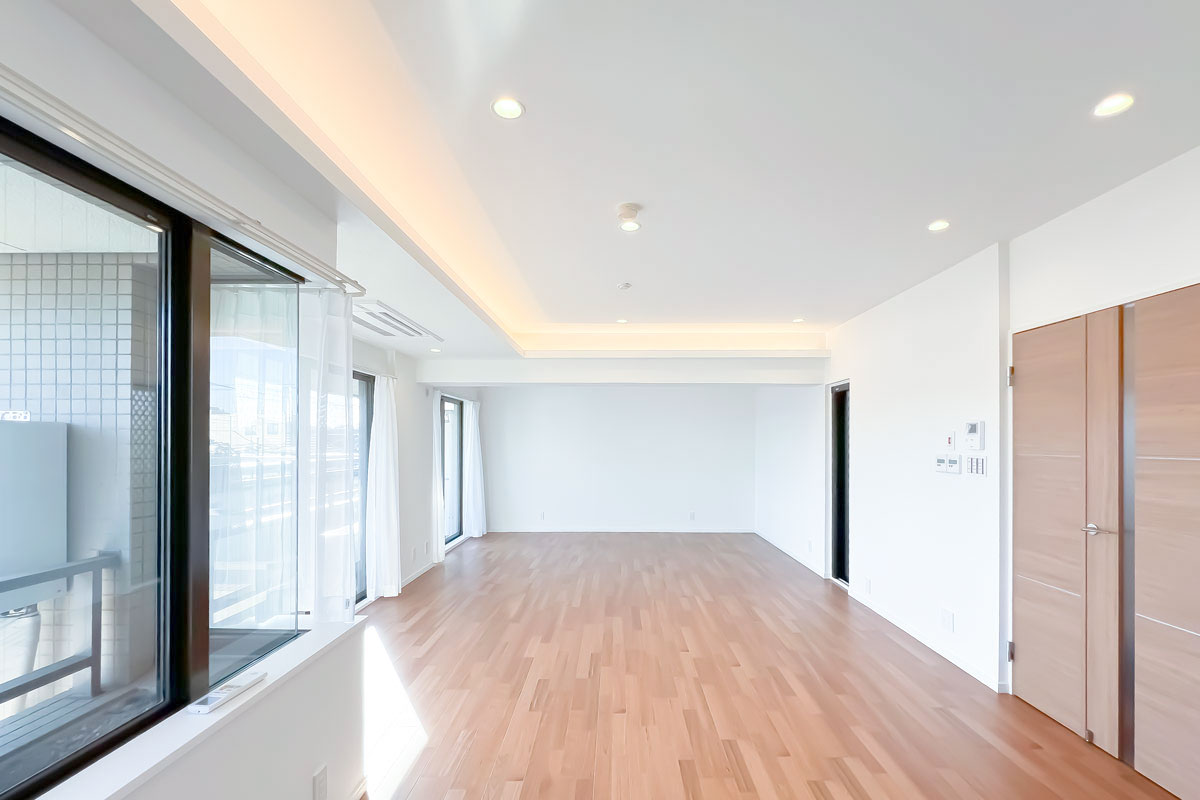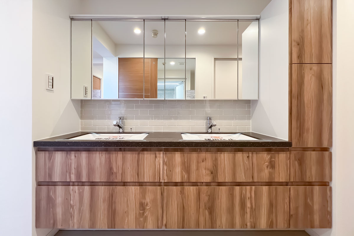 間取りは、99.98㎡の3LDK。玄関を入ってまず思ったのは、広い。リビングも広々で、約26.1帖あります。憧れの大きなソファを置ける余裕の広さです。南東向きで窓が多いこともあり、風が通るとても明るい心地よいリビング。バルコニーからは用賀の街並みが見渡せ、空を感じることができました。リビング奥にあるキッチンとランドリースペースはつながっていて、そこから廊下に出るとダブルボウルの洗面台が設置されています。なかなか出会わない間取りなので、なんだかワクワクしました。
