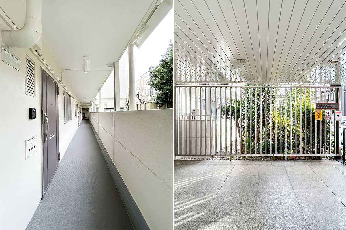 真っ白な外壁にお手入れの行き届いた植栽の緑が映え、エントランスは少し懐かしい雰囲気を残しつつも丁寧に磨き上げられており、清々しい空気が漂っています。