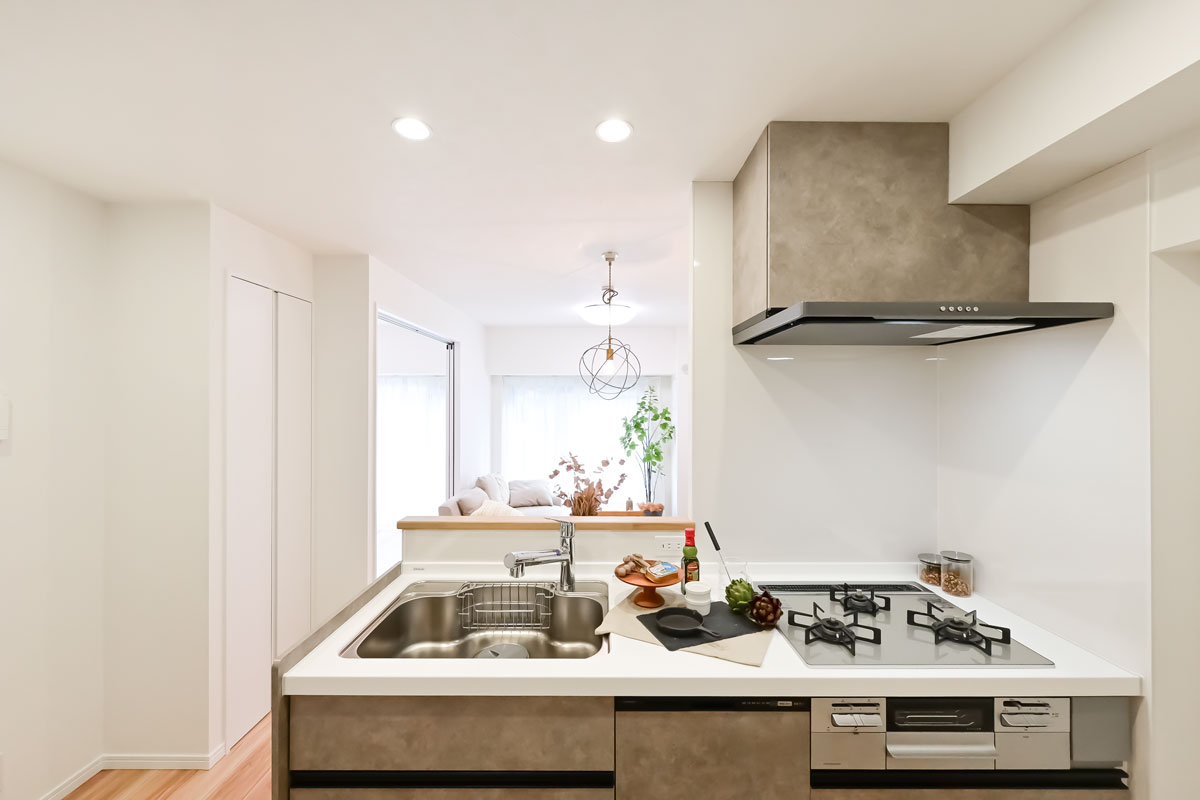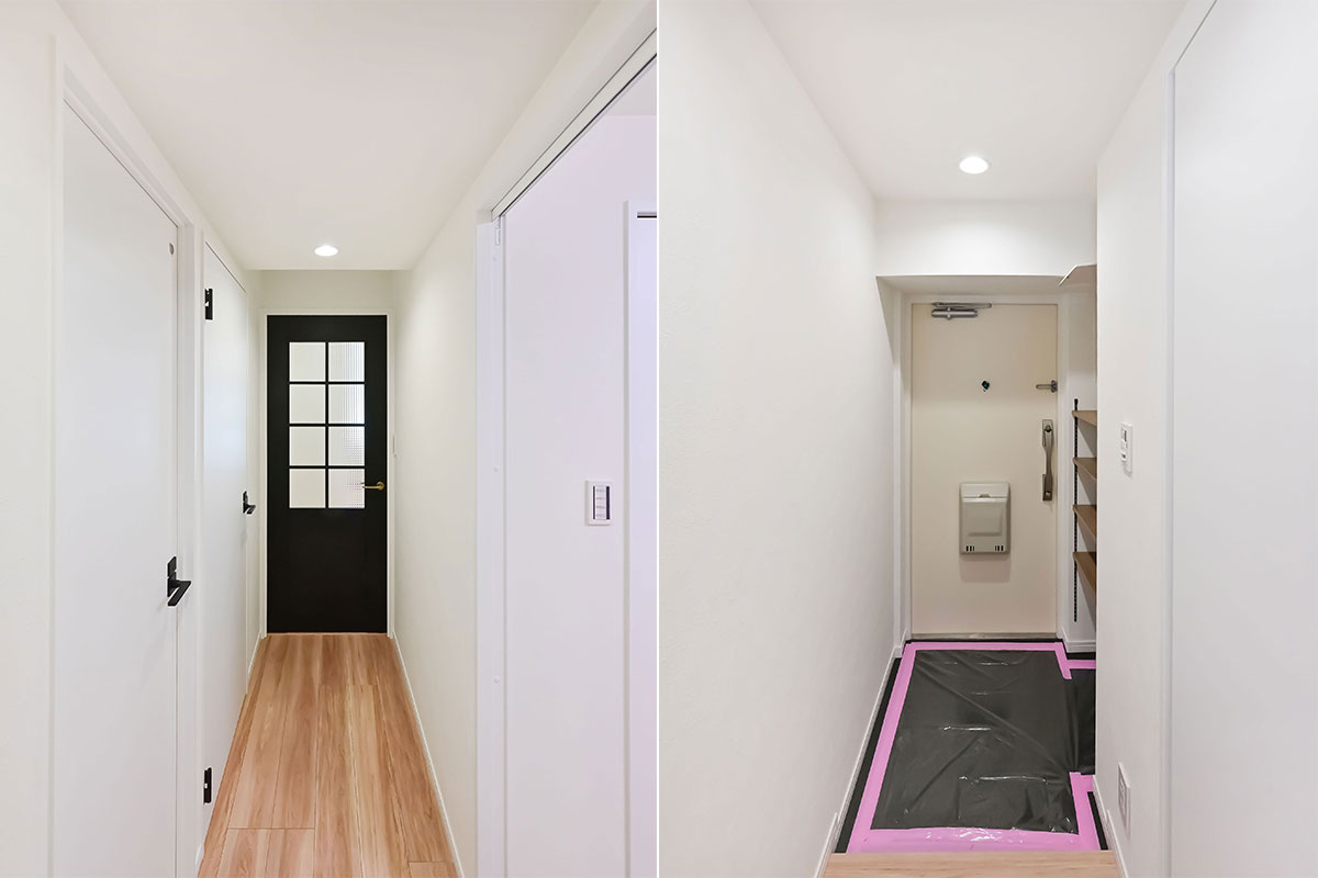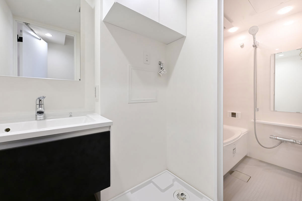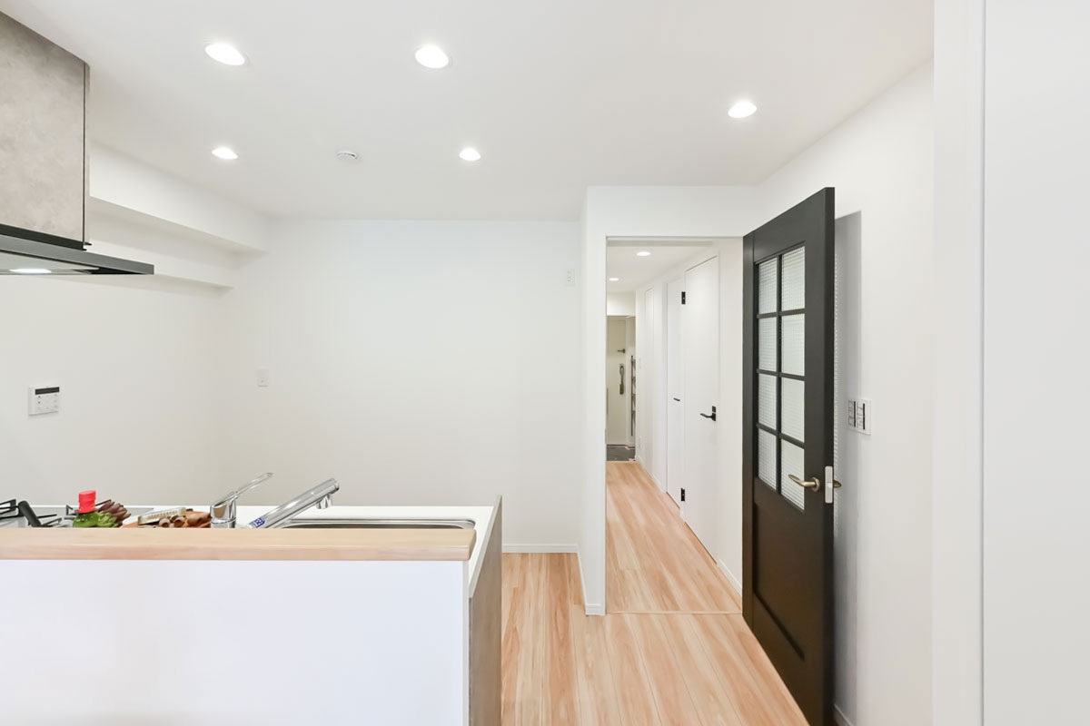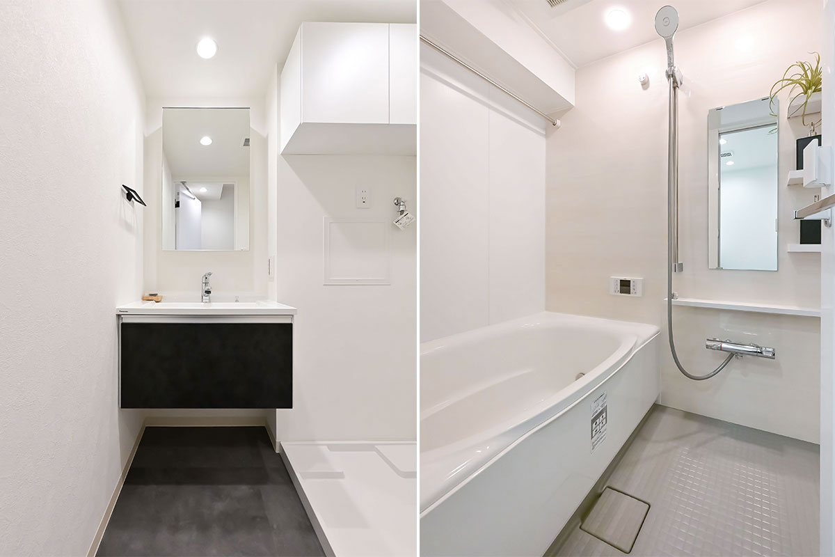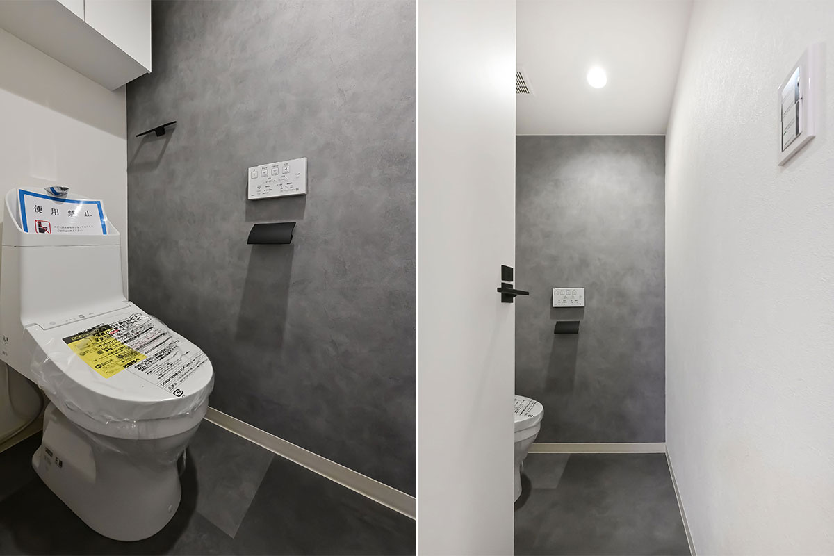白とベージュを基調に、ダークなアクセントカラーが加わって洗練された雰囲気。キッチンや洗面スペースは作業しやすい広さがあり、トイレも本棚を置けるほどゆったりしています。