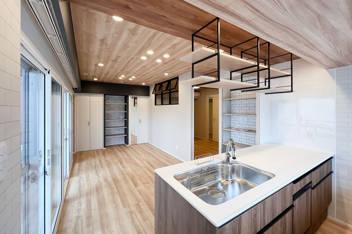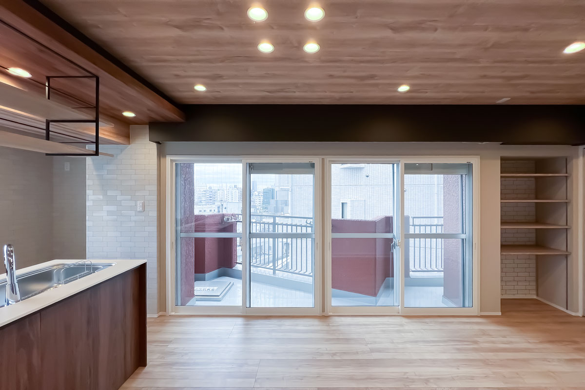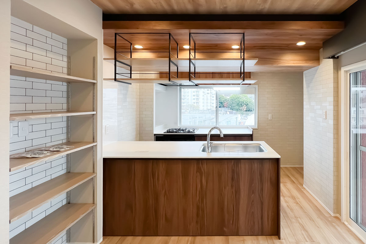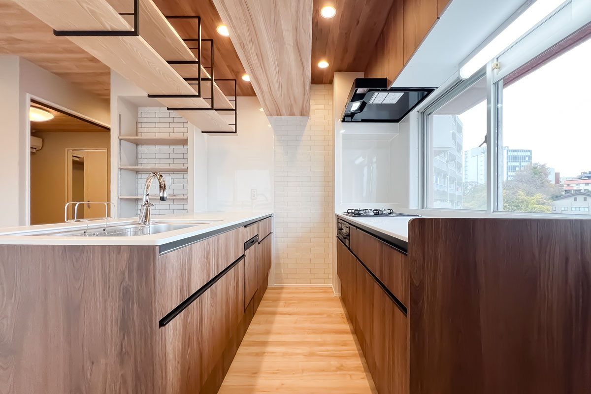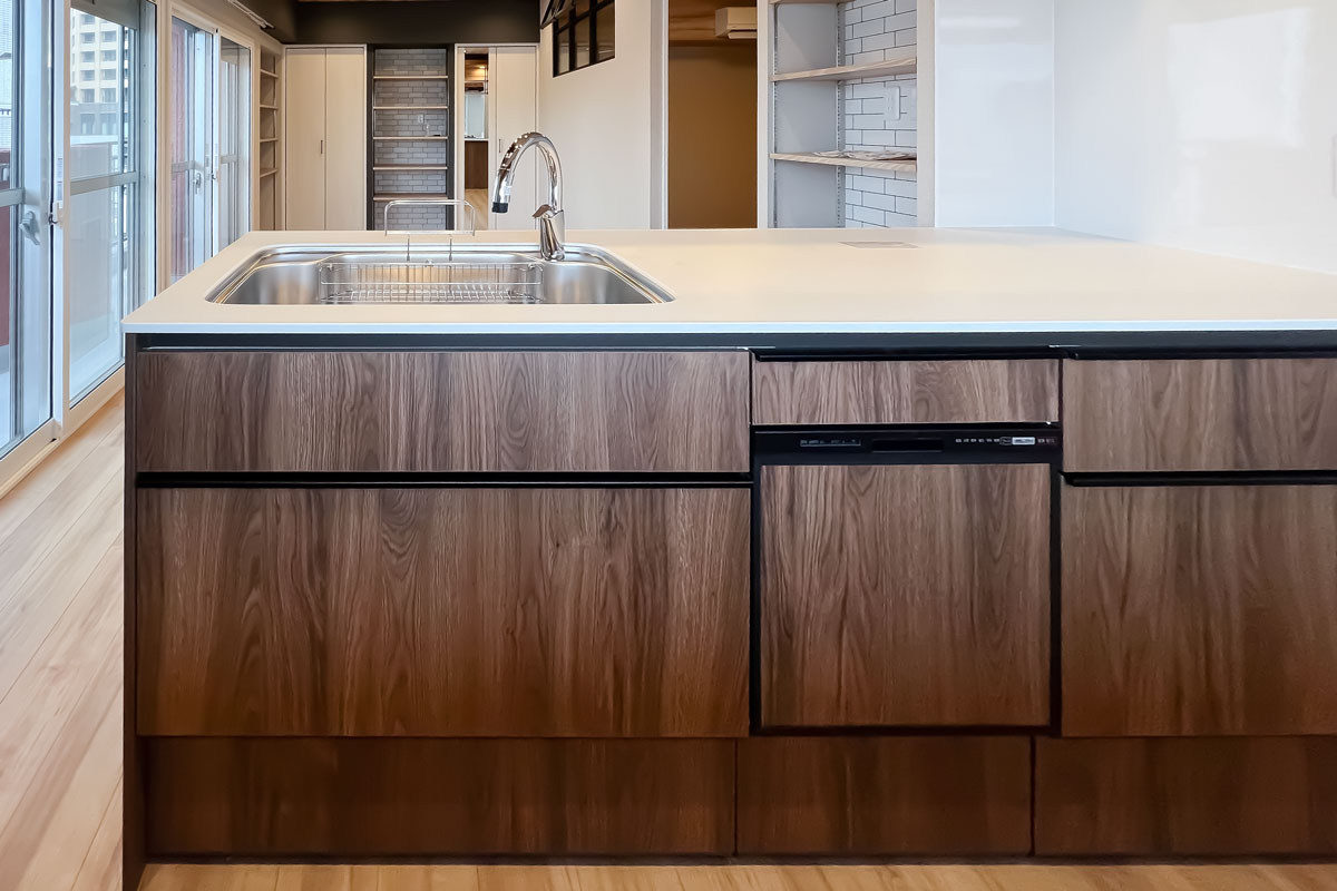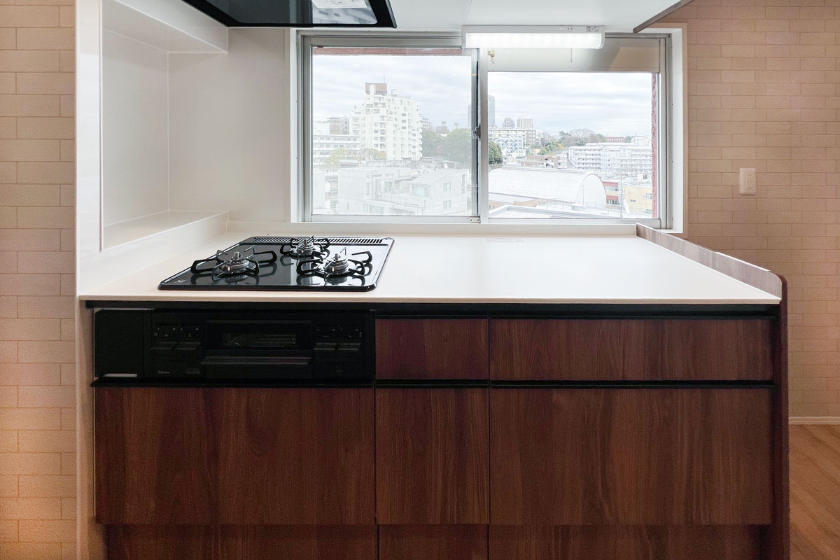 バルコニーからももちろん空が見えますが、キッチンにある窓からの眺望が抜けていてとても良かったですよ。キッチンは、3口コンロ・食洗器付のシステムキッチンで、コンロとシンクがセパレートで配置されている2列型。収納が多く、作業スペースが広くとれるので、お料理好きな方におすすめのキッチンです。
