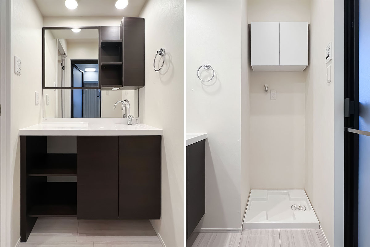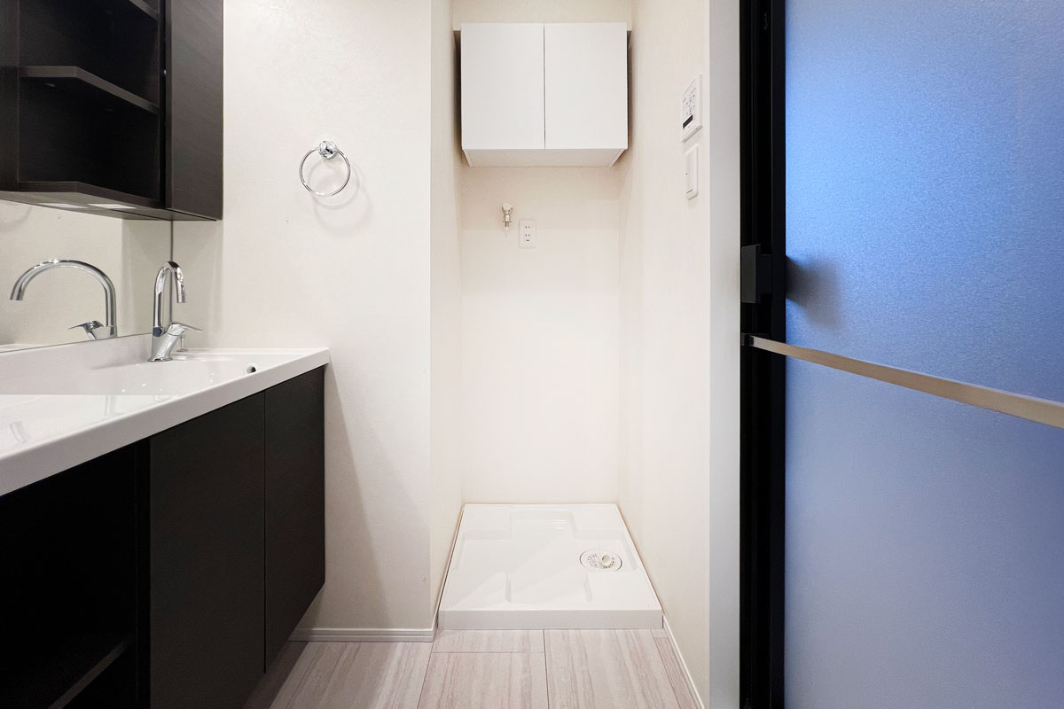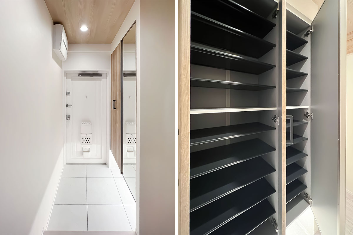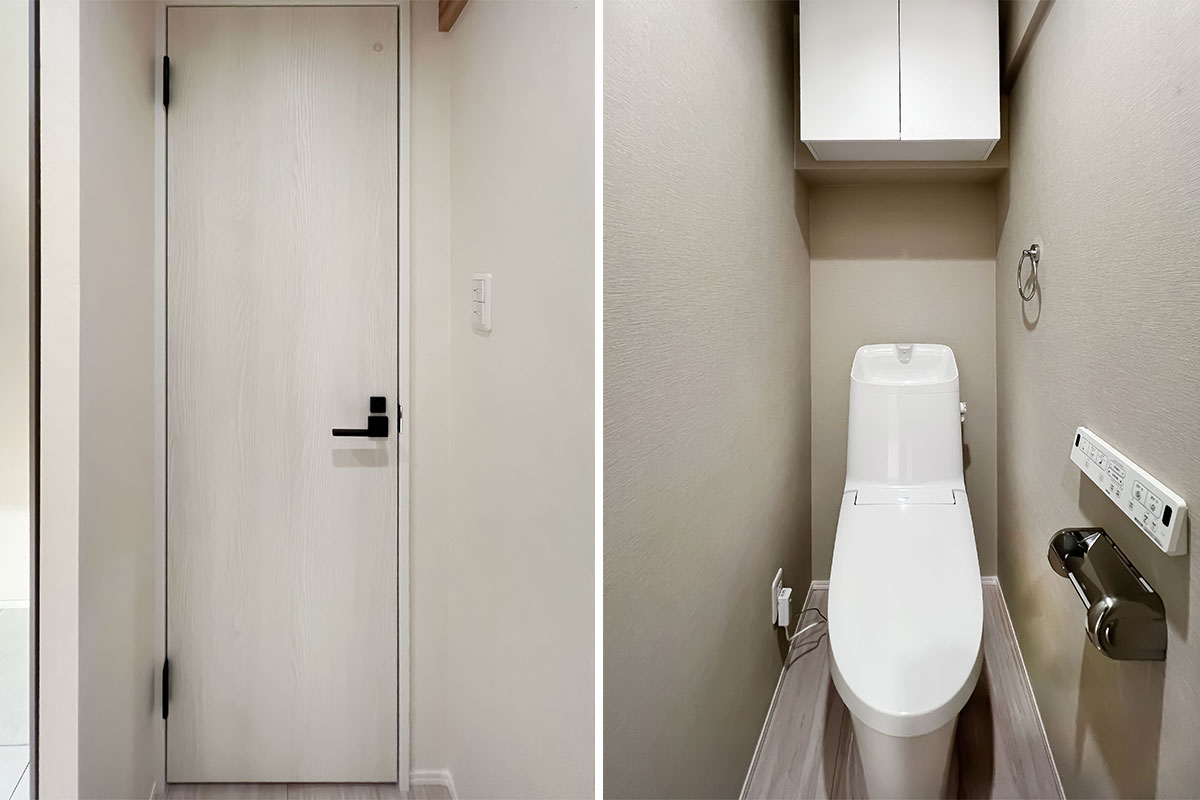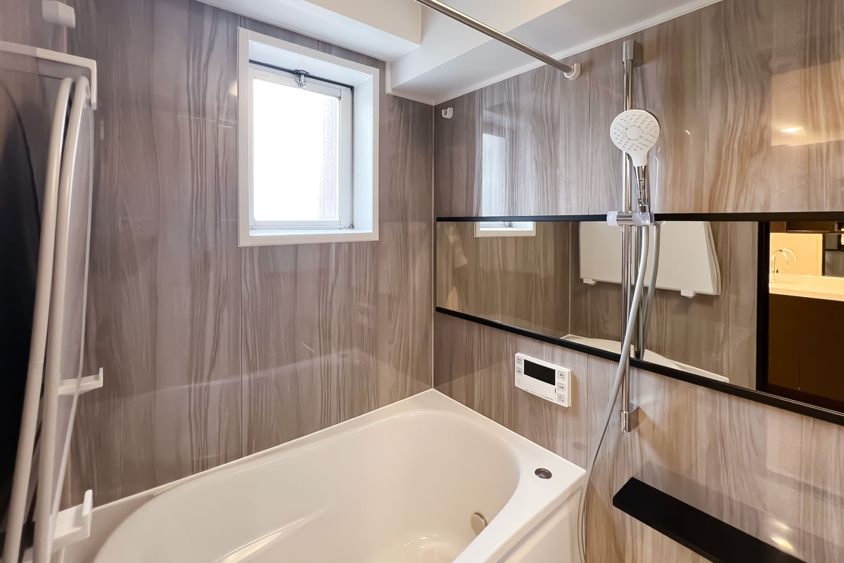 こちらのお部屋はリノベーション済みのため、クロスや建具が一新されているほか、追い焚き・乾燥機付のバスルームや大型シューズボックスなど、住みやすくなる設備が備わっていました。また、エアコンがすでに1台設置されていますので、スムーズに新生活が始められそうです。