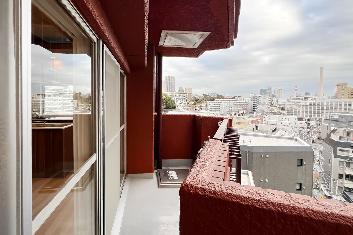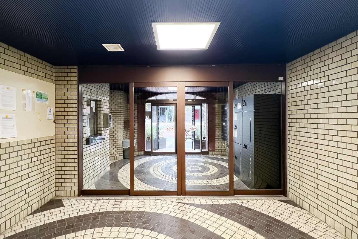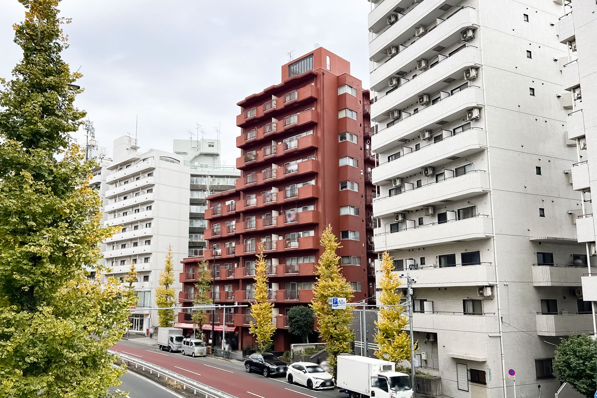 今回ご紹介のマンションは、駅を出たら中目黒アトラスタワーのほうへ進み、山手通りと駒沢通りの交差点をまがり、少し上り坂を登ったところに位置しています。昭和54年築のヴィンテージマンション。外観のレンガが鮮やかで、遠目でもパッとわかります。