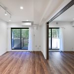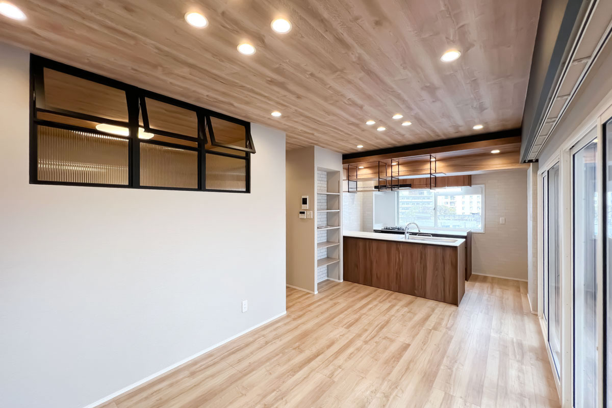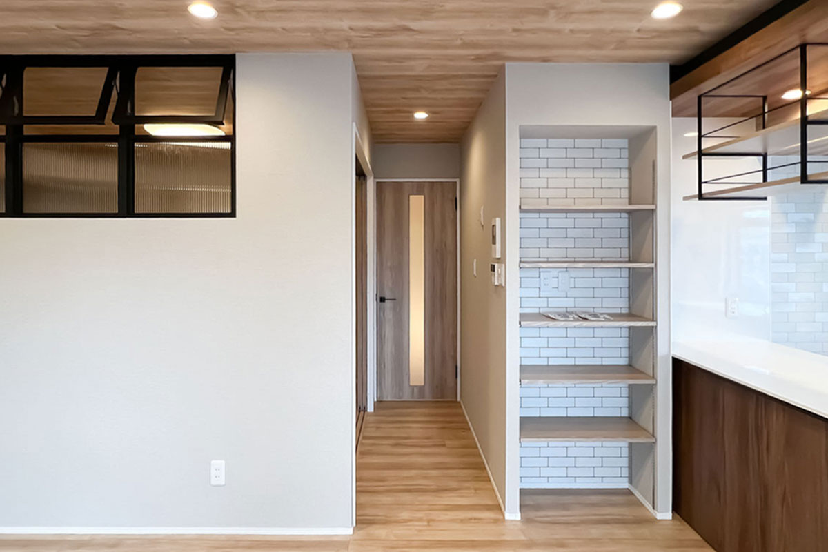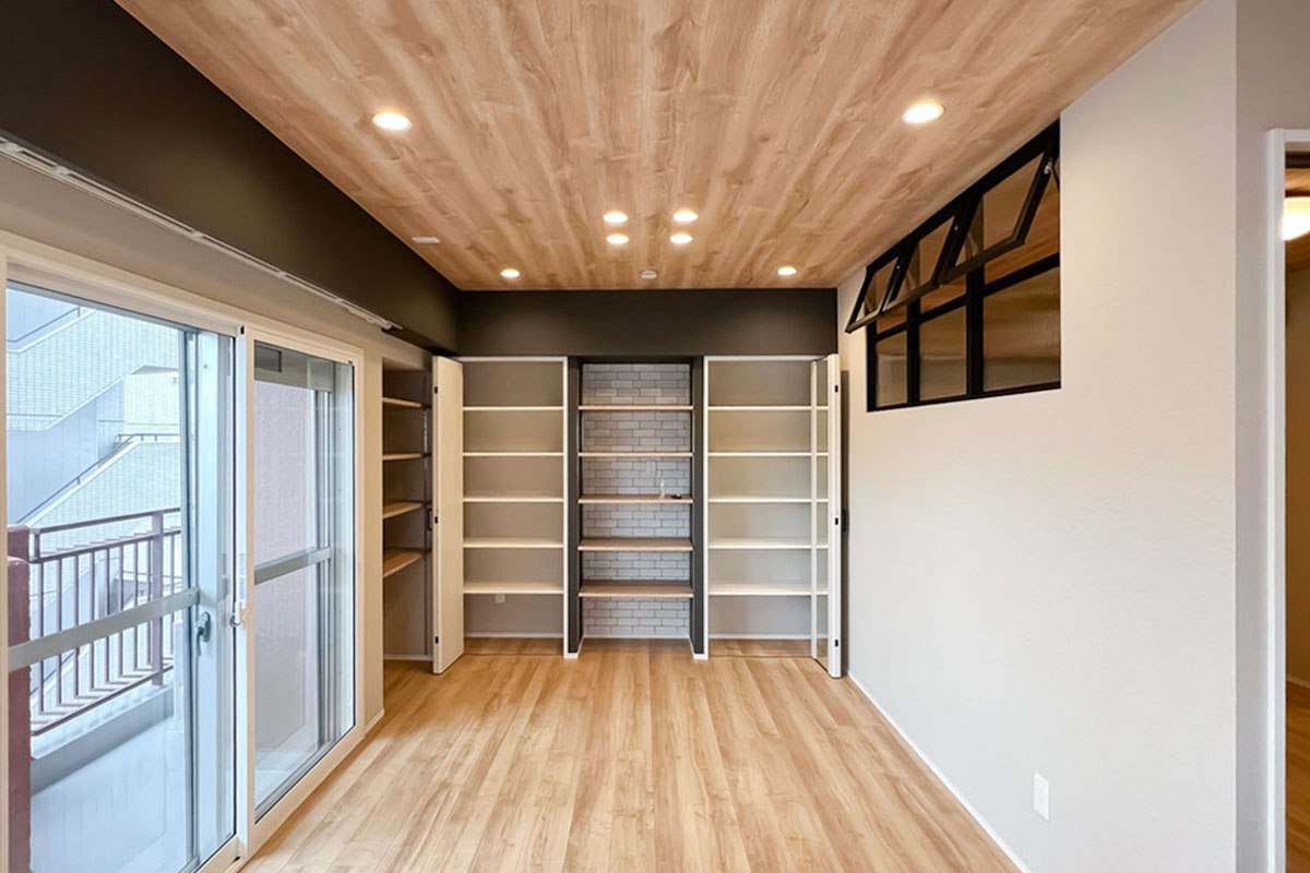 室内は、柔らかな木目に黒のアクセントが効いて、街の洗練された雰囲気とぴったり。リビングには2つのクローゼットかと思いきや、棚になっているので、ブックシェルフとしても使えそうです。目隠しがあるので、思いっきり趣味の本がたくさん置けそうです。