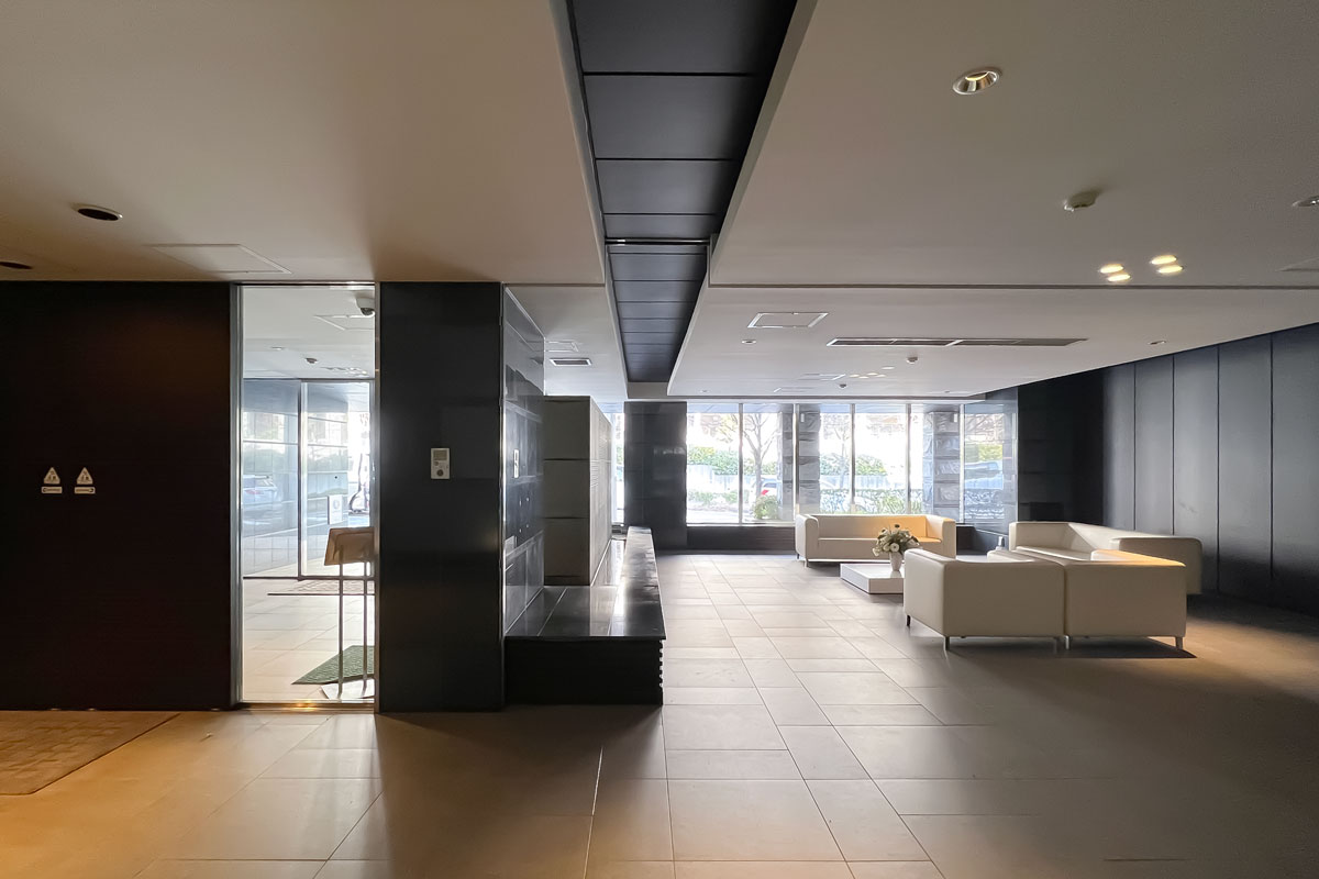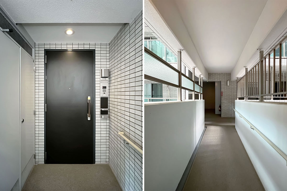 こちらのマンションは前面道路沿いに長く設計されています。初めて共用部を歩く場合、お部屋まで少し迷うかもしれません。ご紹介のお部屋は、外観画像の白い外壁部分の建物に位置しています。