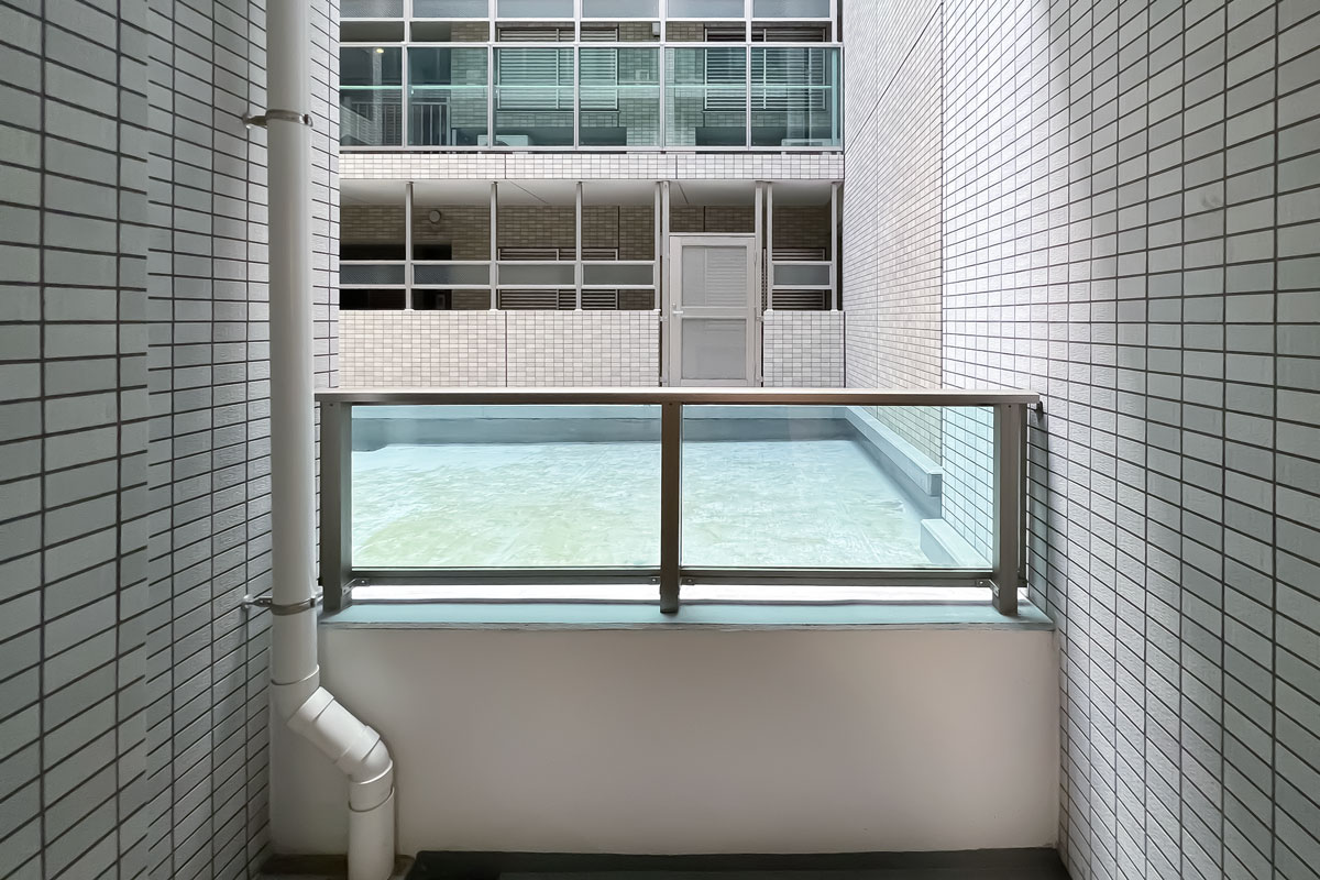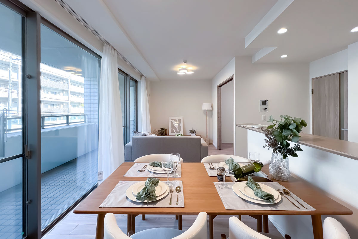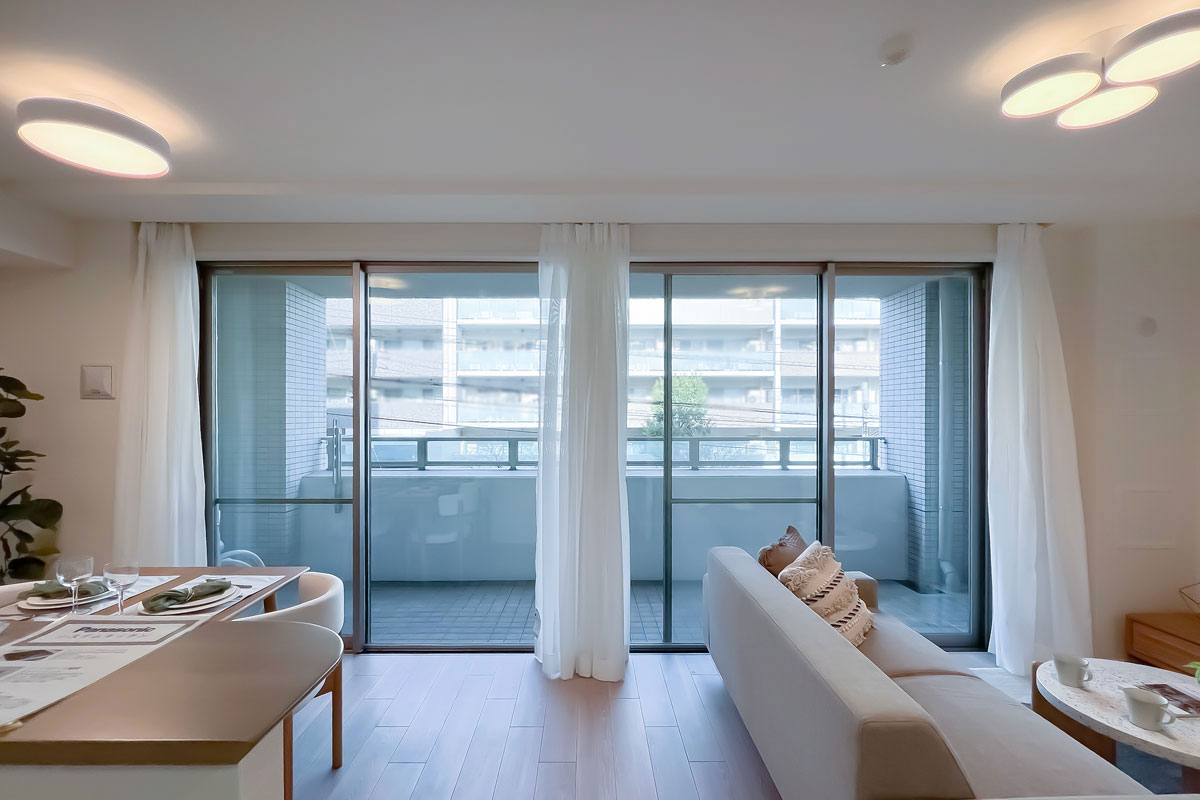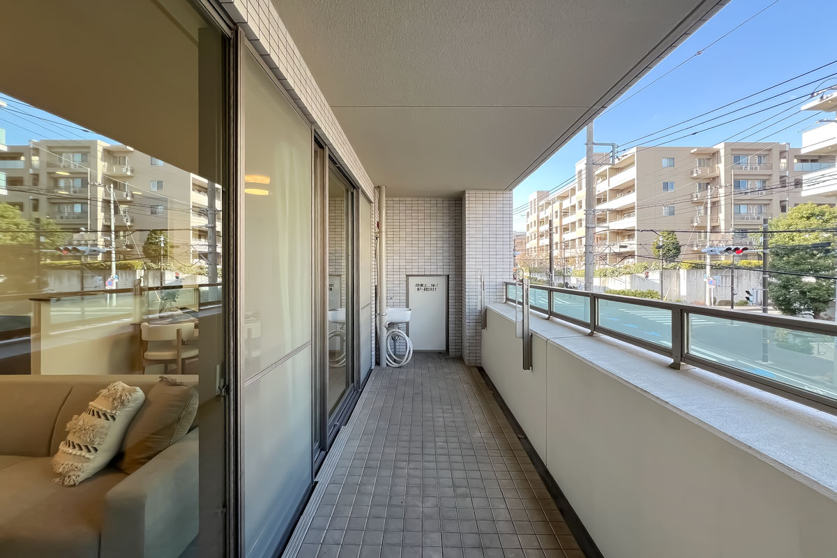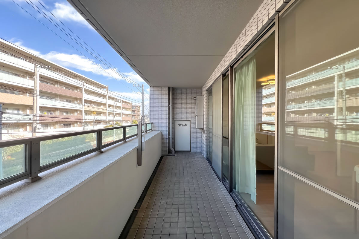 取材に伺ったのは午前の早い時間帯。お部屋が北西向きのため、日当たりがとても良いとは言えなかったのですが、バルコニーが前面道路に面していますので、リビングが薄暗いという印象はありませんでした。バルコニーは16.81㎡あり、実際見るとゆったりしています。テーブルと椅子を置いて、外気を楽しむこともできそうですね。