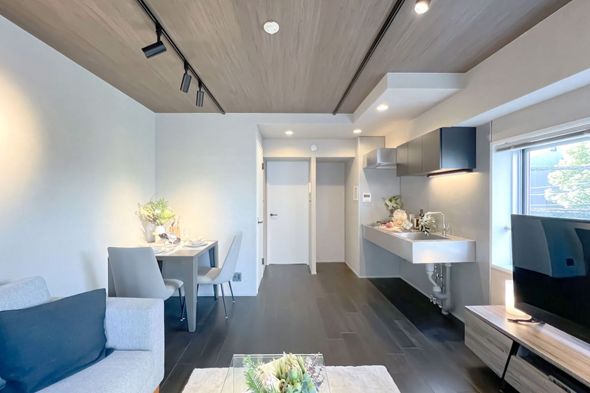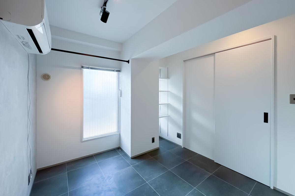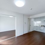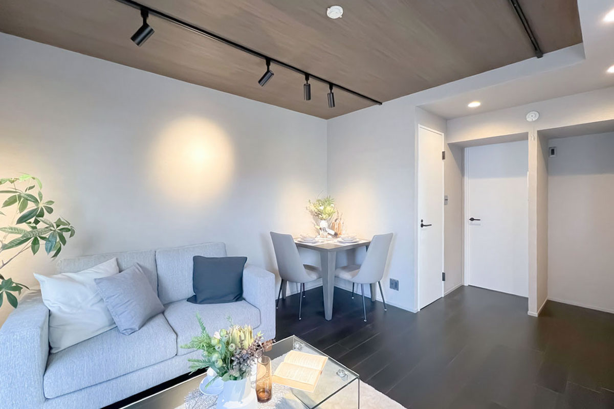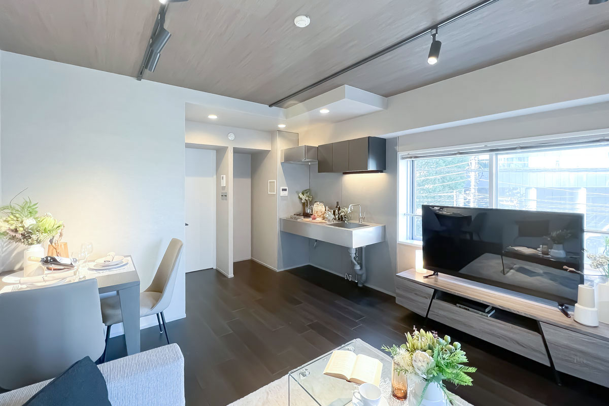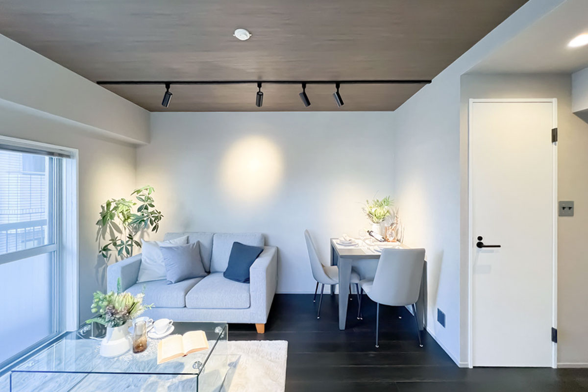 室内はリフォーム済み。黒やダークブラウンなどのシックな色が基調となったデザイナーズのような内装でした。設備としては、モダンスタイルなキッチン、浴室乾燥機能付きのバスルームなどの、生活を便利に過ごす機能は備わっています。洋室には室内干しができるポールが設置され、クローゼットは廊下、室内がすっきりするような設計になっていました。