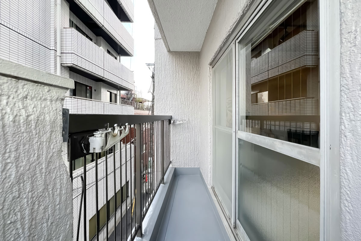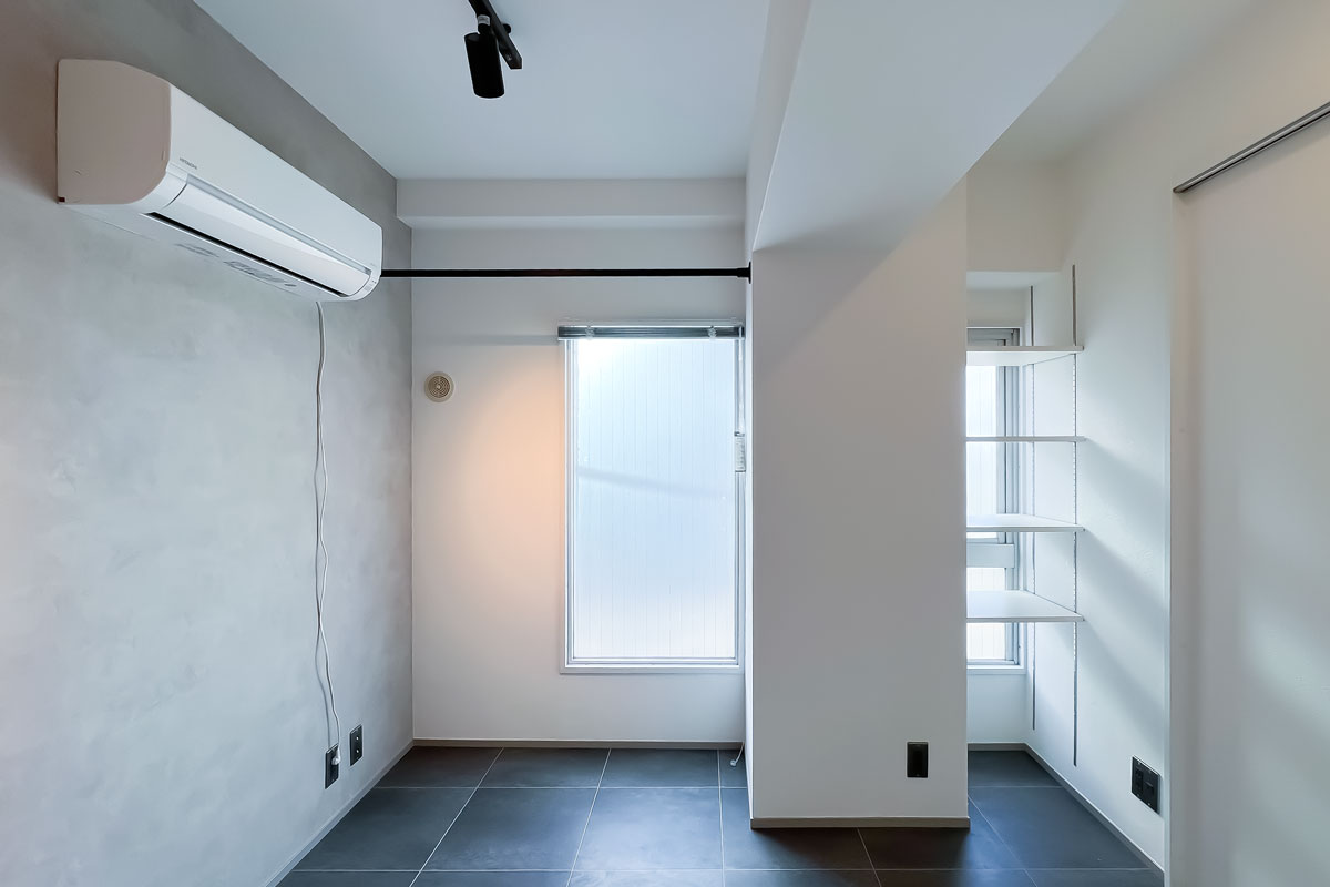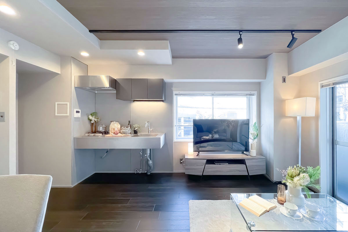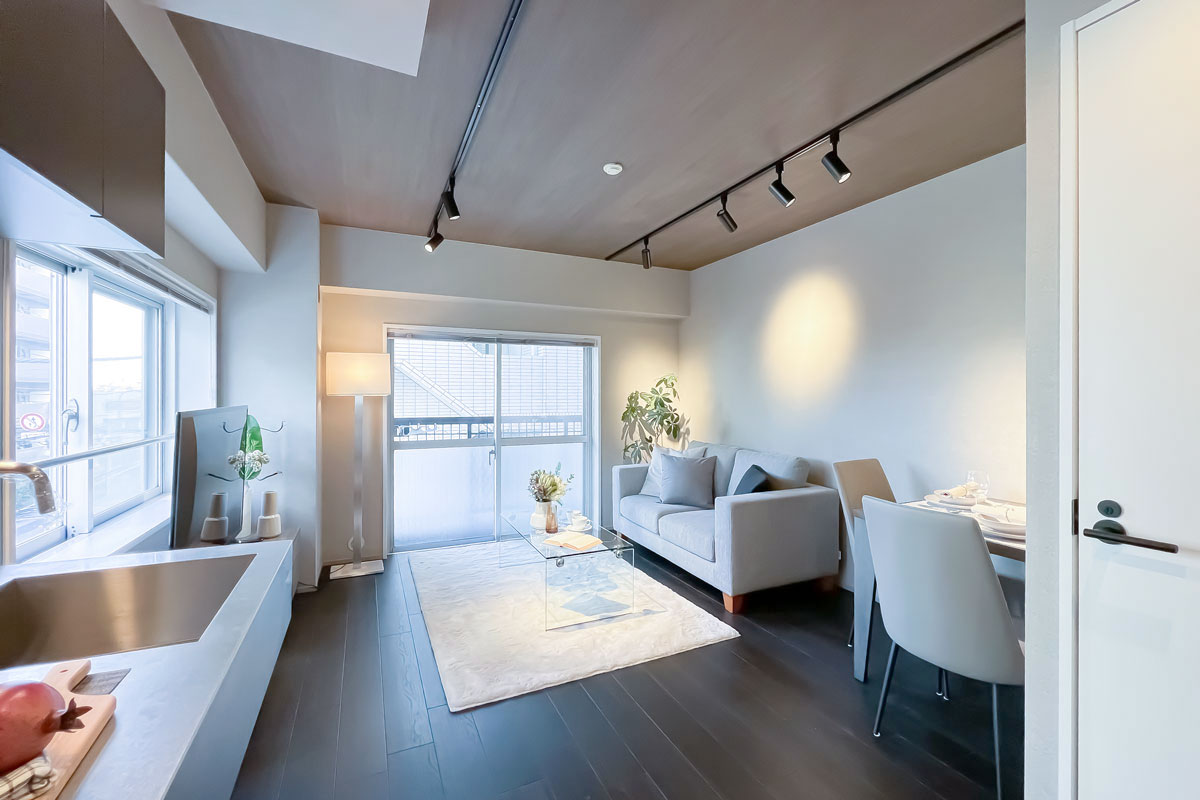 室内はリフォーム済み。黒やダークブラウンなどのシックな色が基調となったデザイナーズのような内装でした。設備としては、モダンスタイルなキッチン、浴室乾燥機能付きのバスルームなどの、生活を便利に過ごす機能は備わっています。洋室には室内干しができるポールが設置され、クローゼットは廊下、室内がすっきりするような設計になっていました。