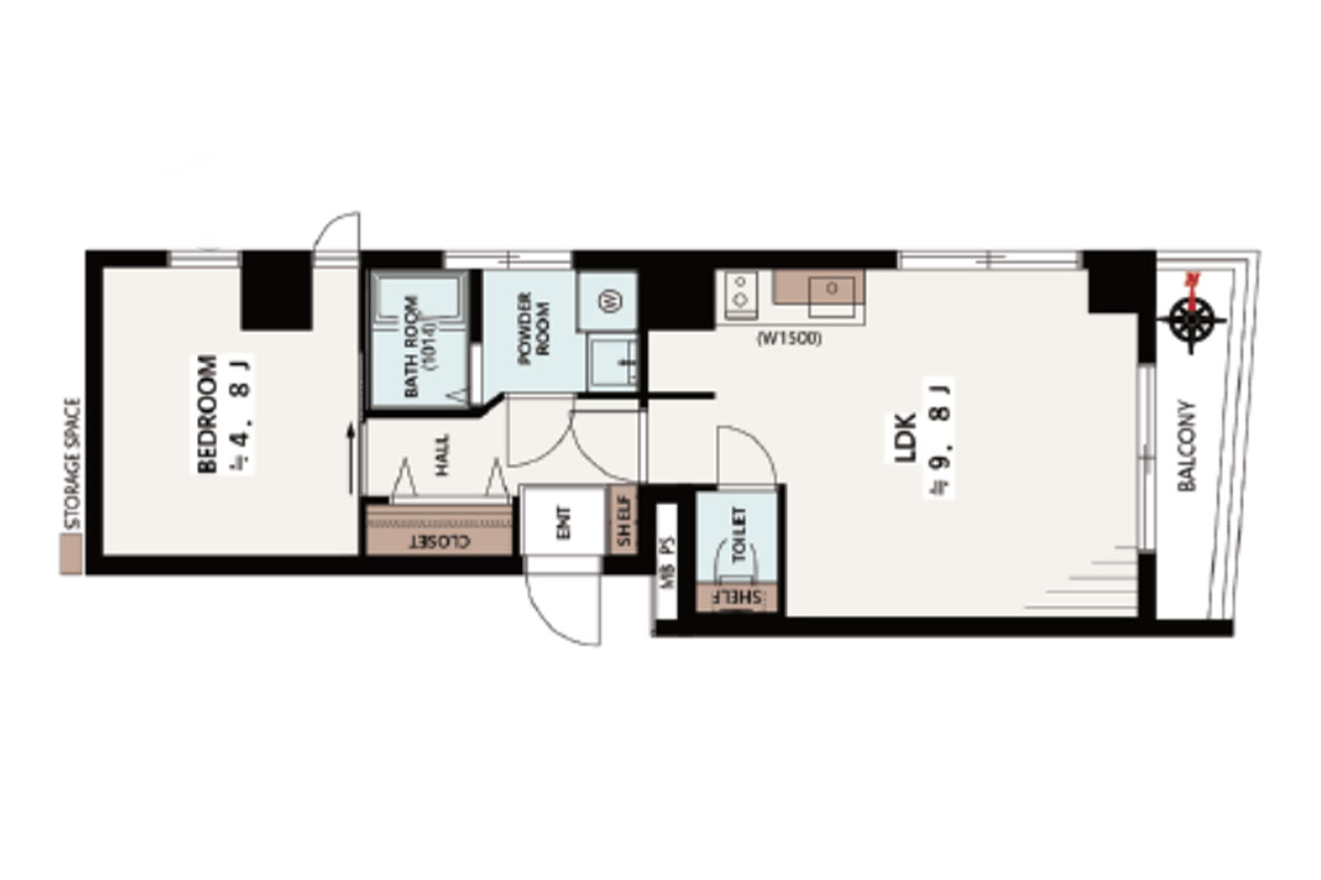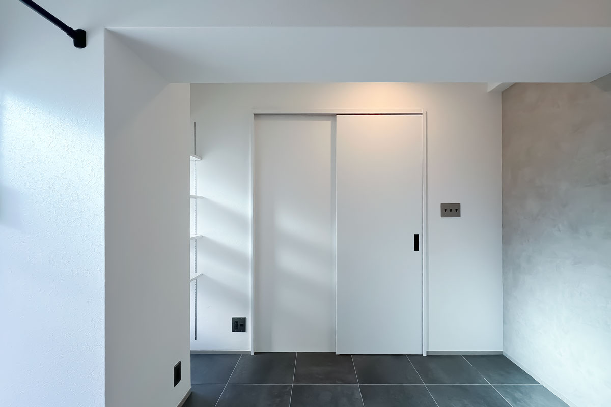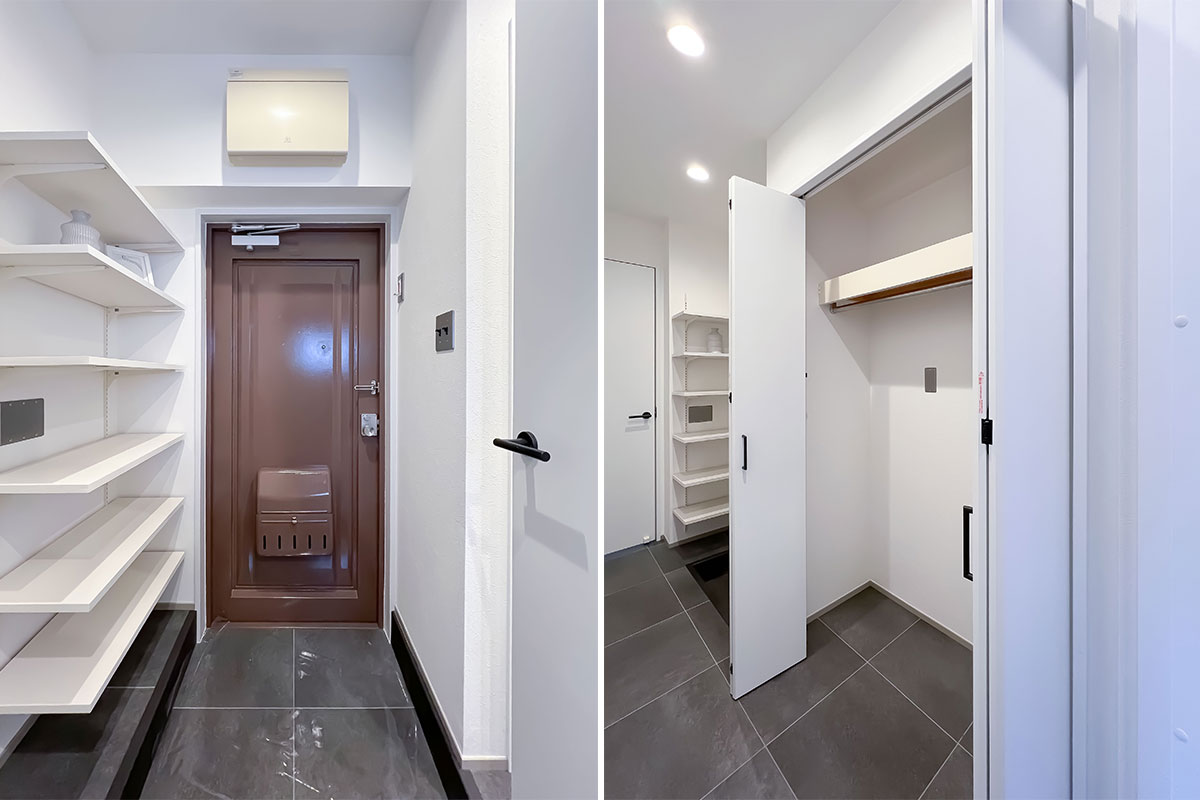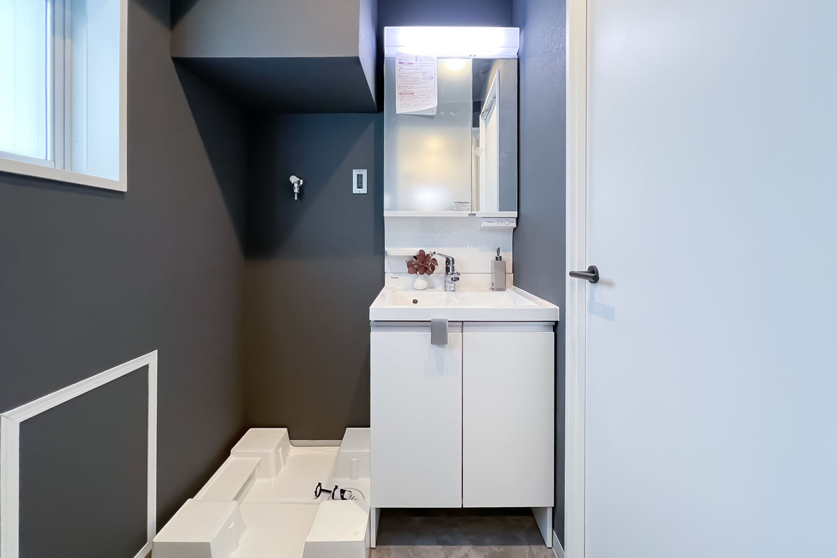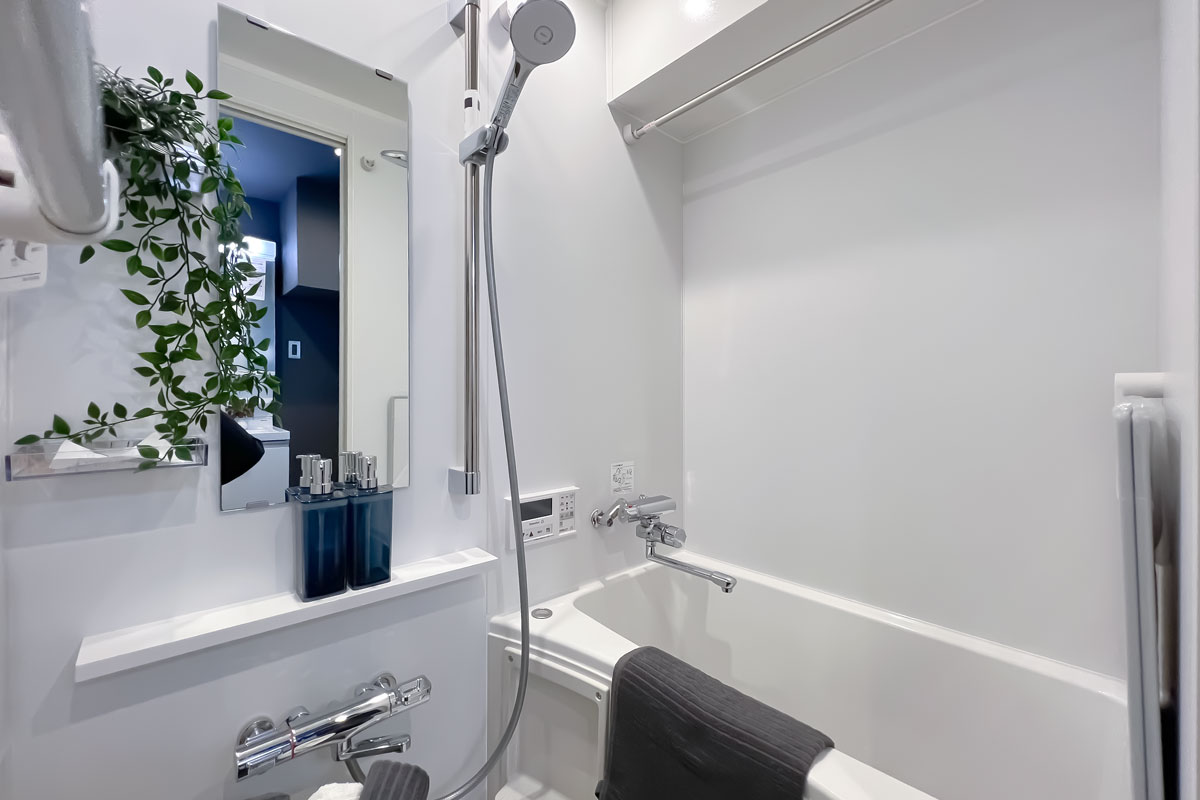 室内はリフォーム済み。黒やダークブラウンなどのシックな色が基調となったデザイナーズのような内装でした。設備としては、モダンスタイルなキッチン、浴室乾燥機能付きのバスルームなどの、生活を便利に過ごす機能は備わっています。洋室には室内干しができるポールが設置され、クローゼットは廊下、室内がすっきりするような設計になっていました。