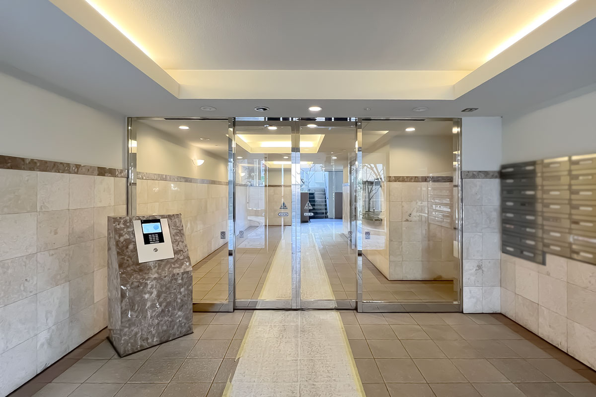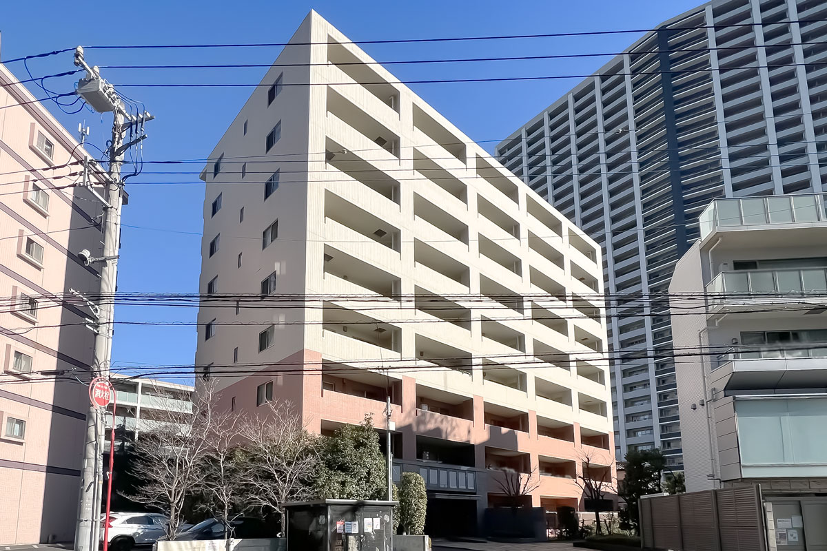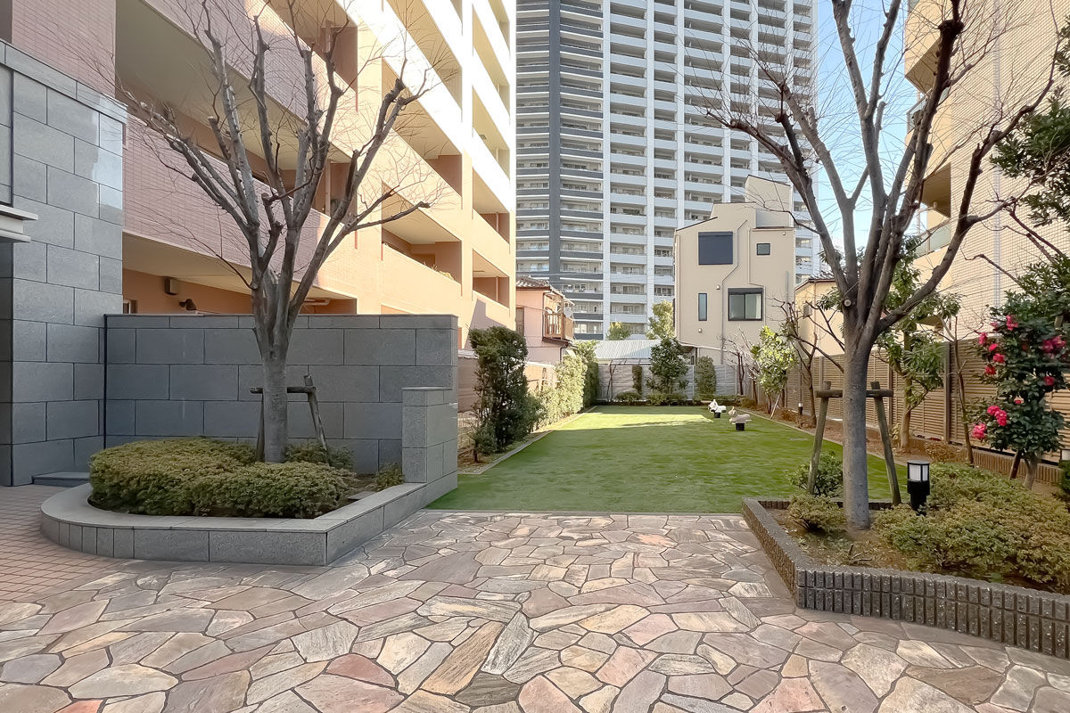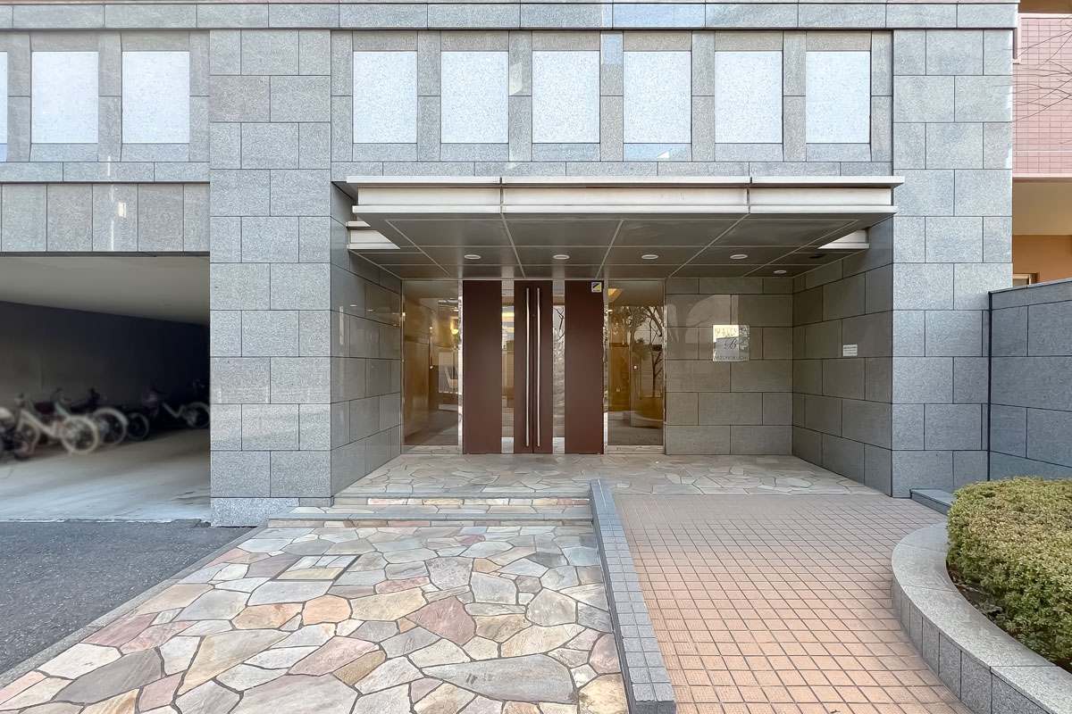 マンションへは、駅を出て南武線沿いを武蔵小杉方面に向かって約12分歩くと到着です。エントランスが少し奥まっているので気づきにくいのですが、前面道路と距離があると、小さなお子さんがいるご家庭では送り出すときの不安が少し和らぎます。