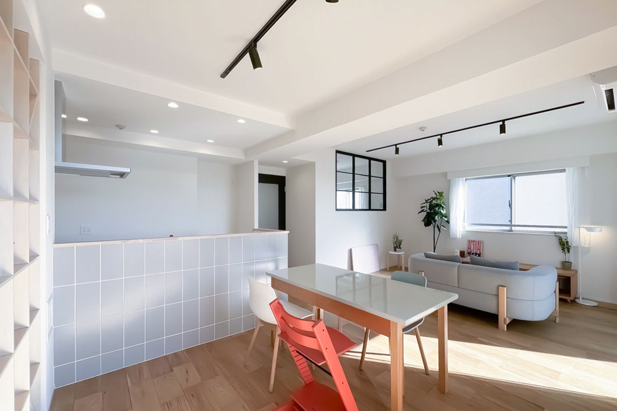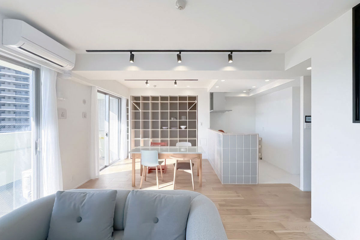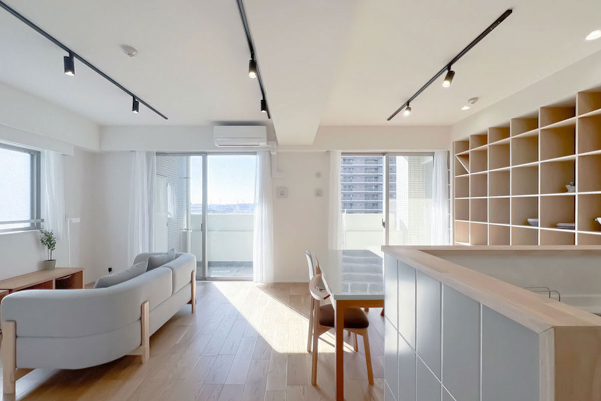 室内はリノベーションが施されていて、LDK部分には壁一面の大型オープン書棚。お気に入りの雑貨や写真を飾ったり、本をたくさん置いてミニ図書館のようにするのもいいですね。インテリアを考えるのが楽しくなります。