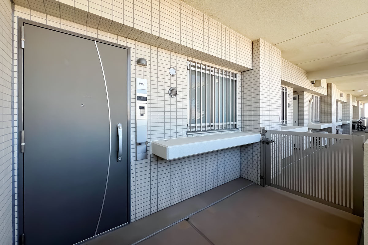 今回ご紹介のお部屋は最上階の9階。玄関前にはポーチがついていて特別感があります。
