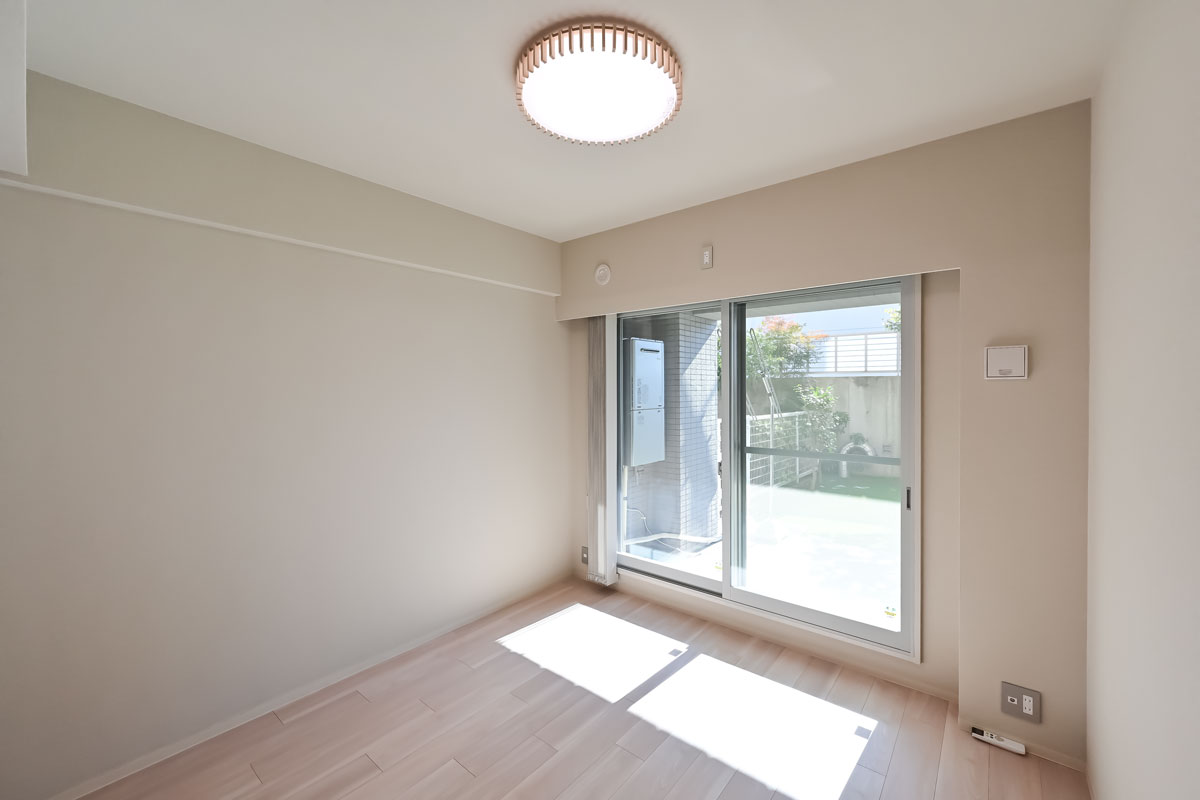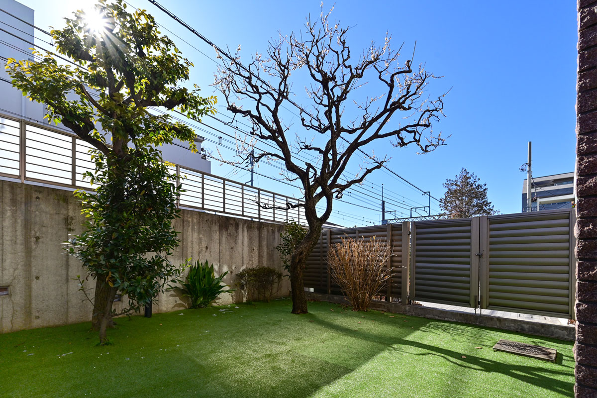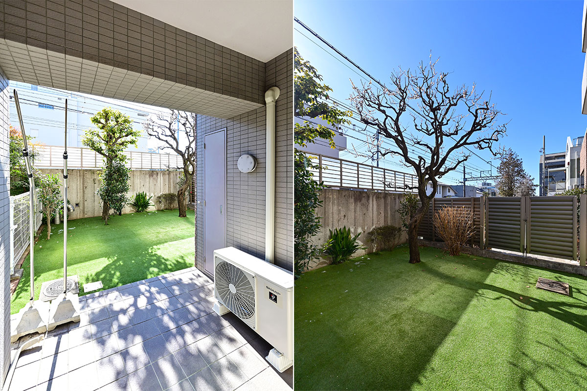 お部屋は1階、約33㎡の専用庭付きです。前の建物と距離があるので日当たりが良く、新しく人工芝を設置しているためお手入れも簡単です。