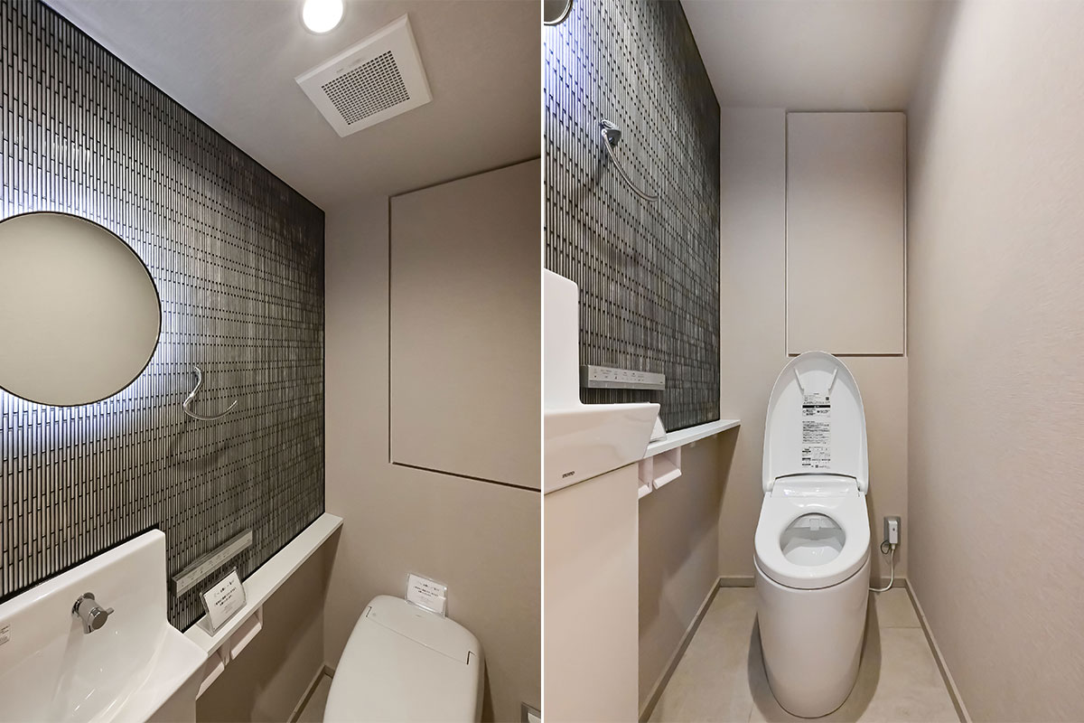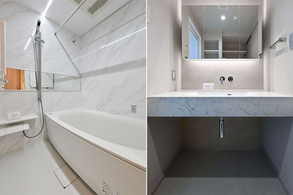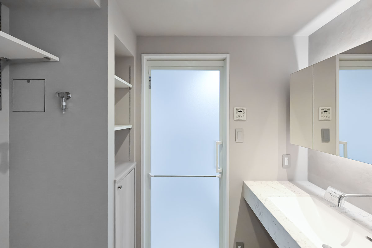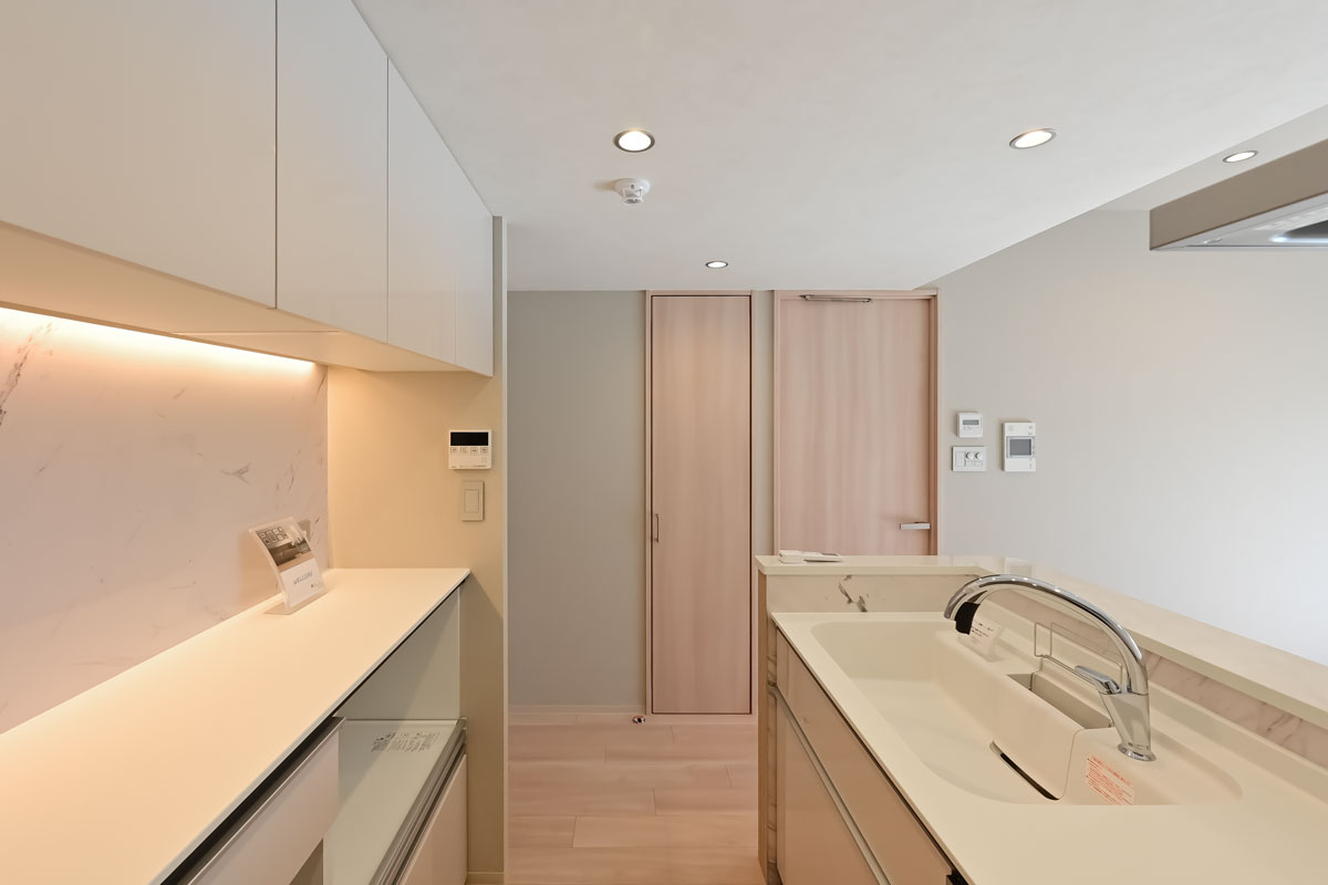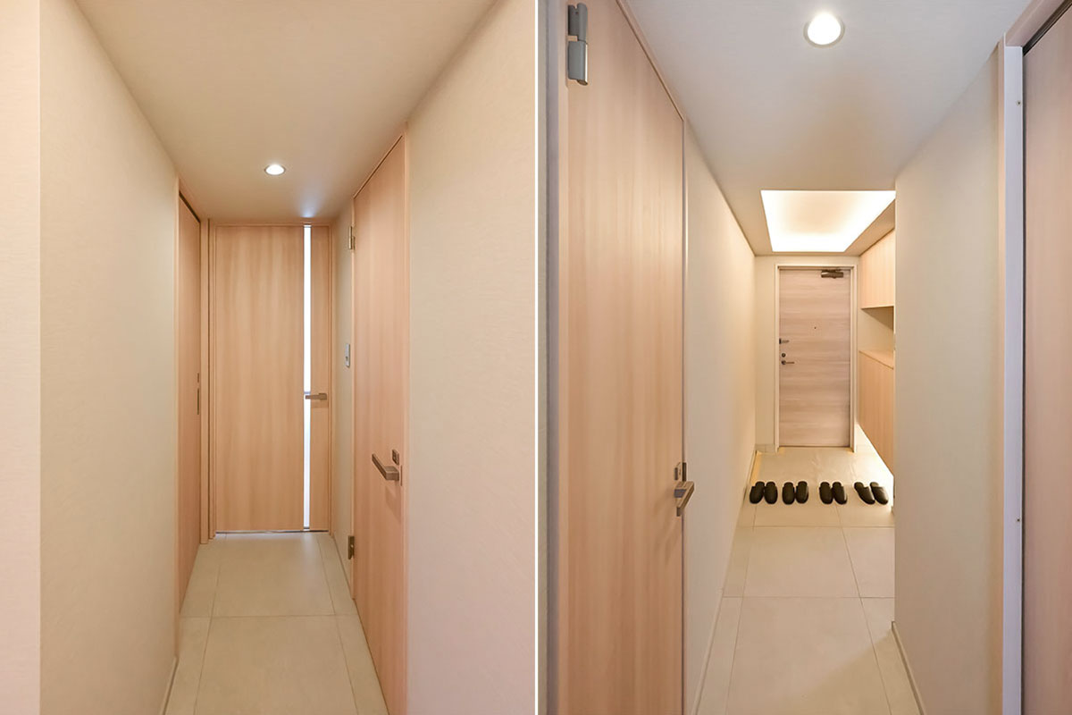 広々としたエントランスは、照明を抑えて自然光を効果的に取り込み、高級感を一層引き立てています。
