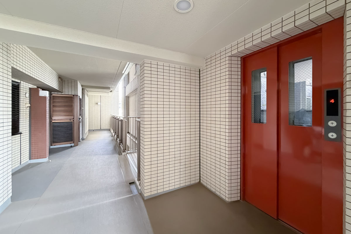 ご紹介のお部屋は4階、エントランスから一番近いエレベーターで上がります。