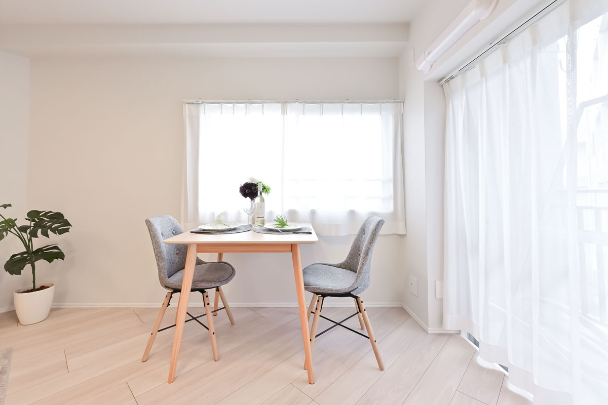 お部屋は2階の1LDK、バルコニーは南向き。隣接する建物と距離が取れているので、圧迫感はなく、自然光も入ります。