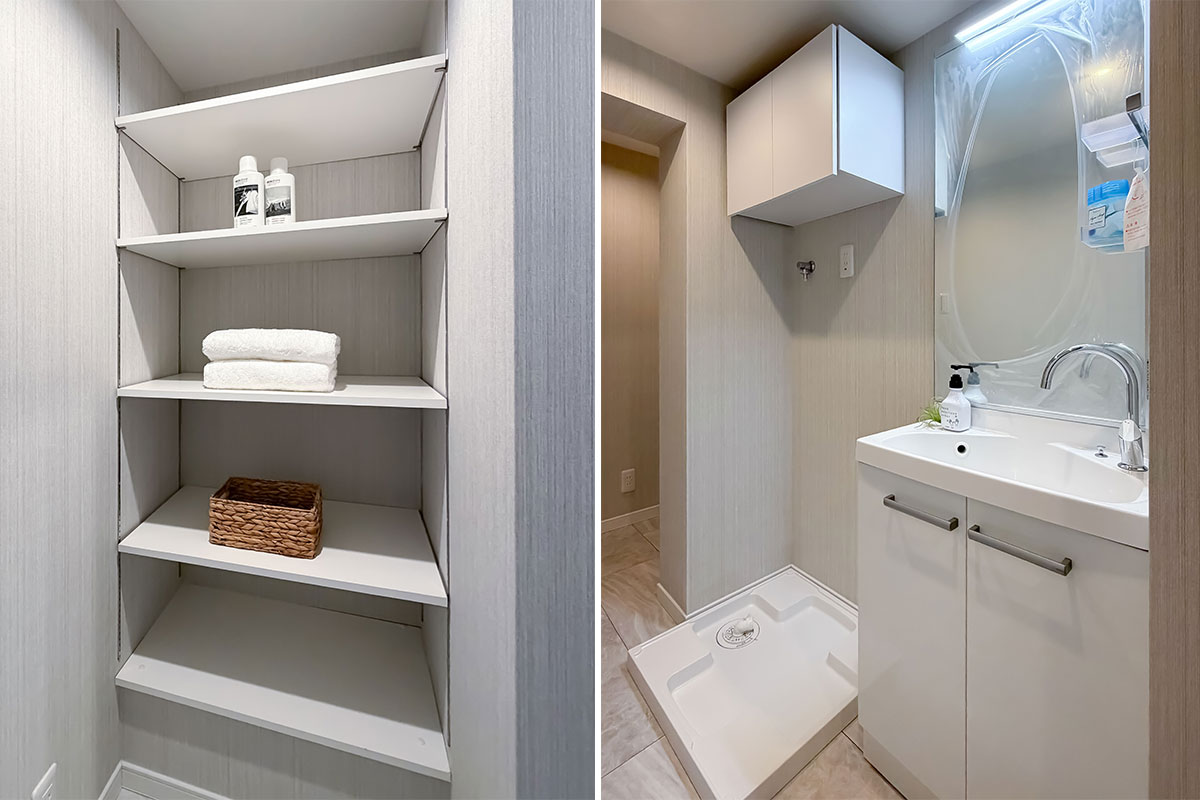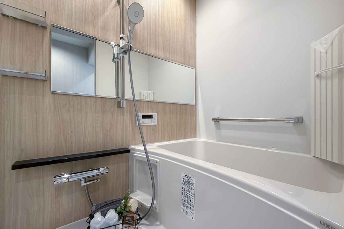 設備は、システムキッチン、追焚・浴室換気乾燥機がついたユニットバスなど、生活を便利にしてくれる機能が整っていました。LDKにエアコンがすでに1台設置されているのも、新生活にはうれしいですね。