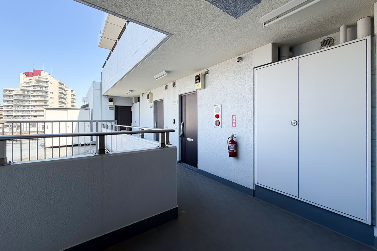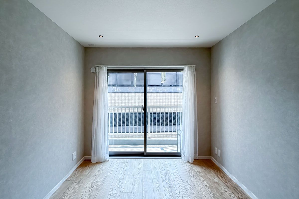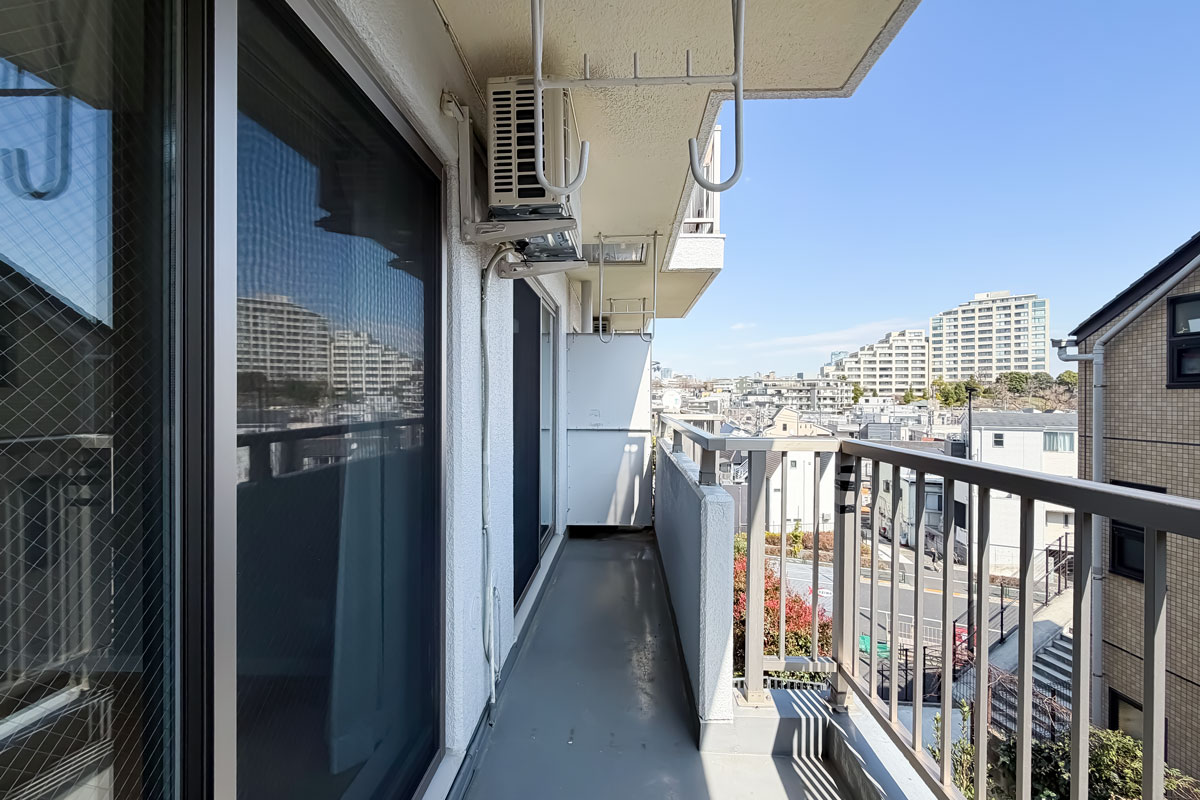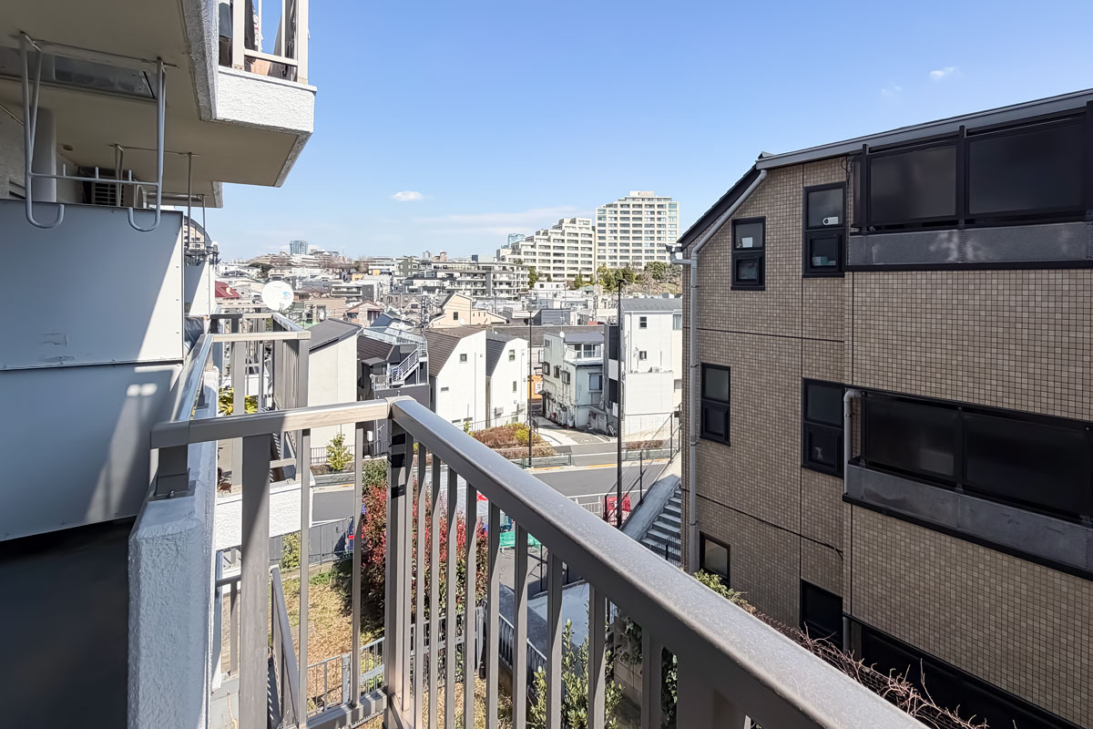 ご紹介のお部屋は3階、間取りは48.50㎡の1LDK。単身あるいはお二人暮らしにぴったりのサイズです。バルコニーからの眺望は、視界は限られてしまいますが、遠くの建物まで見ることができました。